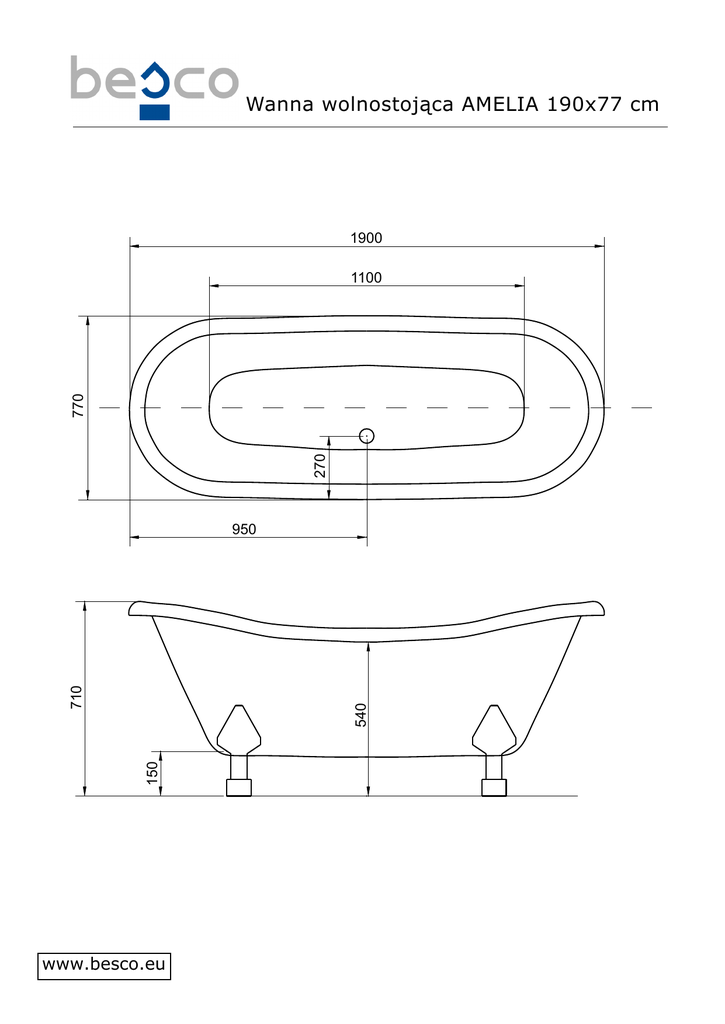 Wanna wolnostojąca AMELIA 190x77 cm 1900 270 770 1100 150 540 710 950 www.besco.eu