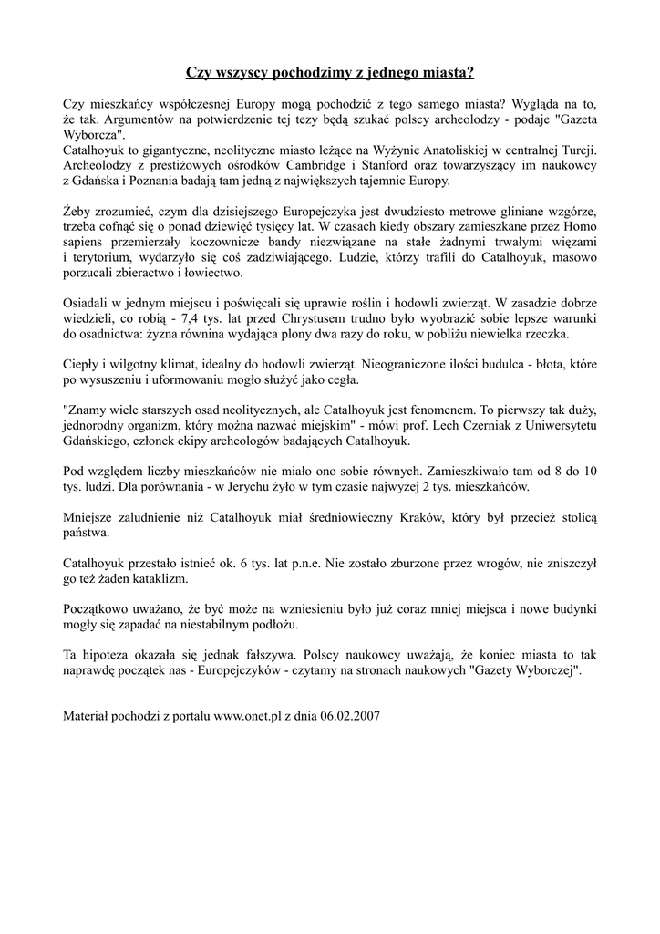 Czy wszyscy pochodzimy z jednego miasta? Czy mieszkańcy współczesnej Europy mogą pochodzić z tego samego miasta? Wygląda na to, że tak. Argumentów na potwierdzenie tej tezy będą szukać polscy archeolodzy - podaje "Gazeta Wyborcza". Catalhoyuk to gigantyczne, neolityczne miasto leżące na Wyżynie Anatoliskiej w centralnej Turcji. Archeolodzy z prestiżowych ośrodków Cambridge i Stanford oraz towarzyszący im naukowcy z Gdańska i Poznania badają tam jedną z największych tajemnic Europy. Żeby zrozumieć, czym dla dzisiejszego Europejczyka jest dwudziesto metrowe gliniane wzgórze, trzeba cofnąć się o ponad dziewięć tysięcy lat. W czasach kiedy obszary zamieszkane przez Homo sapiens przemierzały koczownicze bandy niezwiązane na stałe żadnymi trwałymi więzami i terytorium, wydarzyło się coś zadziwiającego. Ludzie, którzy trafili do Catalhoyuk, masowo porzucali zbieractwo i łowiectwo. Osiadali w jednym miejscu i poświęcali się uprawie roślin i hodowli zwierząt. W zasadzie dobrze wiedzieli, co robią - 7,4 tys. lat przed Chrystusem trudno było wyobrazić sobie lepsze warunki do osadnictwa: żyzna równina wydająca plony dwa razy do roku, w pobliżu niewielka rzeczka. Ciepły i wilgotny klimat, idealny do hodowli zwierząt. Nieograniczone ilości budulca - błota, które po wysuszeniu i uformowaniu mogło służyć jako cegła. "Znamy wiele starszych osad neolitycznych, ale Catalhoyuk jest fenomenem. To pierwszy tak duży, jednorodny organizm, który można nazwać miejskim" - mówi prof. Lech Czerniak z Uniwersytetu Gdańskiego, członek ekipy archeologów badających Catalhoyuk. Pod względem liczby mieszkańców nie miało ono sobie równych. Zamieszkiwało tam od 8 do 10 tys. ludzi. Dla porównania - w Jerychu żyło w tym czasie najwyżej 2 tys. mieszkańców. Mniejsze zaludnienie niż Catalhoyuk miał średniowieczny Kraków, który był przecież stolicą państwa. Catalhoyuk przestało istnieć ok. 6 tys. lat p.n.e. Nie zostało zburzone przez wrogów, nie zniszczył go też żaden kataklizm. Początkowo uważano, że być może na wzniesieniu było już coraz mniej miejsca i nowe budynki mogły się zapadać na niestabilnym podłożu. Ta hipoteza okazała się jednak fałszywa. Polscy naukowcy uważają, że koniec miasta to tak naprawdę początek nas - Europejczyków - czytamy na stronach naukowych "Gazety Wyborczej". Materiał pochodzi z portalu www.onet.pl z dnia 06.02.2007