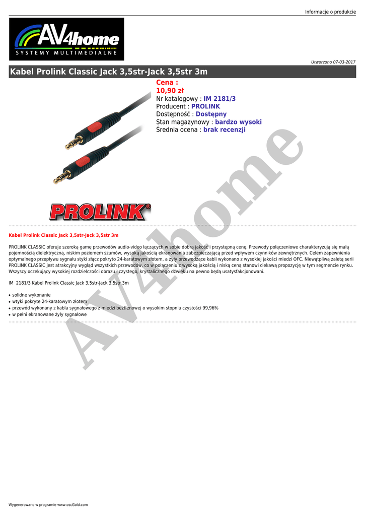 Informacje o produkcie Utworzono 07-03-2017 Kabel Prolink Classic Jack 3,5str-Jack 3,5str 3m Cena : 10,90 zł Kabel Prolink Classic Jack 3,5str-Jack 3,5str 3m om e Nr katalogowy : IM 2181/3 Producent : PROLINK Dostępność : Dostępny Stan magazynowy : bardzo wysoki Średnia ocena : brak recenzji 4h PROLINK CLASSIC oferuje szeroką gamę przewodów audio-video łączących w sobie dobrą jakość i przystępną cenę. Przewody połączeniowe charakteryzują się małą pojemnością dielektryczną, niskim poziomem szumów, wysoką jakością ekranowania zabezpieczającą przed wpływem czynników zewnętrznych. Celem zapewnienia optymalnego przepływu sygnału styki złącz pokryto 24-karatowym złotem, a żyły przewodzące kabli wykonano z wysokiej jakości miedzi OFC. Niewątpliwą zaletą serii PROLINK CLASSIC jest atrakcyjny wygląd wszystkich przewodów, co w połączeniu z wysoką jakością i niską ceną stanowi ciekawą propozycję w tym segmencie rynku. Wszyscy oczekujący wysokiej rozdzielczości obrazu i czystego, krystalicznego dźwięku na pewno będą usatysfakcjonowani. IM 2181/3 Kabel Prolink Classic Jack 3,5str-Jack 3,5str 3m ● ● ● solidne wykonanie wtyki pokryte 24-karatowym złotem przewód wykonany z kabla sygnałowego z miedzi beztlenowej o wysokim stopniu czystości 99,96% w pełni ekranowane żyły sygnałowe AV ● Wygenerowano w programie www.oscGold.com