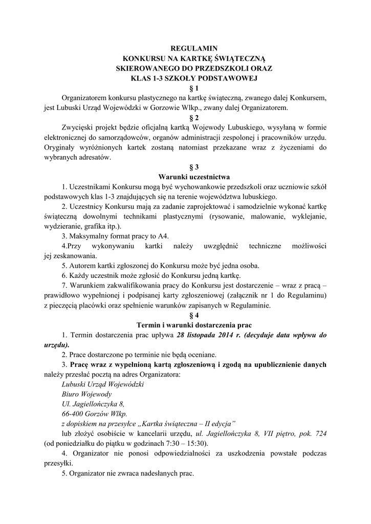 REGULAMIN KONKURSU NA KARTKĘ ŚWIĄTECZNĄ SKIEROWANEGO DO PRZEDSZKOLI ORAZ KLAS 1-3 SZKOŁY PODSTAWOWEJ §1 Organizatorem konkursu plastycznego na kartkę świąteczną, zwanego dalej Konkursem, jest Lubuski Urząd Wojewódzki w Gorzowie Wlkp., zwany dalej Organizatorem. §2 Zwycięski projekt będzie oficjalną kartką Wojewody Lubuskiego, wysyłaną w formie elektronicznej do samorządowców, organów administracji zespolonej i pracowników urzędu. Oryginały wyróżnionych kartek zostaną natomiast przekazane wraz z życzeniami do wybranych adresatów. §3 Warunki uczestnictwa 1. Uczestnikami Konkursu mogą być wychowankowie przedszkoli oraz uczniowie szkół podstawowych klas 1-3 znajdujących się na terenie województwa lubuskiego. 2. Uczestnicy Konkursu mają za zadanie zaprojektować i samodzielnie wykonać kartkę świąteczną dowolnymi technikami plastycznymi (rysowanie, malowanie, wyklejanie, wydzieranie, grafika itp.). 3. Maksymalny format pracy to A4. 4.Przy wykonywaniu kartki należy uwzględnić techniczne możliwości jej zeskanowania. 5. Autorem kartki zgłoszonej do Konkursu może być jedna osoba. 6. Każdy uczestnik może zgłosić do Konkursu jedną kartkę. 7. Warunkiem zakwalifikowania pracy do Konkursu jest dostarczenie – wraz z pracą – prawidłowo wypełnionej i podpisanej karty zgłoszeniowej (załącznik nr 1 do Regulaminu) z pieczęcią placówki oraz spełnienie warunków zapisanych w Regulaminie. §4 Termin i warunki dostarczenia prac 1. Termin dostarczenia prac upływa 28 listopada 2014 r. (decyduje data wpływu do urzędu). 2. Prace dostarczone po terminie nie będą oceniane. 3. Pracę wraz z wypełnioną kartą zgłoszeniową i zgodą na upublicznienie danych należy przesłać pocztą na adres Organizatora: Lubuski Urząd Wojewódzki Biuro Wojewody Ul. Jagiellończyka 8, 66-400 Gorzów Wlkp. z dopiskiem na przesyłce „Kartka świąteczna – II edycja” lub złożyć osobiście w kancelarii urzędu, ul. Jagiellończyka 8, VII piętro, pok. 724 (od poniedziałku do piątku w godzinach 7:30 – 15:30). 4. Organizator nie ponosi odpowiedzialności za uszkodzenia powstałe podczas przesyłki. 5. Organizator nie zwraca nadesłanych prac. §5 Zasady przyznawania nagród 1. Rozstrzygnięcie Konkursu nastąpi do 5 grudnia 2014r., a wyniki zostaną podane do wiadomości publicznej na stronie internetowej Organizatora www.lubuskie.uw.gov.pl oraz wysłane do mediów lokalnych – z poszanowaniem ochrony dóbr osobistych dziecka. 2. O wyłonieniu zwycięzców Konkursu decyduje powołana w tym celu Komisja Konkursowa, zwana dalej Komisją. 3. Komisję powołuje Organizator. W jej skład wchodzą przedstawiciele Lubuskiego Urzędu Wojewódzkiego w Gorzowie Wlkp. 4. Decyzje Komisji są ostateczne i nieodwołalne. 5. Prace niespełniające warunków regulaminowych nie będą oceniane przez Komisję. 6. Spośród zakwalifikowanych do Konkursu prac Komisja wybierze zwycięską kartkę. 7. Autor nagrodzonej pracy otrzyma od Organizatora indywidualną nagrodę rzeczową. 8. Organizator może przyznać dodatkowe wyróżnienia dla autorów kartek, które według Komisji odznaczają się szczególnymi walorami artystycznymi. 9. Autor zwycięskiej kartki oraz placówka, której jest podopiecznym, zostaną telefonicznie powiadomieni o przyznaniu nagrody. 10. Nagrody dla placówki oraz autora zwycięskiej kartki zostaną wręczone po ustaleniu dogodnego terminu dla wszystkich stron. §6 Ustalenia dodatkowe 1. Autorzy prac przenoszą na Organizatora nieograniczone prawa autorskie do swoich prac. W tym celu uczestnik składa stosowne oświadczenie, podpisane również przez rodzica lub opiekuna prawnego, zamieszczone na karcie zgłoszeniowej. 2. Organizator zastrzega sobie prawo do wykorzystania w materiałach edukacyjnych, informacyjnych i promocyjnych wszystkich prac nadesłanych do Konkursu. 3. Niniejszy Regulamin jest jedynym dokumentem określającym zasady Konkursu. 4. Wszelkie sprawy nieuregulowane niniejszym Regulaminem rozstrzyga Organizator.