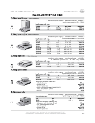 LUBELSKIE FABRYKI WAG FAWAG S.A. cennik wyrobów 1/2010 I WAGI LABORATORYJNE ONYX 1. Wagi analityczne - I klasa dokładności • monolityczny system wagowy • wewnętrzna kalibracja • protokół GLP • podświetlany wyświetlacz LCD • RS-232 Legalizacja w cenie wagi. Typ wagi Max d Wym. szalki Cena netto z³ OX-120 OX-220 120 g 220 g 0,0001 g 0,0001 g ∅ 90 mm ∅ 90 mm 4.220,oo 4.420,oo 2. Wagi precyzyjne - II klasa dokładności • monolityczny system wagowy • wewnętrzna kalibracja • protokół GLP • podświetlany wyświetlacz LCD • RS-232 Legalizacja w cenie wagi. Typ wagi Max d Wym. szalki OX-310 OX-410 OX-610 OX-2100 OX-3100 OX-6100 OX-8100 310 g 410 g 610 g 2100 g 3100 g 6100 g 8100 g 0,001 g 0,001 g 0,001 g 0,01 g 0,01 g 0,01 g 0,1 g ∅ 115 mm ∅ 115 mm ∅ 115 mm 180 x 180 mm 180 x 180 mm 180 x 180 mm 180 x 180 mm Cena netto z³ 3.445,oo 3.645,oo 3.745,oo 3.445,oo 3.545,oo 3.845,oo 3.495,oo 3. Wagi apteczne - II klasa dokładności • monolityczny system wagowy • wewnętrzna kalibracja • protokół GLP • podświetlany wyświetlacz LCD • RS-232 • funkcja receptury Legalizacja w cenie wagi. Typ wagi Max d Wym. szalki OX-310 OX-2100 310 g 2100 g 0,001 g 0,01 g ∅ 115 mm 180 x 180 mm Cena netto z³ 3.445,oo 3.445,oo 4. Wagi jubilerskie • monolityczny system wagowy • wewnętrzna kalibracja • protokół GLP • podświetlany wyświetlacz LCD • RS-232 Legalizacja w cenie wagi. 5. Wagosuszarka Typ wagi Max d Wym. szalki OX-310 OX-2100 310 g 2100 g 0,001 g 0,01 g ∅ 115 mm 180 x 180 mm Wyposażenie dodatkowe do wag ONYX: – stół antywibracyjny – drukarka KAFKA – drukarka legalizowana – program do transmisji danych FAWAGCONNECT – zestaw do wyznaczania gęstości – kabel RS Cena netto z³ 3.445,oo 3.445,oo 990,oo od 720,oo 2.714,oo 400,oo 2.340,oo 30,oo • monolityczny system wagowy • wewnętrzna kalibracja • protokół GLP • podświetlany wyświetlacz LCD • RS-232 Waga nielegalizowana. Typ Max OX-35 35 g Wyposażenie dodatkowe do wagosuszarki: – jednorazowe szalki aluminiowe (80 szt.) – filtry z włókna szklanego (80 szt.) – aluminiowy panel – drukarka KAFKA – drukarka legalizowana System jakoœci potwierdzony certyfikatem ISO 9001 zgodnie z procedur¹ TÜV CERT. Obs³uga klientów za poœrednictwem sieci handlowo-serwisowej na terenie ca³ego kraju. d 0,001 g Cena netto z³ 5.965,oo 109,oo 99,oo 235,oo od 720,oo 2.712,oo 3/22 cennik wyrobów 1/2010 LUBELSKIE FABRYKI WAG FAWAG S.A. II WAGI SKLEPOWE 1. Wagi kalkulacyjne AMBER EURO / AGAT EURO • dwuwalutowoœæ (PLN i EURO) • RS-232 • zasilanie sieciowe, bateryjne* i akumulatorowe* • 250 PLU • 20 PLU szybkiego wyboru • 2 wyœwietlacze masy, ceny i nale¿noœci • wspó³praca z kasami fiskalnymi Legalizacja w cenie wagi. * baterie i akumulatory nie wystêpuj¹ w wyposa¿eniu standardowym wag Typ wagi AGAT EURO AGAT EURO (2-zakresowy) AGAT EURO LCD AMBER EURO AMBER EURO (2-zakresowy) AMBER EURO AGAT EURO Max / e=d Wym. szalki 15 kg / 5g 6/15 kg / 2/5g 15 kg / 5g 15 kg / 5g 6/15 kg / 2/5g 235x342 mm 235x342 mm 235x342 mm 235x342 mm 235x342 mm Akumulator do wag AMBER EURO i AGAT EURO dop³ata Cena netto z³ 1.090,oo 1.140,oo 1.140,oo 1.140,oo 1.180,oo 40,oo 2. Wagi bez funkcji kalkulacyjnych • 2 wyœwietlacze masy LED – 14mm (od strony klienta i sprzedawcy) • RS-232 • wspó³praca z kasami fiskalnymi, m.in.: ELZAB, OPTIMUS, SHARP Legalizacja w cenie wagi. Typ wagi TURKUS-2 TURKUS-2 (2-zakresowy) OPAL-1 OPAL-2 TURKUS-2 Max / e=d Wym. szalki 15 kg / 5g 6/15 kg / 2/5g 15 kg / 5g 15 kg / 5g 235x342 mm 235x342 mm 240x260 mm ∅ 270 mm dop³ata 920,oo 950,oo 890,oo 890,oo 40,oo dop³ata dop³ata 200,oo 50,oo Akumulator do wag TURKUS 2 Cena netto z³ Opcje do wag OPAL 1 i OPAL 2 OPAL-1 – wersja sieciowa wagi z interfejsem RS-485 (protokó³ RTU) – PT w. 1 (WIN) – program komputerowy do obs³ugi sieci wag OPAL-2 3. Wagi pomostowe • wyœwietlacz masy LED – 14mm • RS-232 • funkcja liczenia sztuk • miernik na kolumnie • blacha pomostu nierdzewna Legalizacja w cenie wagi. Typ wagi RUBIN 60 RUBIN 150 RUBIN 4. Wagi do boksów kasowych NOWOŒ Max / e=d Pomost (mm) 60 kg / 20g 150 kg / 50g 450x400 450x400 Cena netto z³ 1.250,oo 1.250,oo Æ • podświetlany wyświetlacz LCD • wyjście USB lub RS-232 • pełni podwójną funkcję – wagi oraz skanera • blacha pomostu nierdzewna Legalizacja w cenie wagi. 4/22 Typ wagi Max / e=d Pomost (mm) PM-15/BK 15 kg / 5g 295x295 System jakoœci potwierdzony certyfikatem ISO 9001 zgodnie z procedur¹ TÜV CERT. Obs³uga klientów za poœrednictwem sieci handlowo-serwisowej na terenie ca³ego kraju. Cena netto z³ 1.740,oo LUBELSKIE FABRYKI WAG FAWAG S.A. cennik wyrobów 1/2010 III WAGI OSOBOWO-LEKARSKIE I NIEMOWLÊCE Legalizacja w cenie wagi. Typ wagi Max / e=d WPL 150 Cena netto z³ 150 kg / 100 g 1.700,oo 150 kg / 50 g 1.100,oo 150 kg / 50 g 1.100,oo 200 kg / 100 g 1.150,oo 200 kg / 100 g 1.150,oo 150 kg / 50 g 1.350,oo 200 kg / 100 g 1.390,oo mechaniczna ze wzrostomierzem (min.1m, max.2m) TP 150-WTL II D elektroniczna bez wzrostomierza, miernik mocowany do pomostu TP 150-WTL II B elektroniczna bez wzrostomierza, miernik na kablu TP 200-WTL II D elektroniczna bez wzrostomierza, miernik mocowany do pomostu TP 200-WTL II B elektroniczna bez wzrostomierza, miernik na kablu TP150-WTL II AW elektroniczna ze wzrostomierzem (min.1m, max.2m) TP 200-WTL II AW elektroniczna ze wzrostomierzem (min.1m, max.2m) WTL II wersja AW BOBAS 2 15 kg / 5 g 840,oo elektroniczna do ważenia niemowląt WPL BOBAS 2 IV WAGI POCZTOWE 1. Wagi listowe WTL II wersja D • wspó³praca z systemem „POCZTA” • RS-232 • dwa wyœwietlacze masy LED Legalizacja w cenie wagi. Typ wagi Max / e=d Wym. szalki [mm] TP-2/1 2000 g / 1g 166x234 2. Wagi paczkowe Cena netto z³ 890,oo • dwa wyœwietlacze masy LED Legalizacja w cenie wagi. Typ wagi Max / e=d Pomost [mm] TP-30/1 TP-50/1 TP-60/1 30 kg / 10g 50 kg / 20g 60 kg / 20g 400x400 400x400