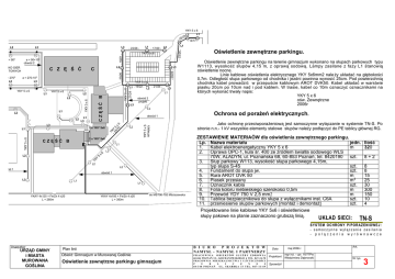 YKY 5 x 6 L1 L3 - 14/17 L2 L3 L3 - 23/26 - L1 L1 - 17/20 - L2 Oś wietlenie zewnę trzne parkingu. YKY 5 x 6 a= 900 90+100 a= obwó d 2 C Z Ę BOISKO GIER SPORTOWYCH a = 2700 L2 Ś Ć L2 C L1 a = 270-100 L3 YKY 5 x 6 L1 - 19/22 - L2 - 21/24 - YKY 5 x 6 L1 YKY 5 x 6 L3 L1 L2 L3 obwó d 2 projekt L3 L3 L1 L2 Oś wietlenie zewnę trzne parkingu na terenie gimnazjum wykonano na słupach parkowych typu W1113, wysokoś ć słupó w 4,15 m, z oprawą sodową. Lampy zasilane z fazy L1 stanowią oś wietlenie nocne. Linie kablowe oś wietlenia elektrycznego YKY 5x6mm2 nale ż y układać na głę bokoś ci 0,7m. Odległoś ć słupa parkowego od chodnika i jezdni powinna wynosić 25cm. Pod powierzchnią chodnika kabel prowadzić w przepuś cie kablowym AROT DVK50. Kabel układać w warstwie piasku 20cm po 10cm nad i pod kablem. W trasie, kabel co 10m oznaczyć oznacznikami na któ rych wykonać trwały napis: YKY 5 x 6 oś w. Zewnę trzne 2006r L2 obwó d 1 L1 L3 L3 Jako ochronę przeciwporaż eniową jest samoczynne wyłączanie w systemie TN-S. Po stronie n.n.- 1 kV wszystkie elementy stalowe słupó w należ y podłączyć do PE tablicy głó wnej RG. L2 5 x YKY 5x6 L1 2 x YKY 5x6 CZĘ Ś Ć B L1 L3 L2 L2 L2 obwó d 1 obwó d 1 L3 L1 YKAY 4x120 + Fe/Zn 4 x20 L = 260m L1 YKAY 4x185 + Fe/Zn 4 x20 L = 390m Ochrona od poraż eń elektrycznych. do MST06-792 Mś ciszewska ZESTAWIENIE MATERIAÓ W dla oś wietlenia zewnę trznego parkingu. Lp. Nazwa materiału jedn. 1. Kabel elektroenergetyczny YKY 5 x 6 m 2. Oprawa OPC-1, kula ś r. 400 ze źró dłem ś wiatła sodowego WLS 70W, ALADYN, ul. Poznańska 68, 60-853 Poznań, tel. 8420190 szt. 3. Słup parkowy W113, wysokoś ć słupa parkowego 4,15m, typ słupa S-45 szt. 4. Fundament do słupa jw. szt. 5. Rura AROT DVK 50 m 6. Piasek przesiany m3 7. Oznacznik kabla szt. 8. Folia koloru niebieskiego szerokoś ci 0,5m m 9. Przewó d YDY 750 V 2,5 mm2 m 10. Tablica bezpiecznikowa do słupa z wyłącznikami inst. C6A szt. 11. przeniesienie słupó w parkowych [montaż i demontaż ] szt. Projektowane linie kablowe YKY 5x6 i oś wietleniowe słupy pakowe na planie zaznaczono grubszą linią. UKŁAD SIECI: Iloś ć 320 8+2 8 8 15 25 30 300 150 10 4 TN-S S Y ST EM O C HR O NY P/ PO R AŻ E NI OW E J : - s a m o c z y n n e w y łą c z a n i e z a s i l a n i a - połą czenia wyrównawcze Inwestor URZĄ D GMINY i MIASTA MUROWANA GOŚ LINA Plan linii Obiekt: Gimnazjum w Murowanej Goś linie Oś wietlenie zewnę trzne parkingu gimnazjum B I U R O P R O J E K T Ó W NAMYSŁ - NAMYSŁ I PARTNERZY PRACOWNIA OBIEKTÓ W SŁ UŻ B Y ZDROWIA 60-844 POZNAŃ UL. KOCHANOWSKIEGO 6 TEL. 847-24-78 PRACOWNIA MIESZKALNICTWA I U Ż YTECZNOŚ CI P U B L I C Z N E J 60-348 POZNAŃ UL. SKARBKA 33 TEL. 867-11-69 Data Projektant Sprawdził maj 2006 r. mgr inż . - upr. 16/77Pw Włodzimierz Dąbrowski Ark. Nr rys. 3