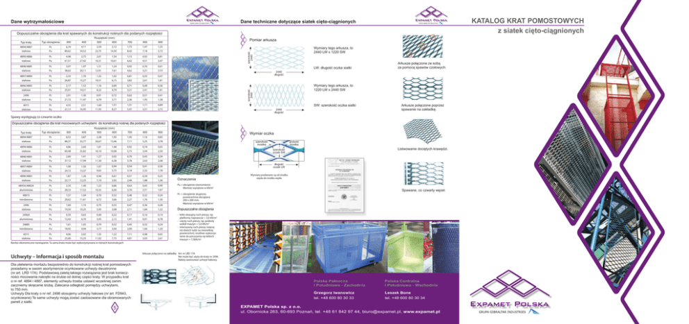 Dane wytrzymałościowe KATALOG KRAT POMOSTOWYCH z siatek cięto-ciągnionych Dane techniczne dotyczące siatek cięto-ciągnionych Dopuszczalne obciążenia dla krat spawanych do konstrukcji nośnych dla podanych rozpiętości Rozpiętość (mm) 300 400 500 600 700 800 900 4894/4887 Pc 6,79 4,11 2,54 2,12 1,73 1,47 1,25 stalowa Pu 89,62 34,52 22,75 14,50 8,42 7,18 5,72 4899/4886 Pc 4,98 2,75 2,01 1,54 1,15 0,92 0,81 stalowa Pu 61,51 27,42 16,51 10,61 6,42 4,51 3,47 4898/4885 Pc 3,07 1,97 1,51 1,24 0,92 0,76 0,61 stalowa Pu 38,62 20,11 12,91 7,61 4,62 3,21 2,53 4897/4884 Pc 2,33 1,70 1,32 1,02 0,81 0,55 0,47 stalowa Pu 26,87 15,27 10,51 6,15 3,82 2,61 1,81 4896/4883 Pc 2,17 1,52 1,16 0,89 0,71 0,49 0,36 stalowa Pu 25,01 14,31 8,22 4,79 3,21 2,41 1,81 2496 Pc 2,01 1,30 0,91 0,72 0,62 0,51 0,41 stalowa Pu 21,72 11,47 6,79 3,71 2,36 1,95 1,38 6015 Pc 4,55 2,51 1,69 1,51 1,31 1,11 0,89 stalowa Pu 27,17 16,95 11,93 8,27 5,47 3,51 2,72 Pomiar arkusza Wymiary tego arkusza, to 2440 LW x 1220 SW szerokość 2440 Typ obciążenia LW: długość oczka siatki Arkusze połączone ze sobą za pomocą spawów czołowych. 2440 długość Wymiary tego arkusza, to 1220 LW x 2440 SW szerokość 2440 Typ kraty SW: szerokość oczka siatki 2440 długość Arkusze połączone poprzez spawanie na zakładkę. Spawy występują co czwarte oczko Dopuszczalne obciążenia dla krat mocowanych uchwytami do konstrukcji nośnej dla podanych rozpiętości Rozpiętość (mm) Typ kraty Typ obciążenia 300 400 500 600 700 800 900 4894/4887 Pc 6,53 3,87 2,38 1,95 1,45 1,16 0,83 stalowa Pu 88,27 32,77 20,67 13,46 7,11 5,25 3,78 4899/4886 Pc 4,86 2,60 1,81 1,48 0,92 0,74 0,65 stalowa Pu 60,48 25,82 16,10 10,08 5,75 3,44 2,50 4898/4885 Pc 2,60 1,41 1,27 0,92 0,70 0,43 0,39 stalowa Pu 37,12 17,99 11,30 6,38 3,78 2,63 2,08 4897/4884 Pc 1,99 1,50 1,07 0,94 0,54 0,41 0,36 stalowa Pu 24,72 13,37 9,65 5,75 3,18 2,32 1,78 0,51 0,34 0,25 Wymiar oczka szerokość mostka długość oczek LW 4896/4883 Pc 1,87 1,26 0,96 stalowa Pu 22,17 12,25 7,10 3,92 2,44 1,88 1,36 Oznaczenia Pu = obciążenie równomierne. Wartości wyrażone w kN/m2 4895A/4882A Pc 2,35 1,40 1,22 0,86 0,63 0,45 0,40 aluminiowa Pu 28,33 17,52 10,35 6,00 3,70 2,31 1,67 4881S Pc 1,57 1,04 0,70 0,52 0,48 0,32 0,24 nierdzewna Pu 20,62 11,61 6,72 3,66 2,27 1,76 1,30 2496 Pc 1,69 1,10 0,75 0,55 0,47 0,36 0,28 stalowa Pu 19,50 10,25 5,95 3,08 2,11 1,84 1,22 Dopuszczalne obciążenia - lekki okazyjny ruch pieszy, np. platformy naprawcze = 3,0 kN/m2 - częsty ruch pieszy, np. podesty wokół maszyn = 5,0 kN/m2 - intensywny ruch pieszy (więcej niż dwóch ludzi na niewielkiej powierzchni), możliwe wykorzystanie do poruszania się lekkich maszyn = 7,5kN/m2 2496A Pc 0,59 0,65 0,40 0,22 0,17 0,16 0,14 Pu 12,42 6,70 3,45 2,12 1,41 0,91 0,78 0,24 2488S Pc 1,61 1,05 0,70 0,52 0,45 0,32 nierdzewna Pu 18,92 9,94 5,77 3,04 2,00 1,66 1,20 6015 Pc 4,06 2,02 1,35 1,22 1,11 0,98 0,65 stalowa Pu 25,00 15,25 11,02 7,75 4,81 3,03 2,61 Bardzo ekonomiczne rozwiązanie. Ta sama krata może być wykorzystywana w różnych konstrukcjach Listwowanie dociętych krawędzi. szerokość oczek SW 0,61 aluminiowa grubość mostka Wymiary podawane są od środka węzła do środka węzła Spawane, co czwarty węzeł. Pc = obciążenie skupione, powierzchnia obciążana 200 x 200 mm. Wartości wyrażone w kN/m2 Arkusze połączone na zakładkę Art. nr LRD 17A Nie może być użyty do kraty nr 2496. Należy zastosować uchwyt hakowy. Uchwyty – Informacja i sposób montażu Dla ułatwienia montażu bezpośrednio do konstrukcji nośnej krat pomostowych posiadamy w swoim asortymencie ocynkowane uchwyty dwustronne (nr art. LRD 17A). Podstawową zaletą takiego rozwiązania jest brak konieczności mocowania nakrętki na śrubie od dolnej części kraty. W przypadku krat o nr ref. 4894 i 4887, elementy uchwytu trzeba ustawić wcześniej zanim zaczniemy skręcanie śrubą. Zalecana odległość pomiędzy uchwytami, to 750 mm. Uchwyty Dla kraty o nr ref. 2496 stosujemy uchwyty hakowe (nr art. FD943, ocynkowane) Te same uchwyty mogą zostać zastosowane dla obramowanych paneli z siatki. 5 Polska Północna i Południowo - Zachodnia Polska Centralna i Południowo - Wschodnia Grzegorz Iwanowicz Leszek Bone tel. +48 600 80 30 33 tel. +48 600 80 30 34 EXPAMET Polska sp. z o.o. ul. Obornicka 263, 60-693 Poznań, tel. +48 61 842 97 44, [email protected], www.expamet.pl KRATY POMOSTOWE z siatki cięto-ciągnionej SIATKI CIĄGNIĘTO-CIĄGNIONE na kraty pomostowe ZDJĘCIA SIATEK Opis produktu Opis produktu: Proponujemy szeroki asortyment siatek cięto-ciągnionych, które mogą być zastosowane jako kraty pomostowe EXPAMET, również w specjalnej wersji antypoślizgowej Grip (z nacięciami). Dopuszczalne obciążenia tych krat zostały potwierdzone wieloma testami. Produkty wymienione poniżej są niezwykle ekonomicznym, antypoślizgowym rozwiązaniem do stosowania w różnego typu pomostach, czy stopniach schodowych. Wytrzymałe i estetyczne rozwiązanie do wykorzystania, jako kraty pomostowe. Asortyment krat pomostowych EXPAMET został przetestowany w różnych warunkach, wszędzie tam, gdzie bezpieczeństwo poruszania się jest bardzo istotne. Spełniają oczekiwania nawet najbardziej wymagających użytkowników. Kraty EXPAMET doskonale nadają się do zastosowania na wysokościach i pochyłościach, dzięki swym antypoślizgowym właściwościom. Konstrukcja siatek cięto-ciągnionych pozwala na swobodny przepływ wody i zapewnia naturalny drenaż. Także śnieg, lód i błoto przedostają się przez otwory, co zapewnia bezpieczne przemieszczanie się użytkowników. Dzięki solidnemu wyglądowi można je stosować w najróżniejszych projektach. Aluminiowe kraty pomostowe Nr ref. Długość oczka (LW) Szerokość oczka (SW) Szerokość mostk. Grubość blach Waga (kg/m2) % otwarcia Wysokość krat Standardowa wielkość arkusz 2496A 60,96 25,40 5,82 4,70 6,08 52 12,70 2500x1250 4895A 121,92 38,10 11,90 6,00 10,16 4