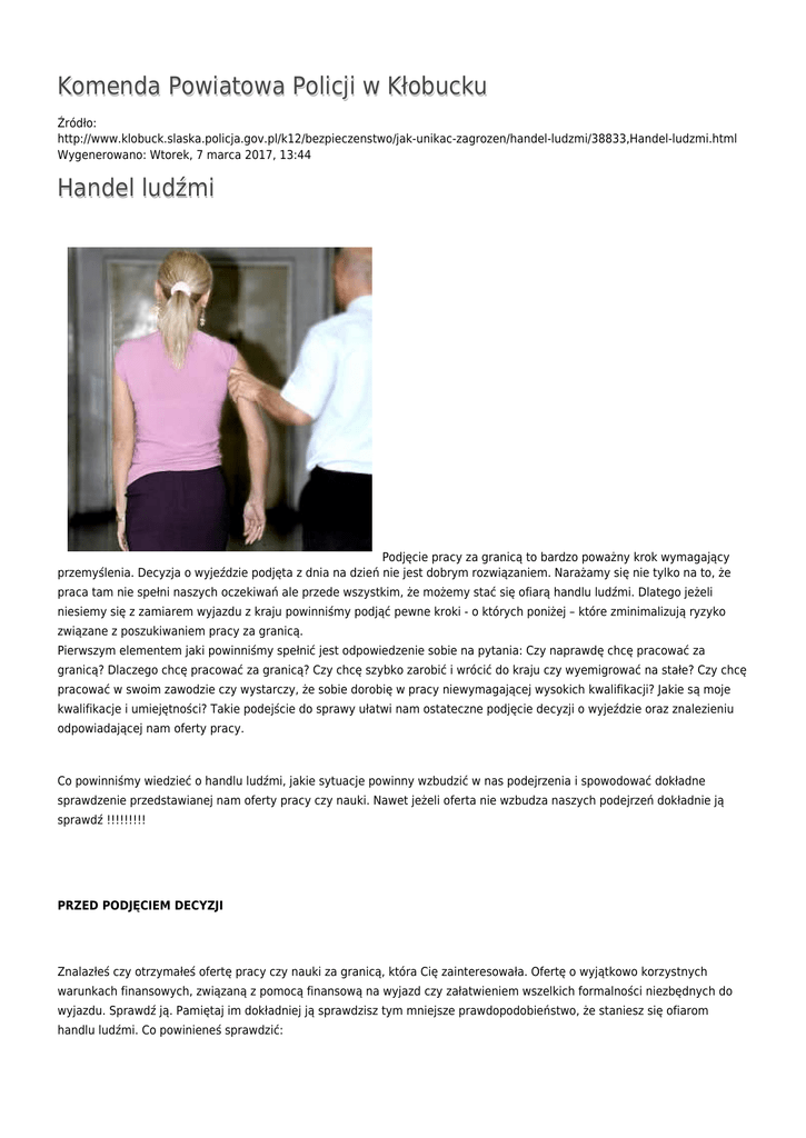 Komenda Powiatowa Policji w Kłobucku Źródło: http://www.klobuck.slaska.policja.gov.pl/k12/bezpieczenstwo/jak-unikac-zagrozen/handel-ludzmi/38833,Handel-ludzmi.html Wygenerowano: Wtorek, 7 marca 2017, 13:44 Handel ludźmi Podjęcie pracy za granicą to bardzo poważny krok wymagający przemyślenia. Decyzja o wyjeździe podjęta z dnia na dzień nie jest dobrym rozwiązaniem. Narażamy się nie tylko na to, że praca tam nie spełni naszych oczekiwań ale przede wszystkim, że możemy stać się ofiarą handlu ludźmi. Dlatego jeżeli niesiemy się z zamiarem wyjazdu z kraju powinniśmy podjąć pewne kroki - o których poniżej – które zminimalizują ryzyko związane z poszukiwaniem pracy za granicą. Pierwszym elementem jaki powinniśmy spełnić jest odpowiedzenie sobie na pytania: Czy naprawdę chcę pracować za granicą? Dlaczego chcę pracować za granicą? Czy chcę szybko zarobić i wrócić do kraju czy wyemigrować na stałe? Czy chcę pracować w swoim zawodzie czy wystarczy, że sobie dorobię w pracy niewymagającej wysokich kwalifikacji? Jakie są moje kwalifikacje i umiejętności? Takie podejście do sprawy ułatwi nam ostateczne podjęcie decyzji o wyjeździe oraz znalezieniu odpowiadającej nam oferty pracy. Co powinniśmy wiedzieć o handlu ludźmi, jakie sytuacje powinny wzbudzić w nas podejrzenia i spowodować dokładne sprawdzenie przedstawianej nam oferty pracy czy nauki. Nawet jeżeli oferta nie wzbudza naszych podejrzeń dokładnie ją sprawdź !!!!!!!!! PRZED PODJĘCIEM DECYZJI Znalazłeś czy otrzymałeś ofertę pracy czy nauki za granicą, która Cię zainteresowała. Ofertę o wyjątkowo korzystnych warunkach finansowych, związaną z pomocą finansową na wyjazd czy załatwieniem wszelkich formalności niezbędnych do wyjazdu. Sprawdź ją. Pamiętaj im dokładniej ją sprawdzisz tym mniejsze prawdopodobieństwo, że staniesz się ofiarom handlu ludźmi. Co powinieneś sprawdzić: Praca za granicą: ● sprawdź czy osoba lub firma proponująca Ci pracę działa legalnie, czy jest zarejestrowana w Krajowym Rejestrze Agencji Zatrudnienia, posiada odpowiedni certyfikat – od 01 listopada 2005 wydawany przez Urząd Marszałkowski Województwa, ● ustal czy Twój przyszły pracodawca istnieje oraz zgodność profilu działania firmy z proponowaną Ci pracą, ● sprawdź czy pośrednik posiada umowę zawartą z pracodawcą zagranicznym i czy wysłał już ludzi do pracy za granicą, ● poproś o dane kontaktowe pracodawcy oraz osób, które już skorzystały z usług pośrednika i mogą to potwierdzić, ● domagaj się umowy w języku polskim, przed podpisaniem dokładnie ją przeczytaj, skonsultuj jej treść z osobą mającą profesjonalną wiedzę w tym zakresie lub osobą zaufaną, ● jeśli masz jakiekolwiek wątpliwości, przed wyjazdem skontaktuj się z organizacją zajmującą się zwalczaniem handlu ludźmi ( np.: LaStrada ) Nauka za granicą: ● skontaktuj się uczelnią lub szkołą, o przyjęcie do której się ubiegasz i sprawdź czy dany kurs jest rzeczywiście oferowany, ● jeżeli organizacją kursu zajmuje się niezależna agencja sprawdź czy rzeczywiście taka agencja istnieje i działa legalnie, ● porozmawiaj z poprzednimi uczestnikami kursu, ● jeśli masz jakiekolwiek wątpliwości, przed wyjazdem skontaktuj się z organizacją zajmującą się zwalczaniem handlu ludźmi ( np.: LaStrada ) PRZED WYJAZDEM ● uzyskaj informację z oficjalnego źródła ( np.: ambasady kraju do którego się udajesz ) jakich dokumentów potrzebujesz aby tam żyć, mieszkać i pracować czy uczuć się, ● skseruj wszystkie dokumenty jakie zabierasz ze sobą np.: paszport, dokumenty podróżne, umowę o pracę itp. i zostaw zaufanej osobie w kraju, ● pozostaw zaufanej osobie swoje aktualne zdjęcie, ● pozostaw rodzicom lub przyjacielowi informacje obejmujące dokładny adres gdzie się wybierasz i gdzie będziesz mieszkać, nr telefonu, nazwę i adres miejsca zatrudnienia, ● informuj na bieżąco o zmianie miejsca zamieszkania i zatrudnienia, ● zostaw informacje z kim się wybierasz: nazwisko, adres, nr telefonu (lepiej nie wyruszać w pojedynkę), ● zabierz ze sobą adres i numer telefonu ambasady/konsulatu swojego kraju w państwie docelowym, ● ustal częstotliwość kontaktów telefonicznych z osobami bliskimi np.: raz w tygodniu. Ustal hasło, którym się posłużysz w przypadku ewentualnych kłopotów i niemożności powiedzenia tego wprost, PAMIĘTAJ !!!!!! ● masz prawo do wyboru swojego miejsca zamieszkania i swobodnego poruszania się, ● nie możesz być zmuszany do pracy i wykonywania usług wbrew własnej woli, ● masz prawo do obrony swoich praw, ZA GRANICĄ Masz kłopoty zwróć się do konsula: ● utraciłeś dokumenty, po sprawdzeniu Twojej tożsamości otrzymasz paszport blankietowy umożliwiający powrót do kraju, ● zostałeś zatrzymany lub aresztowany – zadba abyś był nie gorzej traktowany niż obywatel kraju w którym przebywasz, powiadomi Twoją rodzinę o aresztowaniu, ● może dostarczyć Ci listę adwokatów rekomendowanych przez polską placówkę dyplomatyczną (koszty wynajęcia adwokata pokrywasz sam), ● potrzebujesz skontaktować się z organizacjami bezpłatnie oferującymi pomoc i wsparcie ofiarom handlu, wymuszonej prostytucji; adresy niektórych z nich uzyskasz od polskiego konsula w kraju, w którym przebywasz, ● gdy utraciłeś pieniądze konsul może: - pośredniczyć w skontaktowaniu Cię z rodziną lub przyjaciółmi w Polsce, - w uzasadnionych przypadkach, jeżeli nie ma innych możliwości przekazania pieniędzy, wypłaci kwotę jaka została wpłacona przez rodzinę czy znajomych na konto Ministerstwa Spraw Zagranicznych w Warszawie, - w uzasadnionych przypadkach udzielić pomocy finansowej w wysokości umożliwiającej powrót do kraju o ile potrzebujący zobowiąże się do jej zwrotu. Ocena: 0/5 (0) Tweetnij