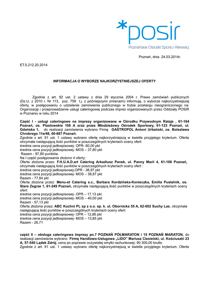 Poznań, dnia 24.03.2014r. ET.5.212.20.2014 INFORMACJA O WYBORZE NAJKORZYSTNIEJSZEJ OFERTY Zgodnie z art. 92 ust. 2 ustawy z dnia 29 stycznia 2004 r. Prawo zamówień publicznych (Dz.U. z 2010 r. Nr 113, poz. 759 t.j. z późniejszymi zmianami) informuję, o wyborze najkorzystniejszej oferty, w postępowaniu o udzielenie zamówienia publicznego w trybie przetargu nieograniczonego na: Organizację i przeprowadzenie usługi cateringowej podczas imprez organizowanych przez Oddziały POSiR w Poznaniu w roku 2014 Część I - usługi cateringowe na imprezy organizowane w Ośrodku Przywodnym Rataje , 61-164 Poznań, os. Piastowskie 106 A oraz przez Młodzieżowy Ośrodek Sportowy, 61-123 Poznań, ul. Gdańska 1, do realizacji zamówienia wybrano Firmę GASTROPOL Antoni Urbański, os. Bolesława Chrobrego 11e/48, 60-687 Poznań. Zgodnie z art. 91 ust. 1 ustawy wybrano ofertę najkorzystniejszą w świetle przyjętego kryterium. Oferta otrzymała następującą ilość punktów w poszczególnych kryteriach oceny ofert: średnia cena pozycji jadłospisowej- OPR- 60,00 pkt średnia cena pozycji jadłospisowej- MOS – 37,80 pkt Razem - 97,80 punktów. Na I część postępowania złożono 4 oferty: Oferta złożona przez: F.H.U.A.D.art Catering Arkadiusz Panek, ul. Panny Marii 4, 61-108 Poznań, otrzymała następującą ilość punktów w poszczególnych kryteriach oceny ofert : średnia cena pozycji jadłospisowej-OPR - 38,97 pkt średnia cena pozycji jadłospisowej- MOS – 38,87 pkt Razem - 77,84 pkt Oferta złożona przez: Menu-et Catering s.c., Barbara Kordzińska-Konieczka, Emilia Pustelnik, os. Stare Zegrze 1, 61-249 Poznań, otrzymała następującą ilość punktów w poszczególnych kryteriach oceny ofert: średnia cena pozycji jadłospisowej- OPR – 17,13 pkt średnia cena pozycji jadłospisowej- MOS – 40,00 pkt Razem - 57,13 pkt Oferta złożona przez: ABC Kuchni PL sp z o.o. sp. k. ul. Obornicka 55 A, 62-002 Suchy Las, otrzymała następującą ilość punktów w poszczególnych kryteriach oceny ofert: średnia cena pozycji jadłospisowej- OPR – 12,86 pkt średnia cena pozycji jadłospisowej- MOS – 13,85 pkt Razem - 26,71 część II – obsługa cateringowa imprezy pn.7 POZNAŃ PÓŁMARATON i 15 POZNAŃ MARATON, do realizacji zamówienia wybrano Firmę Handlowo-Usługowa „LIDO” Mariusz Ciesielski, ul. Kościuszki 23 A, 57-540 Lądek Zdrój, cena po poprawie oczywistej omyłki rachunkowej- 90 300,00 brutto Zgodnie z art. 91 ust. 1 ustawy wybrano ofertę najkorzystniejszą w świetle przyjętego kryterium. Oferta otrzymała sumę 100,00 punktów. Na II część postępowania złożono 6 ofert: Oferta złożona przez Przedsiębiorstwo Handlowo-Produkcyjne JEANS Teresa i Jan Szblewscy, sp.j., ul. Wrocławska 42, 62-300 Września, cena za całość zamówienia, 98 925,00 zł brutto, otrzymała 91,28 pkt Oferta złożona przez GASTROPOL Antoni Urbański, os. Bolesława Chrobrego 11e/48, 60-687 Poznań całość zamówienia 99 099,44 zł brutto, otrzymała 91,12 pkt Oferta złożona przez F.H.U.A.D.art Catering Arkadiusz Panek, ul. Panny Marii 4, 61-108 Poznań, cena za całość zamówienia 139 165,00 zł brutto, otrzymała 64,89 pkt Oferta złożona przez ABC Kuchni PL sp z o.o. sp. k. ul. Obornicka 55 A, 62-002 Suchy Las, cena za całość zamówienia 146 734,00 zł brutto, otrzymała 61,54 pkt Oferta złożona przez RODAN Sp z o.o., Skrzynki ul. Poznańska 5 D, 62-035 Kórnik, cena za całość zamówienia po dokonaniu poprawy oczywistej omyłki rachunkowej, 149 330,00 zł brutto, otrzymała 60,49 pkt część III – obsługa cateringowa imprezy pn. SPARTAKIADA SENIORÓW do realizacji zamówienia wybrano Firmę GASTROPOL Antoni Urbański, os. Bolesława Chrobrego 11e/48, 60-687 Poznań cena za przygotowanie imprezy dla jednej osoby 20,48 zł brutto, Zgodnie z art. 91 ust. 1 ustawy wybrano ofertę najkorzystniejszą w świetle przyjętego kryterium. Oferta otrzymała sumę 100,00 punktów. Na III część postępowania złożono 8 ofert: Oferta złożona przez Przedsiębiorstwo Prima-Bistro Zdzisław Strumnik, ul. Sosnowa 1, 64-800 Chodzież , cena za przygotowanie imprezy dla jednej osoby 20,90 zł brutto, otrzymała 97,99 pkt Oferta złożona przez Karczma w Miłosnej, ul. Miłosna 6, 99-340 Krośniewice cena za przygotowanie imprezy dla jednej osoby 24,95 zł brutto, otrzymała 82,08 pkt Oferta złożona przez F.H.U.A.D.art Catering Arkadiusz Panek, ul. Panny Marii 4, 61-108 Poznań, cena za przygotowanie imprezy dla jednej osoby 33,48 zł brutto, otrzymała 61,17 pkt Oferta złożona przez Menu-et Catering s.c., Barbara Kordzińska-Konieczka, Emilia Pustelnik, os. Stare Zegrze 1, 61-249 Poznań cena za przygotowanie imprezy dla jednej osoby 57,00 zł brutto, otrzymała 35,93 pkt Oferta złożona przez ABC Kuchni PL sp z o.o. sp. k. ul. Obornicka 55 A, 62-002 Suchy Las, cena za przygotowanie imprezy dla jednej osoby 62,00 zł brutto, otrzymała 33,03 pkt Oferta złożona przez Firma Handlowo-Usługowa „LIDO” Mariusz Ciesielski , ul. Kościuszki 23 A, 57540 Lądek Zdrój, cena za przygotowanie imprezy dla jednej osoby 7500,00 zł brutto, otrzymała 0,27 pkt Wykonawca Biuro Projektów „EUROPROJEKT” Przemysław Górny, ul. Sportowa 4, 64-423 Lubosz został z postępowania wykluczony na podstawie 24 ust 2 pkt 4, nie wykazał spełnienia warunków udziału w postępowaniu. W złożonej ofercie jako dokumenty potwierdzające należyte wykonanie usług wymienionych na potwierdzenie spełniania warunku wiedzy i doświadczenia, złożono faktury wraz z dowodami zapłaty. Zgodnie z rozporządzeniem Prezesa Rady Ministrów z dnia 19 lutego 2013 r. w sprawie rodzajów dokumentów, jakich może żądać zamawiający od wykonawcy, oraz form w jakich te dokumenty mogą być składane (Dz. U. 2013.231), dokumentami potwierdzającymi należyte wykonanie umowy są: a) poświadczenie, z tym że w odniesieniu do nadal wykonywanych usług okresowych lub ciągłych poświadczenie powin