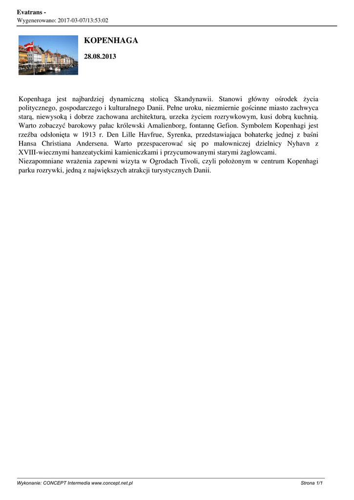 Evatrans Wygenerowano: 2017-03-07/13:53:02 KOPENHAGA 28.08.2013 Kopenhaga jest najbardziej dynamiczną stolicą Skandynawii. Stanowi główny ośrodek życia politycznego, gospodarczego i kulturalnego Danii. Pełne uroku, niezmiernie gościnne miasto zachwyca starą, niewysoką i dobrze zachowana architekturą, urzeka życiem rozrywkowym, kusi dobrą kuchnią. Warto zobaczyć barokowy pałac królewski Amalienborg, fontannę Gefion. Symbolem Kopenhagi jest rzeźba odsłonięta w 1913 r. Den Lille Havfrue, Syrenka, przedstawiająca bohaterkę jednej z baśni Hansa Christiana Andersena. Warto przespacerować się po malowniczej dzielnicy Nyhavn z XVIII-wiecznymi hanzeatyckimi kamieniczkami i przycumowanymi starymi żaglowcami. Niezapomniane wrażenia zapewni wizyta w Ogrodach Tivoli, czyli położonym w centrum Kopenhagi parku rozrywki, jedną z największych atrakcji turystycznych Danii. Wykonanie: CONCEPT Intermedia www.concept.net.pl Strona 1/1