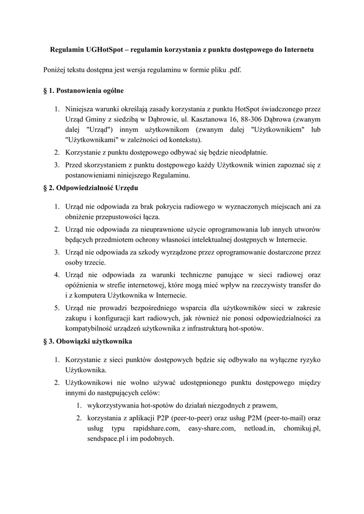 Regulamin UGHotSpot – regulamin korzystania z punktu dostępowego do Internetu Poniżej tekstu dostępna jest wersja regulaminu w formie pliku .pdf. § 1. Postanowienia ogólne 1. Niniejsza warunki określają zasady korzystania z punktu HotSpot świadczonego przez Urząd Gminy z siedzibą w Dąbrowie, ul. Kasztanowa 16, 88-306 Dąbrowa (zwanym dalej "Urząd") innym użytkownikom (zwanym dalej "Użytkownikiem" lub "Użytkownikami" w zależności od kontekstu). 2. Korzystanie z punktu dostępowego odbywać się będzie nieodpłatnie. 3. Przed skorzystaniem z punktu dostępowego każdy Użytkownik winien zapoznać się z postanowieniami niniejszego Regulaminu. § 2. Odpowiedzialność Urzędu 1. Urząd nie odpowiada za brak pokrycia radiowego w wyznaczonych miejscach ani za obniżenie przepustowości łącza. 2. Urząd nie odpowiada za nieuprawnione użycie oprogramowania lub innych utworów będących przedmiotem ochrony własności intelektualnej dostępnych w Internecie. 3. Urząd nie odpowiada za szkody wyrządzone przez oprogramowanie dostarczone przez osoby trzecie. 4. Urząd nie odpowiada za warunki techniczne panujące w sieci radiowej oraz opóźnienia w strefie internetowej, które mogą mieć wpływ na rzeczywisty transfer do i z komputera Użytkownika w Internecie. 5. Urząd nie prowadzi bezpośredniego wsparcia dla użytkowników sieci w zakresie zakupu i konfiguracji kart radiowych, jak również nie ponosi odpowiedzialności za kompatybilność urządzeń użytkownika z infrastrukturą hot-spotów. § 3. Obowiązki użytkownika 1. Korzystanie z sieci punktów dostępowych będzie się odbywało na wyłączne ryzyko Użytkownika. 2. Użytkownikowi nie wolno używać udostępnionego punktu dostępowego między innymi do następujących celów: 1. wykorzystywania hot-spotów do działań niezgodnych z prawem, 2. korzystania z aplikacji P2P (peer-to-peer) oraz usług P2M (peer-to-mail) oraz usług typu rapidshare.com, easy-share.com, netload.in, chomikuj.pl, sendspace.pl i im podobnych. 3. przesyłania i udostępniania treści, które są niezgodne z prawem lub są przedmiotem ochrony własności intelektualnej, której podmiotem nie jest Użytkownik, 4. przesyłania i udostępniania treści mogących naruszyć czyjekolwiek prawa osobiste, 5. masowego rozsyłania nie zamówionych przez odbiorców treści o charakterze reklamowym (tzw. spam), 6. rozpowszechniania wirusów komputerowych i innych programów mogących uszkodzić komputery innych użytkowników Internetu, 7. odsprzedawania dostępu do Internetu bez wiedzy i pisemnej zgody Urzędu, 8. permanentnego obciążania w znacznym stopniu pasma poprzez udostępnianie serwerów www, IRC, FTP itp. 3. Użytkownikowi nie wolno używać punktu dostępowego, o którym mowa w niniejszym Regulaminie, do budowania stałych podsieci. Poprzez stałą podsieć rozumiane jest udostępnianie Internetu innym komputerom przez okres dłuższy niż 1 dzień w miesiącu. 4. W przypadku nie przestrzegania przez Użytkownika postanowień niniejszego Regulaminu jak i niezgodnego z przeznaczeniem korzystania z punktu dostępowego, Urząd ma prawo do jednostronnego podjęcia następujących działań: 1. czasowe zablokowanie dostępu do punktu dostępowego użytkownikowi, 2. stałe zablokowanie dostępu do punktu dostępowego użytkownikowi, 3. żądania od Użytkownika wyrównania szkody, jeśli taką Urząd poniosło w związku z niezgodnym z niniejszymi warunkami użyciem dostępu. 5. Użytkownik ponosi wyłączną odpowiedzialność za sposób, w jaki wykorzystuje hotspot, w tym za treść i inną zawartość przesyłanych wiadomości, z uwzględnieniem odpowiedzialności karnej za działanie niezgodne z prawem. 6. Urząd zastrzega sobie prawo zmiany do niniejszego Regulaminu. 7. W sprawach nieuregulowanych niniejszym Regulaminem zastosowanie mają przepisy Kodeksu cywilnego. 8. Niniejszy regulamin wchodzi w życie z dniem 2.01.2013r.