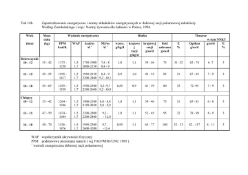 Tab 14b. Wiek Zapotrzebowanie energetyczne i normy składników energetycznych w dobowej racji pokarmowej młodzieży Według Ziemlańskiego i wsp.: Normy żywienia dla ludności w Polsce, 1994. (lata) Masa ciałą (kg) Dziewczynki 10 - 12 Wydatek energetyczny Białko PPM kcal/d. WAF kcal/os /d 1 MJ/os /d 1 wzorc. g/kg/d krajowe j racji g/kg/d 35 - 42 1173 1258 1,5 1,7 1750-1900 2000-2150 7,4 - 8 8,4 - 9 1,0 1,1 39 - 46 13 - 15 45 - 55 1295 1417 1,5 1,7 1950-2150 8,4 - 9 2200-2400 9,2 -10,1 0,9 1,0 16 - 18 45 - 65 1295 1539 1,5 1,7 1950-2300 8,2 -9,7 2300-2600 9,2 -10,9 0,85 Chłopcy 10 - 12 35 - 42 1264 1386 1,5 1,7 1900-2100 8,0 - 8,8 2150-2850 9,0 - 9,9 13 - 15 47 - 59 1474 1684 1,5 1,7 2300-2800 2200-2400 16 - 18 50 - 70 1526 1876 1,5 1,7 1950-2300 2600-3200 Tłuszcze krajowej ilość racji zalecana g/os/d g/os/d w tym NNKT g/os/d E % E % Ogółem g/os/d 75 31- 32 62 - 74 6 -7 3 45 - 55 85 31 67 - 83 7-9 3 0,9 41 - 59 80 33 72 -95 7-9 3 1,0 1,1 39 - 46 75 31 65 - 81 6-8 3 9,2 - 12,0 1,0 1,1 52 - 65 95 32 78 - 98 8-9 3 9,7 -13,4 0,95 1,1 65 - 77 100 32 - 33 82 - 117 8 - 11 3 WAF współczynnik aktywności fizycznej PPM podstawowa przemiana materii ( wg FAO/WHO/UNU 1985 ) 1 wartość energetyczna dobowej racji pokarmowej