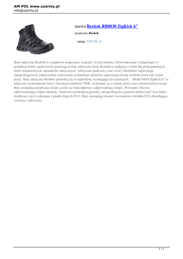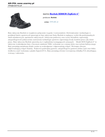 AM-POL www.usarmy.pl [email protected] nazwa Reebok RB8830 ZigKick 6" producent: Reebok cena: 599.00 zł Buty taktyczne Reebok to wyjątkowe połączenie wygody i wytrzymałości. Doświadczenie i technologie w produkcji butów sportowych sprawiają że buty taktyczne firmy Reebok to najlepszy wybór dla profesjonalnych służb mundurowych, operatorów taktycznych. Atletyczne podeszwy oraz wzory bieżników zapewniają antypoślizgowość jednocześnie zastrzeżone technologie sportowe zapewniają trwały komfort przez cały dzień pracy. Buty taktyczne Reebok sprawdzą się w najbardziej wymagających sytuacjach. Model 8830 ZigKick 6" to taktyczne wodoodporne buty z bocznym zamkiem YKK, wykonane są z czarnej skóry oraz nylonu balistycznego Buty posiadają membranę dzięki czemu są wodoodporne i odprowadzają wilgoć. Wewnątrz obszyte odprowadzającą wilgoć tkaniną . Podeszwa podwójnej gęstości, antypoślizgowa gumowa dolna część oraz lekka środkowa część wykonana z pianki Zigtech EVA. Buty posiadają również wewnętrzną wkładkę F2A absorbującą wstrząsy i uderzenia. 1/1