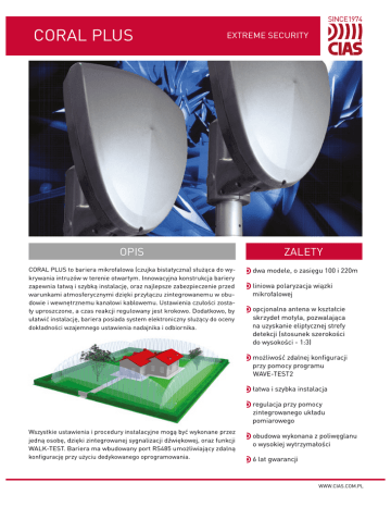 CORAL PLUS EXTREME SECURITY OPIS ZALETY CORAL PLUS to bariera mikrofalowa (czujka bistatyczna) służąca do wykrywania intruzów w terenie otwartym. Innowacyjna konstrukcja bariery zapewnia łatwą i szybką instalację, oraz najlepsze zabezpieczenie przed warunkami atmosferycznymi dzięki przyłączu zintegrowanemu w obudowie i wewnętrznemu kanałowi kablowemu. Ustawienia czułości zostały uproszczone, a czas reakcji regulowany jest krokowo. Dodatkowo, by ułatwić instalację, bariera posiada system elektroniczny służący do oceny dokładności wzajemnego ustawienia nadajnika i odbiornika. dwa modele, o zasięgu 100 i 220m liniowa polaryzacja wiązki mikrofalowej opcjonalna antena w kształcie skrzydeł motyla, pozwalająca na uzyskanie eliptycznej strefy detekcji (stosunek szerokości do wysokości - 1:3) możliwość zdalnej konfiguracji przy pomocy programu WAVE-TEST2 łatwa i szybka instalacja regulacja przy pomocy zintegrowanego układu pomiarowego Wszystkie ustawienia i procedury instalacyjne mogą być wykonane przez jedną osobę, dzięki zintegrowanej sygnalizacji dźwiękowej, oraz funkcji WALK-TEST. Bariera ma wbudowany port RS485 umożliwiający zdalną konfigurację przy użyciu dedykowanego oprogramowania. obudowa wykonana z poliwęglanu o wysokiej wytrzymałości 6 lat gwarancji WWW.CIAS.COM.PL CORAL PLUS EXTREME SECURITY DANE TECHNICZNE Kompletacja urządzenia: Dwie głowice (nadajnik i odbiornik) z obejmami kryjącymi okablowanie, do montażu na słupku Ø 60 mm. Pamięć zdarzeń: 256 zdarzeń z sygnaturami czasowymi. Komunikacja: Wyjścia przekaźnikowe bezpotencjałowe (alarm, sabotaż, usterka) do podłączenia do dowolnej centralki alarmowej, magistrala RS485 do podłączenia wyjść przekaźnikowych w systemie IB-System lub przez sieć IP (niezbędny moduł IP-Doorway) do oprogramowania IB-Server (dostępne SDK i wtyczki software’owe pozwalające na współpracę z systemami m.inn. z Geutebruck ®, Milestone ®, Arteco®, Diva®, InPro BMS®, Gemos®). Częstotliwość: Pasmo X: 10,587 GHz Zapas mocy dla kompensacji warunków propagacji: ≥16 dB. Antena: Paraboliczna o średnicy 20 cm z promiennikiem typu „backfire” lub opcjonalna antena w kształcie skrzydeł motyla, pozwalająca na stworzenie strefy detekcji o stosunku szerokości do wysokości 1:3. Obudowa: Szara lub zielona, wykonana z poliwęglanu o wysokiej wytrzymałości. Wymiary i waga: Jedna głowica: 47 x 30 x 29 cm, waga 2,25 kg. Pudło z kompletem urządzeń: 44 x 38 x 56 cm, waga 5,8 kg. Polaryzacja wiązki mikrofalowej: Liniowa (pozioma lub pionowa – zmiana możliwa przez instalatora bez przekręcania głowicy) MTTR (średni czas uruchomienia): 20 min Ilość kanałów modulacji: 16 kanałów o częstotliwości stabilizowanej kwarcowo. MTBF (średni czas między uszkodzeniami): 300.000 h Pd (prawdopodobieństwo detekcji): ≥98% Możliwość pracy synchronicznej: Tak, dla dwóch brier. FAR (współczynnik ilości fałszywych alarmów): ≤1/strefę/miesiąc Zasięg: 100 i 220 m Gwarancja: 6 lat. Certyfikaty: CE, IMQ Wielkość strefy detekcji: Zgodnie z poniższym rysunkiem i tabelą. Wielkość wykrywanego obiektu: Człowiek o masie minimum 30 kg przechodzący, biegnący, skaczący, czołgający się lub turlający się. Symulacja zachowania intruza przy użyciu metalowej kuli o średnicy 0,3 m. WYMIARY STREFY DETEKCJI Prędkość wykrywanego obiektu: Od 30 mm/s do 15 m/s Kompensacja warunków propagacji: Automatyczna regulacja wzmocnienia (AGC). Zapas mocy w nadajniku 16 dB dla zapewnienia zasięgu w każdych warunkach atmosferycznych. R Parametry zasilania: Napięcie: 19-24 VAC, 11,5-14,8 VDC lub 20-30 VDC. Pobór prądu przy napięciu 13,8 VDC: nadajnik ok. 65 mA, odbiornik ok. 60 mA MARTWA STREFA WYS. I SZER STREFY DETEKCJI Ochrona przeciwprzepięciowa: Transoptory na wyjściach alarmowych. y Środowiskowe warunki pracy: Temperatura od -40°C do +65°C, wilgotność od 0-100% (bez kondensacji) Analiza sygnału: Analogowa analiza sygnału ze strefy detekcji. Skokowa regulacja czułości (wielkość obiektu) i czasu (czasu jaki intruz przebywa w strefie detekcji) pozwalająca na precyzyjne ustawienie czułości urządzenia. Analiza sygnału dla potrzeb antymaskingu. Kalibracja urządzenia podczas montażu: Wbudowany moduł sygnalizacji i regulacji dla potrzeb kalibracji podczas montażu. Regulacja przez wybór funkcji przełącznikiem obrotowym. Sygnalizacja diodami LED (alarm, sabotaż, usterka), oraz głośnikiem (buzzer). Regulacja parametrów pracy i serwisowanie. Lokalna, przy użyciu przełącznika obrotowego, lub zdalna, przy użyciu oprogramowania Wave-Test 2 ® . Możliwość zdalnego monitorowania wszystkich parametrów pracy urządzenia oraz odczytu 256 zdarzeń w dzienniku. Pełna możliwość zdalnej regulacji urządzenia. Możliwość wykonania zdalnego testu. CIAS SP. Z O.O. | UL. ŻELIGOWSKIEGO 8/10, 90-753 ŁÓDŹ, POLSKA l x R (m) 100 220 l (m) 4 5,5 x (m) 4,6 10,1 y (m) 3,8 6,8 Wymiary przy ustawieniu średniej czułości bariery. | WWW.CIAS.COM.PL