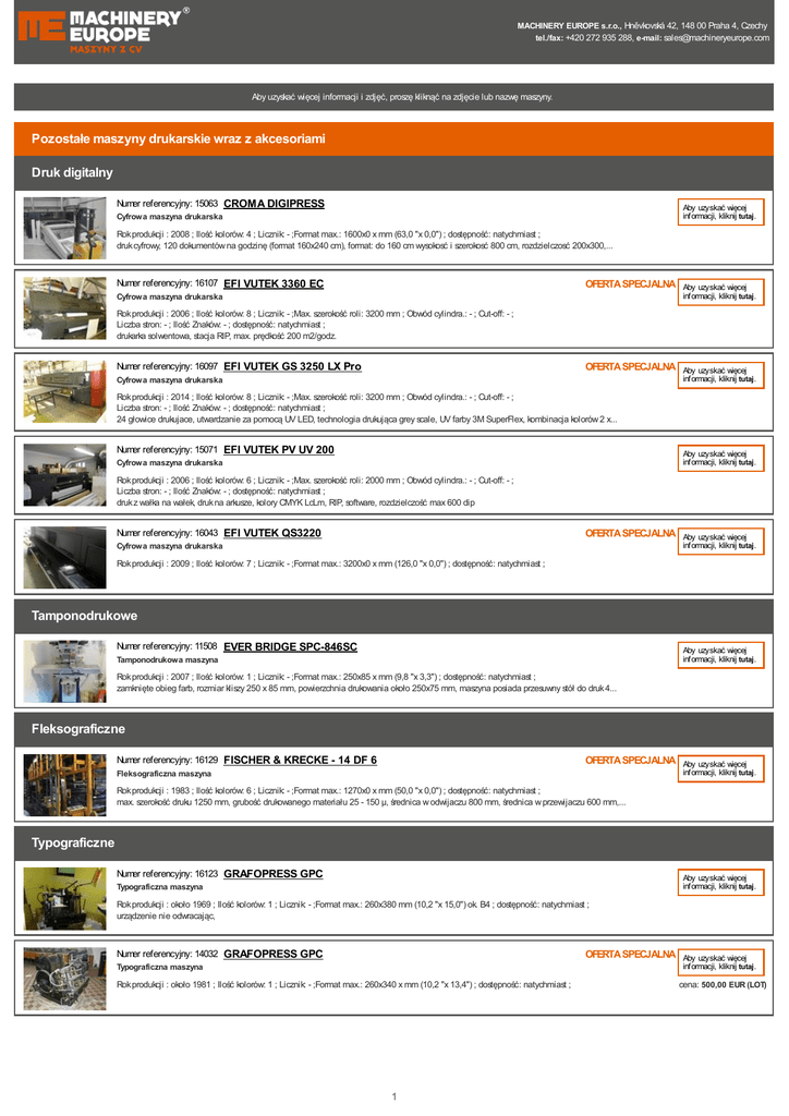 MACHINERY EUROPE s.r.o., Hněvkovská 42, 148 00 Praha 4, Czechy tel./fax: +420 272 935 288, e-mail: [email protected] Aby uzyskać więcej informacji i zdjęć, proszę kliknąć na zdjęcie lub nazwę maszyny. Pozostałe maszyny drukarskie wraz z akcesoriami Druk digitalny Numer referencyjny: 15063 CROMA DIGIPRESS Aby uzyskać więcej informacji, kliknij tutaj. Cyfrowa maszyna drukarska Rok produkcji : 2008 ; Ilość kolorów: 4 ; Licznik: - ;Format max.: 1600x0 x mm (63,0 "x 0,0") ; dostępność: natychmiast ; druk cyfrowy, 120 dokumentów na godzinę (format 160x240 cm), format: do 160 cm wysokosć i szerokosć 800 cm, rozdzielczosć 200x300,... Numer referencyjny: 16107 EFI VUTEK 3360 EC OFERTA SPECJALNA Aby uzyskać więcej informacji, kliknij tutaj. Cyfrowa maszyna drukarska Rok produkcji : 2006 ; Ilość kolorów: 8 ; Licznik: - ;Max. szerokość roli: 3200 mm ; Obwód cylindra.: - ; Cut-off: - ; Liczba stron: - ; Ilość Znaków: - ; dostępność: natychmiast ; drukarka solwentowa, stacja RIP, max. prędkość 200 m2/godz. Numer referencyjny: 16097 EFI VUTEK GS 3250 LX Pro OFERTA SPECJALNA Aby uzyskać więcej informacji, kliknij tutaj. Cyfrowa maszyna drukarska Rok produkcji : 2014 ; Ilość kolorów: 8 ; Licznik: - ;Max. szerokość roli: 3200 mm ; Obwód cylindra.: - ; Cut-off: - ; Liczba stron: - ; Ilość Znaków: - ; dostępność: natychmiast ; 24 głowice drukujace, utwardzanie za pomocą UV LED, technologia drukująca grey scale, UV farby 3M SuperFlex, kombinacja kolorów 2 x... Numer referencyjny: 15071 EFI VUTEK PV UV 200 Aby uzyskać więcej informacji, kliknij tutaj. Cyfrowa maszyna drukarska Rok produkcji : 2006 ; Ilość kolorów: 6 ; Licznik: - ;Max. szerokość roli: 2000 mm ; Obwód cylindra.: - ; Cut-off: - ; Liczba stron: - ; Ilość Znaków: - ; dostępność: natychmiast ; druk z wałka na wałek, druk na arkusze, kolory CMYK LcLm, RIP, software, rozdzielczość max 600 dip Numer referencyjny: 16043 EFI VUTEK QS3220 OFERTA SPECJALNA Aby uzyskać więcej informacji, kliknij tutaj. Cyfrowa maszyna drukarska Rok produkcji : 2009 ; Ilość kolorów: 7 ; Licznik: - ;Format max.: 3200x0 x mm (126,0 "x 0,0") ; dostępność: natychmiast ; Tamponodrukowe Numer referencyjny: 11508 EVER BRIDGE SPC-846SC Aby uzyskać więcej informacji, kliknij tutaj. Tamponodrukowa maszyna Rok produkcji : 2007 ; Ilość kolorów: 1 ; Licznik: - ;Format max.: 250x85 x mm (9,8 "x 3,3") ; dostępność: natychmiast ; zamknięte obieg farb, rozmiar kliszy 250 x 85 mm, powierzchnia drukowania około 250x75 mm, maszyna posiada przesuwny stół do druk 4... Fleksograficzne Numer referencyjny: 16129 FISCHER & KRECKE - 14 DF 6 OFERTA SPECJALNA Aby uzyskać więcej informacji, kliknij tutaj. Fleksograficzna maszyna Rok produkcji : 1983 ; Ilość kolorów: 6 ; Licznik: - ;Format max.: 1270x0 x mm (50,0 "x 0,0") ; dostępność: natychmiast ; max. szerokość druku 1250 mm, grubość drukowanego materiału 25 - 150 μ, średnica w odwijaczu 800 mm, średnica w przewijaczu 600 mm,... Typograficzne Numer referencyjny: 16123 GRAFOPRESS GPC Aby uzyskać więcej informacji, kliknij tutaj. Typograficzna maszyna Rok produkcji : około 1969 ; Ilość kolorów: 1 ; Licznik: - ;Format max.: 260x380 mm (10,2 "x 15,0") ok. B4 ; dostępność: natychmiast ; urządzenie nie odwracając, Numer referencyjny: 14032 GRAFOPRESS GPC OFERTA SPECJALNA Aby uzyskać więcej informacji, kliknij tutaj. Typograficzna maszyna Rok produkcji : około 1981 ; Ilość kolorów: 1 ; Licznik: - ;Format max.: 260x340 x mm (10,2 "x 13,4") ; dostępność: natychmiast ; 1 cena: 500,00 EUR (LOT) MACHINERY EUROPE s.r.o., Hněvkovská 42, 148 00 Praha 4, Czechy tel./fax: +420 272 935 288, e-mail: [email protected] Numer referencyjny: 16122 GRAFOPRESS GPC Aby uzyskać więcej informacji, kliknij tutaj. Typograficzna maszyna Rok produkcji : około 1969 ; Ilość kolorów: 1 ; Licznik: - ;Format max.: 260x380 mm (10,2 "x 15,0") ok. B4 ; dostępność: natychmiast ; urządzenie nie odwracając, Maszyny numerujące Numer referencyjny: 14033 GRAPHIC WHIZARD K Aby uzyskać więcej informacji, kliknij tutaj. Maszyna numerująca Rok produkcji : 2000 ; Ilość kolorów: 1 ; Licznik: - ;Format max.: 450x450 x mm (17,7 "x 17,7") ; dostępność: natychmiast ; selenoidowa jednostka od 1 do 4 numerujących głowic, opcjonalny zasilacz mocy głowic, 6 kołowa jednostka z odwrotną głowicą numerującą,... Druk digitalny Numer referencyjny: 13075 HP INDIGO PRESS 3050 Aby uzyskać więcej informacji, kliknij tutaj. Cyfrowa maszyna drukarska Rok produkcji : 2006 ; Ilość kolorów: 7 ; Licznik: 35 milion wydruki ;Format max.: 320x470 x mm (12,6 "x 18,5") ; dostępność: natychmiast ; sterowanie komputerem z Pentium działa Win XP, 72 GB image memory RAID, wewnętrzny hp indigo RIP (Adobe Postscript 3, S / W V6.x),... Numer referencyjny: 17025 IMAGE PRESS C6000 VP Aby uzyskać więcej informacji, kliknij tutaj. Cyfrowa maszyna drukarska Rok produkcji : 2008 ; Ilość kolorów: 4 ; Licznik: 3 milion wydruki ;Format max.: 330x483 x mm (13,0 "x 19,0") ; dostępność: natychmiast ; Numer referencyjny: 16007 JETRIX 3015 FQ Aby uzyskać więcej informacji, kliknij tutaj. Cyfrowa maszyna drukarska Rok produkcji : 2013 ; Ilość kolorów: 12 ; Licznik: - ;Format max.: 1524x3048 x mm (60,0 "x 120,0") ; dostępność: natychmiast ; drukarka Flat Bed, system automatycznego czyszczenie i uzupełniania, wytrzymały stół roboczy, nośność stołu do 500 kg, karetki - system... Numer referencyjny: 13064 KONICA MINOLTA BIZHUB PRO C6500 Aby uzyskać więcej informacji, kliknij tutaj. Cyfrowa maszyna drukarska Rok produkcji : 2008 ; Ilość kolorów: 4 ; Licznik: 2 milion wydruki ;Format max.: 320x450 x mm (12,6 "x 17,7") ; dostępność: natychmiast ; podajnik papieru PF601, kontroler IC-304, układarka arkuszy LS-501 Sitodrukowe Numer referencyjny: 17020 M&R CONQUEST 2538 OFERTA SPECJALNA Aby uzyskać więcej informacji, kliknij tutaj. Maszyna do sitodruku Rok 