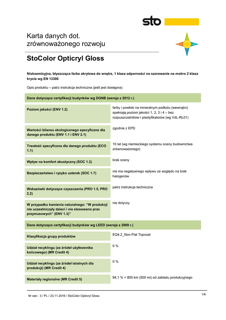 Karta danych dot. zrównoważonego rozwoju StoColor Opticryl Gloss