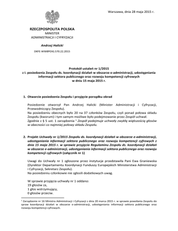 Warszawa, dnia 28 maja 2015 r. RZECZPOSPOLITA POLSKA MINISTER ADMINISTRACJI I CYFRYZACJI Andrzej Halicki DKFE-WW8POIG.570.22.2015 Protokół ustaleń nr 1/2015 z I. posiedzenia Zespołu ds. koordynacji działań w obszarze e-administracji, udostępniania informacji sektora publicznego oraz rozwoju kompetencji cyfrowych w dniu 15 maja 2015 r. 1. Otwarcie posiedzenia Zespołu i przyjęcie porządku obrad Posiedzenie otworzył Pan Andrzej Halicki (Minister Administracji i Cyfryzacji, Przewodniczący Zespołu). Na posiedzeniu obecnych było 20 na 37 członków Zespołu, czyli ponad połowa składu Zespołu (kworum) i tym samym możliwe było podejmowanie przez Zespół uchwał. Zgodnie z § 5 ust. 1 zarządzenia 1 Zespół podejmuje uchwały zwykłą większością głosów w obecności co najmniej połowy składu Zespołu. 2. Projekt Uchwały nr 1/2015 Zespołu ds. koordynacji działań w obszarze e-administracji, udostępniania informacji sektora publicznego oraz rozwoju kompetencji cyfrowych z dnia 15 maja 2015 r. w sprawie przyjęcia Regulaminu Zespołu ds. koordynacji działań w obszarze e-administracji, udostępniania informacji sektora publicznego oraz rozwoju kompetencji cyfrowych (załącznik nr 1) Uwagi do Uchwały nr 1 zgłoszone przez instytucje przedstawiła Pani Ewa Graniewska (Dyrektor Departamentu Koordynacji Funduszy Europejskich Ministerstwa Administracji i Cyfryzacji, Sekretarz Zespołu). Na posiedzeniu członkowie nie zgłosili dodatkowych uwag. W sprawie przyjęcia uchwały nr 1 oddano: 19 głosów za, 1 głos wstrzymujący, 0 głosów przeciw. Zarządzenie nr 16 Ministra Administracji i Cyfryzacji z dnia 20 marca 2015 r. w sprawie powołania Zespołu do spraw koordynacji działań w obszarze e-administracji, udostępniania informacji sektora publicznego oraz rozwoju kompetencji cyfrowych. 1 Konkluzja: Uchwała została przyjęta. 3. Projekt Uchwały nr 2/2015 Zespołu ds. koordynacji działań w obszarze e-administracji, udostępniania informacji sektora publicznego oraz rozwoju kompetencji cyfrowych z dnia 15 maja 2015 r. w sprawie przyjęcia rekomendacji do kryteriów wyboru projektów z zakresu usług elektronicznych (załącznik nr 2) Zgłoszone uwagi do uchwały przedstawiła Pani Anna Romanowska (Zastępca Dyrektora Departamentu Koordynacji Funduszy Europejskich Ministerstwa Administracji i Cyfryzacji). Pan Kazimierz Karolczak (Członek Zarządu Województwa Śląskiego) zaproponował, iż w rekomendacjach powinien pozostać warunek udostępniania danych w jednym z kryteriów wyboru projektów z zakresu usług elektronicznych. Przewodniczący Zespołu Pan Andrzej Halicki zapewnił, że uwaga zostanie uwzględniona w rekomendacjach. Pan Jan Maciej Czajkowski (przedstawiciel Komisji Wspólnej Rządu i Samorządu) zgłosił uwagę, aby zapisać w rekomendacjach, że projekty będą zgodne z Rozporządzeniem Rady Ministrów z dnia 12 kwietnia 2012 r. w sprawie Krajowych Ram Interoperacyjności, minimalnych wymagań dla rejestrów publicznych i wymiany informacji w postaci elektronicznej oraz minimalnych wymagań dla systemów teleinformatycznych. Przewodniczący Zespołu Pan Andrzej Halicki zapewnił, że uwaga zostanie uwzględniona w rekomendacjach. Pan Michał Bukowski (przedstawiciel DI-MAC) zadał pytanie, czy rekomendacje odnoszą się do całości administracji publicznej. Pan Andrzej Halicki odpowiedział, że rekomendacje dotyczą całej administracji publicznej. W sprawie przyjęcia uchwały nr 2 oddano: 19 głosów za, 1 głos wstrzymujący, 0 głosów przeciw. Konkluzja: Uchwała została przyjęta z poprawkami. 4. Projekt Uchwały nr 3/2015 Zespołu ds. koordynacji działań w obszarze e-administracji, udostępniania informacji sektora publicznego oraz rozwoju kompetencji cyfrowych z dnia 15 maja 2015 r. w sprawie przyjęcia rekomendacji do kryteriów wyboru projektów z zakresu digitalizacji (załącznik nr 3) Zgłoszone uwagi do uchwały przedstawił Pan Szymon Sankiewicz (DKFE-MAC). Ministerstwo Administracji i Cyfryzacji ul. Królewska 27, 00-060 Warszawa Na posiedzeniu członkowie nie zgłosili dodatkowych uwag. W sprawie przyjęcia uchwały nr 2 oddano: 20 głosów za, 0 glos wstrzymujący, 0 głosów przeciw. Konkluzja: Uchwała została przyjęta jednogłośnie 5. Informacja nt. prac podzespołów Pani Joanna Boćkowska, (DKFE-MAC) przedstawiła podstawę prawną działania podzespołów, propozycję głównych tematów prac podzespołów oraz aktualny stan zgłoszeń oraz poinformowała, że do członków Zespołu drogą elektroniczną ponownie zostanie skierowana prośba o zgłaszanie tematów i składu poszczególnych podzespołów. 6. Sprawy różne i zakończenie posiedzenia Pan Jan Maciej Czajkowski (KWRiST) poprosił, aby dla członków zespołu i podzespołów na określonej stronie internetowej umieszczać dokumenty, nad którymi będzie pracował Zespół i podzespoły. Pan Roman Dmowski (Podsekretarz Stanu w Ministerstwie Administracji i Cyfryzacji) zgodził się z ww. propozycją na stronie Ministerstwa zostanie utworzona w najbliższym czasie zakładka na temat Zespołu. Ponadto stwierdził, że podzespoły powinny się zająć mechanizmami wymiany informacji o projektach realizowanych w całej Polsce oraz parametrami, na podstawie których będzie można opisywać projekty i na tej podstawie stworzyć bazę projektów. Pani Anna Duńczyk-Szulc (MKiDN) zaproponowała połączenie Podzespołu do spraw udostępniana informacji sektora publicznego w zakresie zasobów nauki oraz Podzespołu do spraw udostępniania informacji sektora publicznego w zakresie zasobów kultury. Pan Roman Dmowski zaproponował, by oba podzespoły w zależności od tematu prac obradowały wspólnie . Konkluzje: Zostanie stworzona zakładka na stronie Ministerstwa Administracji i Cyfryzacji, na której będą umieszczane materiały. I posiedzenie Podzespołu do spraw udostępniana informacji sektora publicznego w zakresie zasobów nauki oraz Podzespołu do spraw