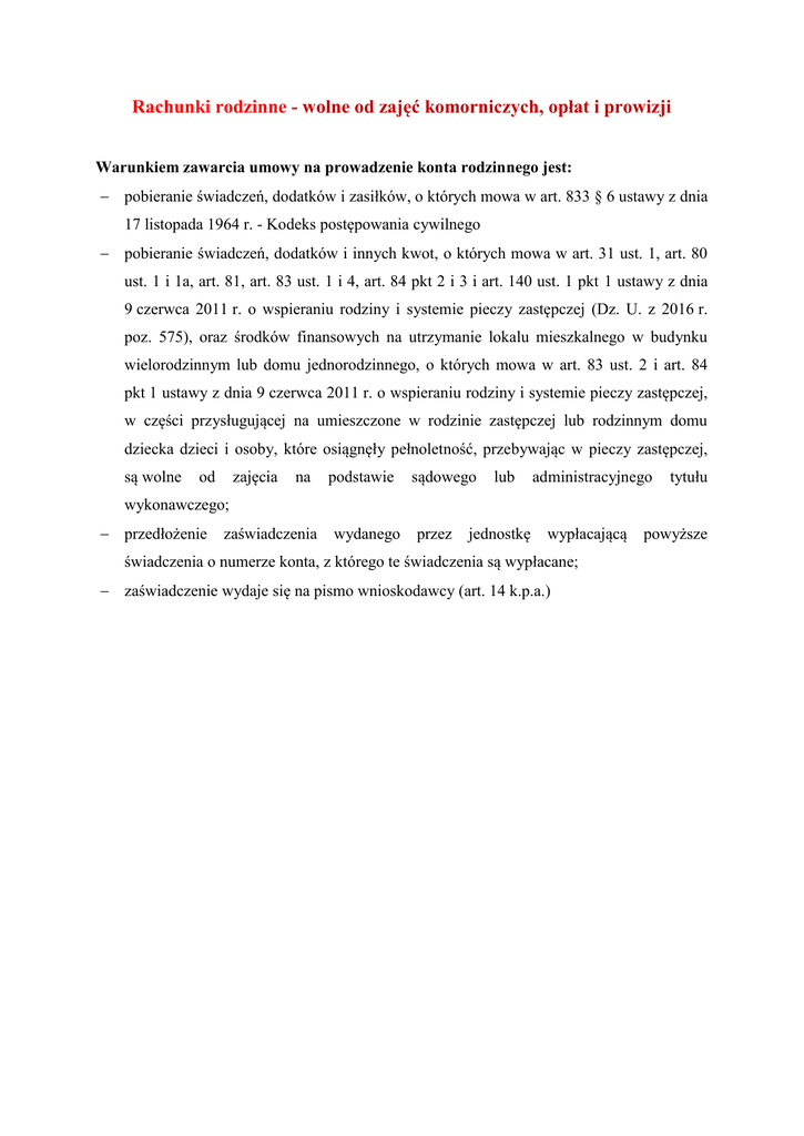 Rachunki rodzinne - wolne od zajęć komorniczych, opłat i prowizji Warunkiem zawarcia umowy na prowadzenie konta rodzinnego jest:  pobieranie świadczeń, dodatków i zasiłków, o których mowa w art. 833 § 6 ustawy z dnia 17 listopada 1964 r. - Kodeks postępowania cywilnego  pobieranie świadczeń, dodatków i innych kwot, o których mowa w art. 31 ust. 1, art. 80 ust. 1 i 1a, art. 81, art. 83 ust. 1 i 4, art. 84 pkt 2 i 3 i art. 140 ust. 1 pkt 1 ustawy z dnia 9 czerwca 2011 r. o wspieraniu rodziny i systemie pieczy zastępczej (Dz. U. z 2016 r. poz. 575), oraz środków finansowych na utrzymanie lokalu mieszkalnego w budynku wielorodzinnym lub domu jednorodzinnego, o których mowa w art. 83 ust. 2 i art. 84 pkt 1 ustawy z dnia 9 czerwca 2011 r. o wspieraniu rodziny i systemie pieczy zastępczej, w części przysługującej na umieszczone w rodzinie zastępczej lub rodzinnym domu dziecka dzieci i osoby, które osiągnęły pełnoletność, przebywając w pieczy zastępczej, są wolne od zajęcia na podstawie sądowego lub administracyjnego tytułu wykonawczego;  przedłożenie zaświadczenia wydanego przez jednostkę wypłacającą świadczenia o numerze konta, z którego te świadczenia są wypłacane;  zaświadczenie wydaje się na pismo wnioskodawcy (art. 14 k.p.a.) powyższe