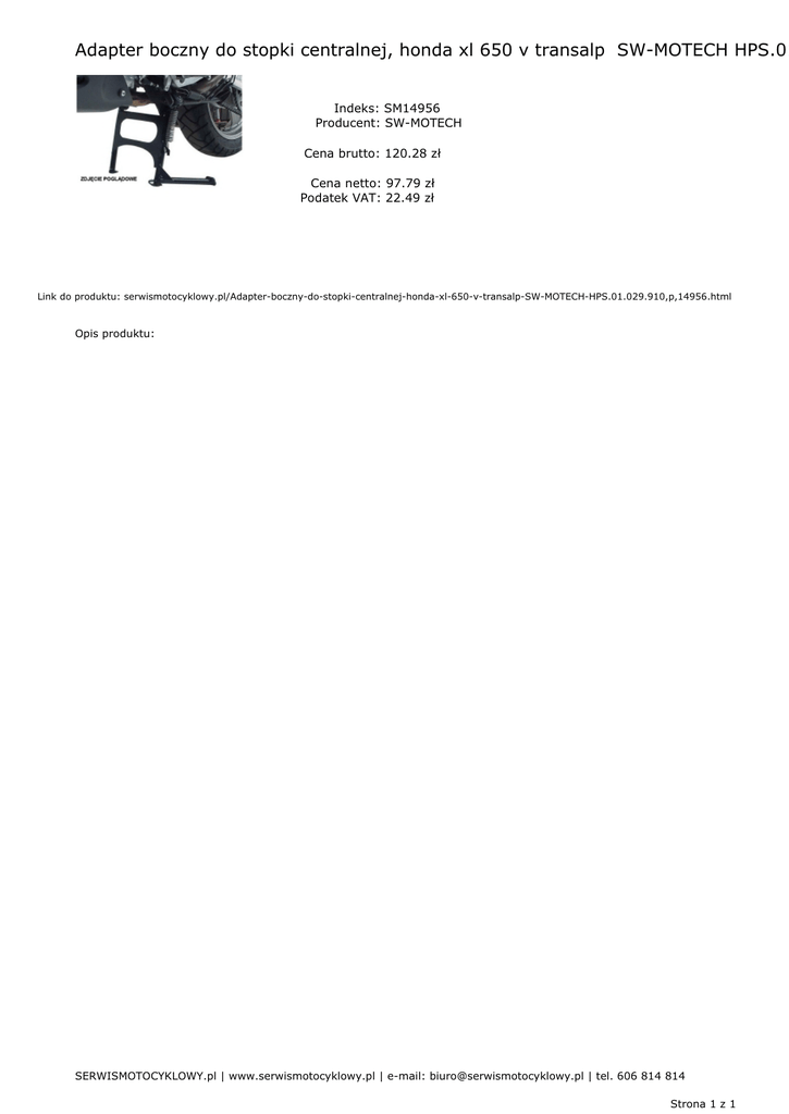 Adapter boczny do stopki centralnej, honda xl 650 v transalp SW-MOTECH HPS.01 Indeks: SM14956 Producent: SW-MOTECH Cena brutto: 120.28 zł Cena netto: 97.79 zł Podatek VAT: 22.49 zł Link do produktu: serwismotocyklowy.pl/Adapter-boczny-do-stopki-centralnej-honda-xl-650-v-transalp-SW-MOTECH-HPS.01.029.910,p,14956.html Opis produktu: SERWISMOTOCYKLOWY.pl | www.serwismotocyklowy.pl | e-mail: [email protected] | tel. 606 814 814 Strona 1 z 1