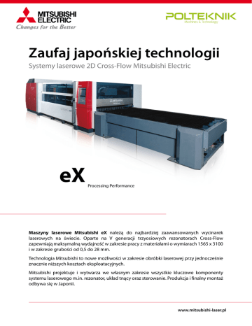 Zaufaj japońskiej technologii Systemy laserowe 2D Cross-Flow Mitsubishi Electric eX Processing Performance Maszyny laserowe Mitsubishi eX należą do najbardziej zaawansowanych wycinarek laserowych na świecie. Oparte na V generacji trzyosiowych rezonatorach Cross-Flow zapewniają maksymalną wydajność w zakresie pracy z materiałami o wymiarach 1565 x 3100 i w zakresie grubości od 0,5 do 28 mm. Technologia Mitsubishi to nowe możliwości w zakresie obróbki laserowej przy jednocześnie znacznie niższych kosztach eksploatacyjnych. Mitsubishi projektuje i wytwarza we własnym zakresie wszystkie kluczowe komponenty systemu laserowego m.in. rezonator, układ tnący oraz sterowanie. Produkcja i finalny montaż odbywa się w Japonii. www.mitsubishi-laser.pl Wycinarki laserowe Mitsubishi eX to: • • • • • wysoka wydajność doskonała jakość cięcia niezawodność niskie koszty eksploatacyjne prosta obsługa Specyfikacja techniczna Budowa maszyny Ruchoma optyka, dwa wymienne stoły Typ rezonatora Cross-Flow Mitsubishi Dostępna moc rezonatora 4500 W, 6000 W Sterowanie M700 Mitsubishi, 15’’ ekran dotykowy Maks. obszar roboczy 1565 x 3100 mm Maks. waga arkusza 930 kg Wymiary zewnętrzne 10180 x 3130 x 2260 mm Waga maszyny 10000 kg Zakres pracy osi X/Y/Z 3100/1565/150 mm Czas rozruchu 3 min Prędkość symultaniczna oś X, oś Y 140m/min Dokładność pozycjonowania 0,05/500mm (oś X,oś Y) Powtarzalność pozycjonowania 0,01mm (oś X,oś Y) Głowica PH-XS Mitsubishi, Auto Focus, soczewki 5’’, 7,5’’ oraz 10’’ Zakres cięcia 4500 W stal czarna stal nierdzewna aluminium mosiądz, miedź 6000 W 0,5 - 28 mm 0,5 - 25 mm 0,5 - 18 mm 0,5 - 6 mm stal czarna stal nierdzewna aluminium mosiądz, miedź 0,5 - 28 mm (32 mm) 0,5 - 28 mm (50 mm) 0,5 - 20 mm (25 mm) 0,5 - 6 mm Uwaga ! Zakres grubości i jakość cięcia zależy od jakości materiału wejściowego oraz od specyfiki kształtu wycinanego elementu. W przypadku mocy 6000W przy założeniu idealnych parametrów materiału wejściowego, wycinania kształtu nie powodującego ograniczeń dla obróbki laserowej oraz większej tolerancji dla chropowatości ciętej krawędzi nominalny zakres cięcia ulega zwiększeniu. W nawiasach podano możliwe do uzyskania zakresy. Do cięcia górnych zakresów stali nierdzewnej oraz aluminium wymagana jest soczewka 10’’ niezależnie od mocy rezonatora.