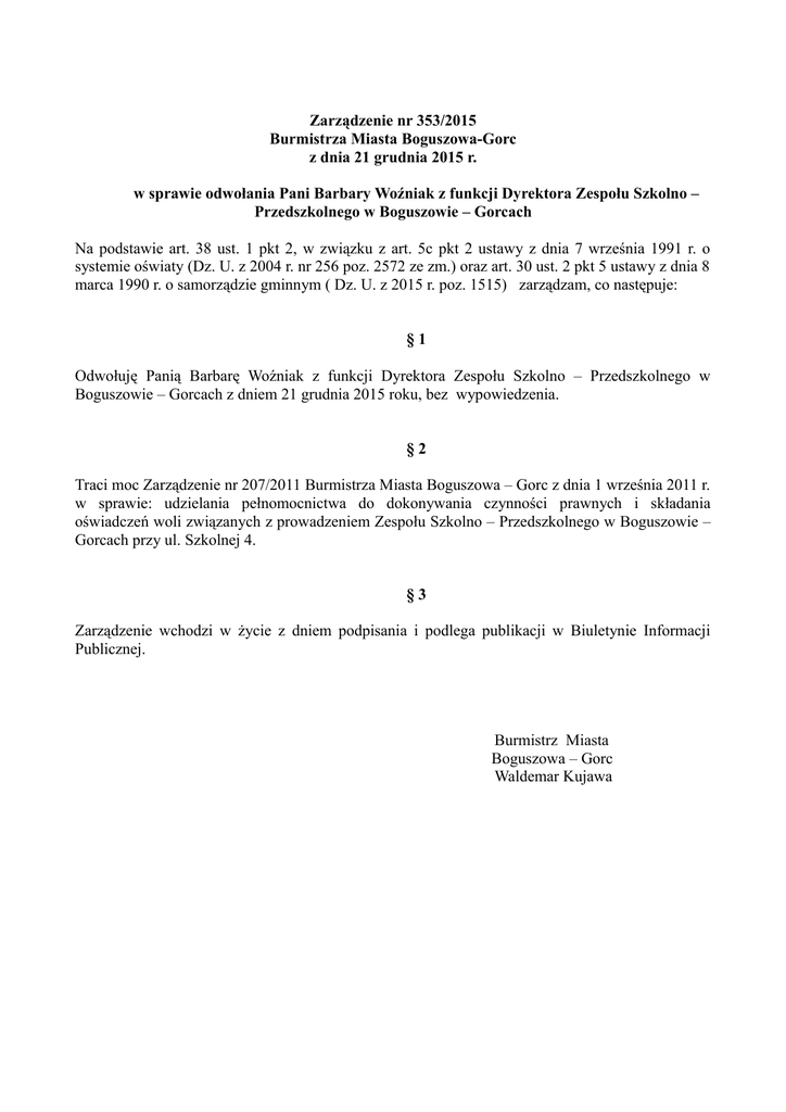 Zarządzenie nr 353/2015 Burmistrza Miasta Boguszowa-Gorc z dnia 21 grudnia 2015 r. w sprawie odwołania Pani Barbary Woźniak z funkcji Dyrektora Zespołu Szkolno – Przedszkolnego w Boguszowie – Gorcach Na podstawie art. 38 ust. 1 pkt 2, w związku z art. 5c pkt 2 ustawy z dnia 7 września 1991 r. o systemie oświaty (Dz. U. z 2004 r. nr 256 poz. 2572 ze zm.) oraz art. 30 ust. 2 pkt 5 ustawy z dnia 8 marca 1990 r. o samorządzie gminnym ( Dz. U. z 2015 r. poz. 1515) zarządzam, co następuje: §1 Odwołuję Panią Barbarę Woźniak z funkcji Dyrektora Zespołu Szkolno – Przedszkolnego w Boguszowie – Gorcach z dniem 21 grudnia 2015 roku, bez wypowiedzenia. §2 Traci moc Zarządzenie nr 207/2011 Burmistrza Miasta Boguszowa – Gorc z dnia 1 września 2011 r. w sprawie: udzielania pełnomocnictwa do dokonywania czynności prawnych i składania oświadczeń woli związanych z prowadzeniem Zespołu Szkolno – Przedszkolnego w Boguszowie – Gorcach przy ul. Szkolnej 4. §3 Zarządzenie wchodzi w życie z dniem podpisania i podlega publikacji w Biuletynie Informacji Publicznej. Burmistrz Miasta Boguszowa – Gorc Waldemar Kujawa Uzasadnienie do Zarządzenia nr 353/2015 Burmistrza Miasta Boguszowa-Gorc z dnia 21 grudnia 2015 r. Organem uprawnionym do odwołania nauczyciela ze stanowiska Zespołu Szkolno – Przedszkolnego w Boguszowie – Gorcach jest organ, który powierzył nauczycielowi stanowisko dyrektora w szkole, czyli organ prowadzący. Zgodnie z art. 38 ust. 1 pkt 2 ustawy o systemie oświaty organ prowadzący szkołę w przypadkach szczególnie uzasadnionych może odwołać nauczyciela ze stanowiska kierowniczego w czasie roku szkolnego bez wypowiedzenia po uzyskaniu opinii właściwego organu nadzoru pedagogicznego – Dolnośląskiego Kuratora Oświaty. W dniu 8 grudnia 2015 r. Burmistrz Miasta Boguszowa – Gorc złożył wniosek nr 074.1612.15 z dnia 7 grudnia 2015 r. o opinię w sprawie odwołania Pani Barbary Woźniak z funkcji Dyrektora Zespołu Szkolno – Przedszkolnego Dolnośląskiemu Kuratorowi Oświaty we Wrocławiu w jego siedzibie. Przedmiotowa opinia winna być wydana do dnia 14 grudnia 2015 r. Do dnia upływu terminu tj. 14 grudnia 2015 r. Kurator Oświaty przedmiotowej opinii nie wydał, co jest równoznaczne zgodnie z obowiązującymi przepisami, z wydaniem opinii pozytywnej. W przedmiotowej sprawie zachodzą szczególne przesłanki do odwołania dyrektora Zespołu Szkolno – Przedszkolnego, o których mowa w w/w przepisie. Słuszność postępowania Burmistrza Miasta Boguszowa – Gorc w tej sprawie potwierdza analiza istniejącego orzecznictwa Sądu Najwyższego i Sądów administracyjnych, gdzie za szczególnie uzasadnione przypadki uzasadniające odwołanie dyrektora należy uznać zdarzenia wyjątkowe, mające przy tym charakter niedopełnienia obowiązków lub naruszenia uprawnień określonych prawem, powodujących destabilizację w realizacji funkcji dydaktycznej, wychowawczej i oświatowej szkoły i z tej przyczyny konieczne jest natychmiastowe zaprzestanie wykonywania funkcji dyrektora albowiem dalsze pełnienie funkcji godzi w interes szkoły jako interesu publicznego (wyrok NSA z 9 maja 2001 r., I SA 3293/00 – Prawo pracy 2001, nr 9 poz. 41; wyrok NSA z dnia 18 kwietnia 2008 r., I OSK 86/08, LEX nr 470925; wyrok I SA/Wa 1854/09, LEX nr 619808; wyrok NSA z dnia 29 lipca 2010 r., I OSK 525/10, LEX nr 595413). W ocenie organu prowadzącego pozostawienie Pani Barbary Woźniak na stanowisku dyrektora Zespołu Szkolno - Przedszkolnego do dnia 31 sierpnia 2016 roku zagraża interesowi publicznemu. Pani Barbara Woźniak popełniła między innymi następujące działania przeciwko interesowi publicznemu: 1. Dopuściła się poświadczenia nieprawdy w 5 dziennikach lekcyjnych w roku szkolnym 2015/2016 polegającego na wpisaniu do dzienników lekcyjnych tematów zajęć i na złożeniu własnoręcznych podpisów poświadczających ten fakt. Zajęć tych jako obowiązkowego pensum nie odbyła, natomiast obowiązek prowadzenia tych zajęć scedowała na innych nauczycieli informując ich, że za te godziny otrzymają zapłatę jako godziny dodatkowe. Jednocześnie sama pobrała wynagrodzenie za niezrealizowane godziny lekcyjne. 2. Naruszyła prawa pracownicze wobec nauczycieli Zespołu Szkolno – Przedszkolnego w Boguszowie - Gorcach, oraz dopuściła się niepożądanych zachowań takich jak: nierówne traktowanie, zastraszanie, upokarzanie, dyskredytowanie, ośmieszanie, stosowanie szantażu emocjonalnego, wykorzystanie hospitacji do innych celów niż wynika to z nadzoru pedagogicznego. Powyższe stwierdzenia wynikają z wniosków Komisji powołanej Zarządzeniem nr 280/2015 Burmistrza Miasta Boguszowa – Gorc z dnia 5 października 2015 roku, której zadaniem było przeprowadzenie postępowania wyjaśniającego w celu ustalenia ewentualnych przejawów mobbingu lub dyskryminacji w działaniach dyrektora Zespołu Szkolno – Przedszkolnego. Powyższa komisja stwierdza między innymi: - pani Woźniak jako pracodawca stosuje autokratyczne metody zarządzania, wywołujące atmosferę strachu i niepokoju wśród pracowników, narzucając własne rozwiązania, nie dopuszczając do prezentowania własnych rozwiązań przez nauczycieli, - metody zarządzania zespołem stosowane przez panią dyrektor wywołują u wielu pracowników szkoły oraz obsługi cierpienia emocjonalne, stany lękowe i depresyjne, - co najmniej kilkukrotnie naruszyła prawa pracownicze np.: przez nieudzielenie przysługujących pracownicy praw związanych z urodzeniem dziecka, jak też uniemożliwienie skorzystania pracownikom ukaranym karą porządkową z możliwości odwołania się od niej (w kontekście użytego wobec nich szantażu polegającego na groźbie utraty pracy). - niektóre działania podejmowane przez panią dyrektor w stosunku do co najmniej jednego nauczyciela, mogą nosić znamiona mobbingu. 3. Doprowadziła do podziału grona nauczycielskiego oraz przyczyniła si