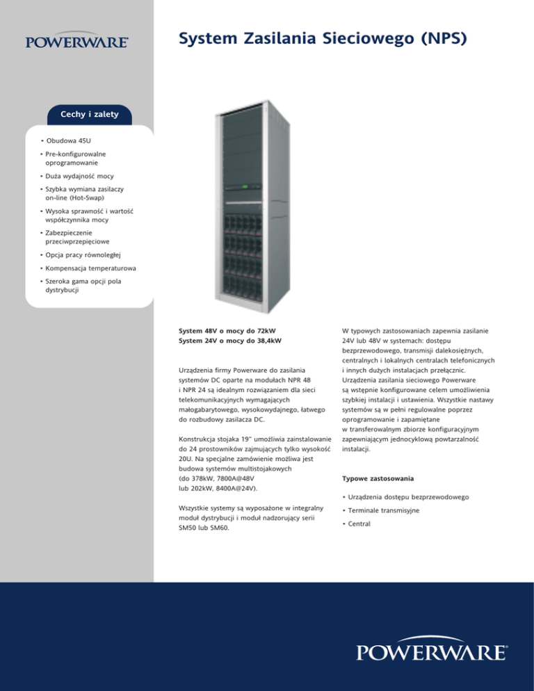 System Zasilania Sieciowego (NPS) Cechy i zalety • Obudowa 45U • Pre-konfigurowalne oprogramowanie • Du˝a wydajnoÊç mocy • Szybka wymiana zasilaczy on-line (Hot-Swap) • Wysoka sprawnoÊç i wartoÊç wspó∏czynnika mocy • Zabezpieczenie przeciwprzepi´ciowe • Opcja pracy równoleg∏ej • Kompensacja temperaturowa • Szeroka gama opcji pola dystrybucji System 48V o mocy do 72kW System 24V o mocy do 38,4kW Urzàdzenia firmy Powerware do zasilania systemów DC oparte na modu∏ach NPR 48 i NPR 24 sà idealnym rozwiàzaniem dla sieci telekomunikacyjnych wymagajàcych ma∏ogabarytowego, wysokowydajnego, ∏atwego do rozbudowy zasilacza DC. Konstrukcja stojaka 19” umo˝liwia zainstalowanie do 24 prostowników zajmujàcych tylko wysokoÊç 20U. Na specjalne zamówienie mo˝liwa jest budowa systemów multistojakowych (do 378kW, 7800A@48V lub 202kW, 8400A@24V). W typowych zastosowaniach zapewnia zasilanie 24V lub 48V w systemach: dost´pu bezprzewodowego, transmisji dalekosi´˝nych, centralnych i lokalnych centralach telefonicznych i innych du˝ych instalacjach prze∏àcznic. Urzàdzenia zasilania sieciowego Powerware sà wst´pnie konfigurowane celem umo˝liwienia szybkiej instalacji i ustawienia. Wszystkie nastawy systemów sà w pe∏ni regulowalne poprzez oprogramowanie i zapami´tane w transferowalnym zbiorze konfiguracyjnym zapewniajàcym jednocyklowà powtarzalnoÊç instalacji. Typowe zastosowania • Urzàdzenia dost´pu bezprzewodowego Wszystkie systemy sà wyposa˝one w integralny modu∏ dystrybucji i modu∏ nadzorujàcy serii SM50 lub SM60. • Terminale transmisyjne • Central System Zasilania Sieciowego (NPS) System Zasilania Sieciowego (NPS) – dane techniczne Zasilanie AC Wspó∏czynnik mocy SprawnoÊç Zakres napi´ç wyjÊciowych DC Maksymalna moc wyjÊciowa DC Zakres temperatur roboczych Wymiary (wys. x szer. x g∏.) Waga Modu∏ sterownika Modu∏ dystrybucji AC Modu∏ dystrybucji DC Opcje Modu∏ dystrybucji DC (MCB) 400-415V, 50/60 Hz (znamionowe) >0.99 (w zakresie 20 – 100 % pràdu wyjÊciowego) 48V: >90% dla 20-100% pràdu wyjÊciowego >92% dla 30-85% pràdu wyjÊciowego 24V: >88% dla 30-100% pràdu wyjÊciowego >89% dla 50-100% pràdu wyjÊciowego 48V: 40 – 58 V 24V: 20 – 29 V 48V: 72kW, 1500A @ 48V 378kW, 7875A @ 48V (na zamówienie dost´pny system multi-stojakowy) 24V: 38,4kW, 1500A @ 24V 202kW, 7875A @ 24V (na zamówienie dost´pny system multi-stojakowy) 48V: -25°C – +50°C (wartoÊç maksymalnego pràdu jest ograniczona powy˝ej temperatury 40°C lub gdy zainstalowane sà opcjonalne ekrany przeciw insektom) 24V: -25°C – +70°C (wartoÊç maksymalnego pràdu jest ograniczona powy˝ej tempeatury 50°C lub gdy zainstalowane sà opcjonalne ekrany przeciw insektom) 45U: 2100mm [82.7”], 600mm [23.6”], 600mm [23.6”] 300kg [660 lb] Typowo dla konfiguracji z 24 prostownikami SM50 lub SM60 ACD z roz∏àcznikiem AC i ochronnikami przeciwprzepi´ciowymi Opis w opcjach DCM1600/2400: DCM1010/1610: 16 lub 24 wyjÊç z miniaturowymi zabezpieczeniami MCB 10 lub 16 wyjÊç dla obcià˝eƒ, 4 szt dla baterii, miniaturowych zabezpieczeƒ MCB Modu∏ dystrybucji DC (bezpieczniki) DCF1000: 10 wyjÊç, zabezpieczenia du˝ej mocy DIN00 (NH00) z bezpiecznikami HRC DCF0600/0601/0602: 6 wyjÊç, zabezpieczenia DIN00 (NH00), DIN1 (NH01) lub DIN2 (NH02) z bezpiecznikami HRC DCF0403: 4 wyjÊcia, DIN3 (NH03) z bezpiecznikami HRC Roz∏àczniki g∏´bokiego roz∏adowania RGR LVD801: 1 x 800A (pojedynczy zespó∏ RGR) (LVD-Low Voltage Disconector) LVD801: 1 x 800A (pojedynczy zespó∏ RGR) LVD802: 2 x 800A (dwa zespo∏y RGR) LVD1201: 1 x 1200A (pojedynczy zespó∏ RGR) LVD1202: 2 x 1200A (dwa zespo∏y RGR) ZaÊlepka prostownika W miejscach bez prostowników ZaÊlepka do stojaka W miejscach pustych w stojaku Power Manager II Oprogramowanie do zdalnego monitorowania i regulacji DC Tools Oprogramowanie konfiguracyjne. Bezp∏atny download ze strony www.powerware.com/downloads Pe∏na specyfikacja dost´pna jest w firmie Powerware S.A. oddzia∏ w Polsce. Certyfikaty Wszystkie produkty spe∏niajà wymagania mi´dzynarodowych norm. Szczegó∏owe informacje na temat poszczególnych wersji produktów i spe∏nianych wymagaƒ certyfikatów bezpieczeƒstwa i kompatybilnoÊci elektromagnetycznej (EMC) dost´pne sà w biurze Powerware S.A.: Region Europa Nowa Zelandia / Australia Chiny Certyfikat CE C-tick, Telepermit MII Ze wzgl´du na ciàg∏e ulepszenia produktów wszystkie specyfikacje mogà ulec zmianie bez uprzedzenia. Powerware S.A. Oddzia∏ w Polsce Ul. ChroÊcickiego 93/105, 02-414 Warszawa Tel. +48 22 331 85 24 Fax +48 22 331 85 16 e-mail: [email protected] www.powerware.pl NPS A