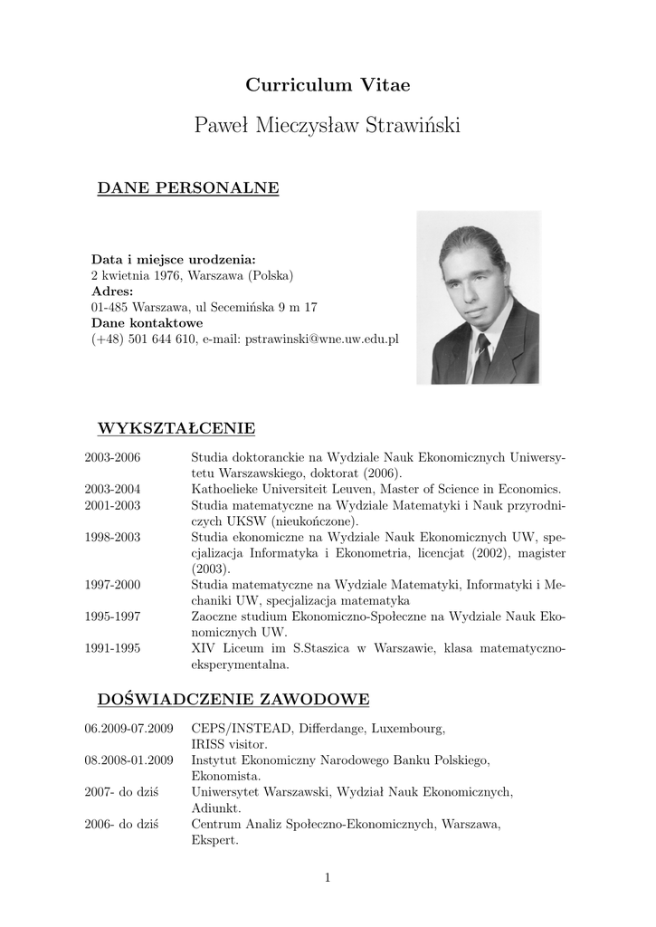Curriculum Vitae Paweł Mieczysław Strawiński DANE PERSONALNE Data i miejsce urodzenia: 2 kwietnia 1976, Warszawa (Polska) Adres: 01-485 Warszawa, ul Secemińska 9 m 17 Dane kontaktowe (+48) 501 644 610, e-mail: [email protected] WYKSZTAŁCENIE 2003-2006 2003-2004 2001-2003 1998-2003 1997-2000 1995-1997 1991-1995 Studia doktoranckie na Wydziale Nauk Ekonomicznych Uniwersytetu Warszawskiego, doktorat (2006). Kathoelieke Universiteit Leuven, Master of Science in Economics. Studia matematyczne na Wydziale Matematyki i Nauk przyrodniczych UKSW (nieukończone). Studia ekonomiczne na Wydziale Nauk Ekonomicznych UW, specjalizacja Informatyka i Ekonometria, licencjat (2002), magister (2003). Studia matematyczne na Wydziale Matematyki, Informatyki i Mechaniki UW, specjalizacja matematyka Zaoczne studium Ekonomiczno-Społeczne na Wydziale Nauk Ekonomicznych UW. XIV Liceum im S.Staszica w Warszawie, klasa matematycznoeksperymentalna. DOŚWIADCZENIE ZAWODOWE 06.2009-07.2009 08.2008-01.2009 2007- do dziś 2006- do dziś CEPS/INSTEAD, Differdange, Luxembourg, IRISS visitor. Instytut Ekonomiczny Narodowego Banku Polskiego, Ekonomista. Uniwersytet Warszawski, Wydział Nauk Ekonomicznych, Adiunkt. Centrum Analiz Społeczno-Ekonomicznych, Warszawa, Ekspert. 1 INNE DOŚWIADCZENIA 2007- do dziś 2007 2005- do dziś 2002-2012 2000-2001 2000-2002 1999-2002 Członek założyciel i Przewodniczący Komisji Rewizyjnej Stowarzyszenia Absolwentów WNE UW ”Ceteris Paribus”. Członek założyciel Samorządu Doktorantów Uniwersytetu Warszawskiego. Członek Rady Wydziału WNE UW. Elektor Uniwersytetu Warszawskiego. Członek Parlamentu Studentów Uniwersytetu Warszawskiego. Członek Zarządu Samorządu Studentów WNE UW. Członek Założyciel i Prezes Bemowskiej Ligi Szóstek Piłkarskich amatorskie rozgrywki piłkarskie, współpraca z władzami lokalnymi. NAJWAŻNIEJSZE PUBLIKACJE 2009 2009 2009 2009 2008 2008 2006 współautor raportu KRASP ”Polskie Szkolnictwo Wyższe. Stan, Uwarunkowania, Perspektywy, Warszawa 2009, WUW. P.Strawiński ”External Return to Education in Europe”, IRISS Working Paper. P.Strawiński ”External Return to Education” w B.Liberda [eds] Civilizational Competences and Regional Development in Poland, Warszawa 2009. P.Strawiński ”Zewnętrzny zwrot z edukacji”, Gospodarka Narodowa 5-6/2009. P.Strawiński ”Czy opłaca się studiować?. Wyniki modelu inwestycyjnego.”, Ekonomista 4/2008, pp. 535-553. P.Strawiński ”Struktura i finansowanie szkolnictwa wyższego w Polsce”, Wiadomości Statystyczne 4/2008. P.Strawiński ”Czy w Polsce opłaca się studiować?”, Ekonomista 6/2006. ZAINTERESOWANIA brydż sportowy, piłka nożna. 2