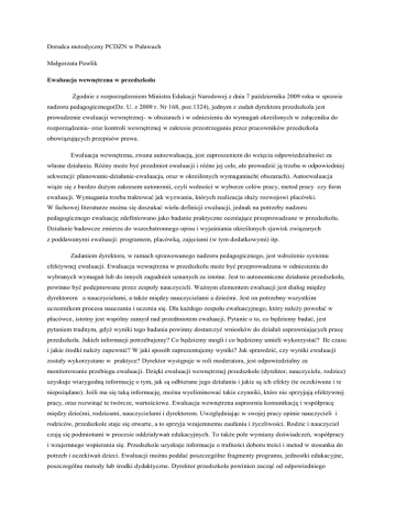 Doradca metodyczny PCDZN w Puławach Małgorzata Pawlik Ewaluacja wewnętrzna w przedszkolu Zgodnie z rozporządzeniem Ministra Edukacji Narodowej z dnia 7 października 2009 roku w sprawie nadzoru pedagogicznego(Dz. U. z 2009 r. Nr 168, poz.1324), jednym z zadań dyrektora przedszkola jest prowadzenie ewaluacji wewnętrznej- w obszarach i w odniesieniu do wymagań określonych w załączniku do rozporządzenia- oraz kontroli wewnętrznej w zakresie przestrzegania przez pracowników przedszkola obowiązujących przepisów prawa. Ewaluacja wewnętrzna, zwana autoewaluacją, jest zaproszeniem do wzięcia odpowiedzialności za własne działania. Różny może być przedmiot ewaluacji i różne jej cele, ale prowadzić ją trzeba w odpowiedniej sekwencji: planowanie-działanie-ewaluacja, oraz w określonych wymaganiach( obszarach). Autoewaluacja wiąże się z bardzo dużym zakresem autonomii, czyli wolności w wyborze celów pracy, metod pracy czy form ewaluacji. Wymagania trzeba traktować jak wyzwania, których realizacja służy rozwojowi placówki. W fachowej literaturze można się doszukać wielu definicji ewaluacji, jednak na potrzeby nadzoru pedagogicznego ewaluację zdefiniowano jako badanie praktyczne oceniające przeprowadzane w przedszkolu. Działanie badawcze zmierza do wszechstronnego opisu i wyjaśniania określonych zjawisk związanych z poddawanymi ewaluacji: programem, placówką, zajęciami (w tym dodatkowymi) itp. Zadaniem dyrektora, w ramach sprawowanego nadzoru pedagogicznego, jest wdrożenie systemu efektywnej ewaluacji. Ewaluacja wewnętrzna w przedszkolu może być przeprowadzana w odniesieniu do wybranych wymagań lub do innych zagadnień uznanych za istotne. Jest to autonomiczne działanie przedszkola, powinno być podejmowane przez zespoły nauczycieli. Ważnym elementem ewaluacji jest dialog między dyrektorem a nauczycielami, a także między nauczycielami a dziećmi. Jest on potrzebny wszystkim uczestnikom procesu nauczania i uczenia się. Dla każdego zespołu ewaluacyjnego, który należy powołać w placówce, istotny jest wspólny zamysł nad przedmiotem ewaluacji. Pytanie o to, co będziemy badać, jest pytaniem trudnym, gdyż wyniki tego badania powinny dostarczyć wniosków do działań usprawniających pracę przedszkola. Jakich informacji potrzebujemy? Co będziemy mogli i co będziemy umieli wykorzystać? Ile czasu i jakie środki należy zapewnić? W jaki sposób zaprezentujemy wyniki? Jak sprawdzić, czy wyniki ewaluacji zostały wykorzystane w praktyce? Dyrektor występuje w roli moderatora, jest odpowiedzialny za monitorowanie przebiegu ewaluacji. Dzięki ewaluacji wewnętrznej przedszkole (dyrektor, nauczyciele, rodzice) uzyskuje wiarygodną informację o tym, jak są odbierane jego działania i jakie są ich efekty (te oczekiwane i te niepożądane). Jeśli ma się taką informację, można wyeliminować takie czynniki, które nie sprzyjają efektywnej pracy, oraz rozwinąć te twórcze, wartościowe. Ewaluacja wewnętrzna usprawnia komunikację i współpracę między dziećmi, rodzicami, nauczycielami i dyrektorem. Uwzględniając w swojej pracy opinie nauczycieli i rodziców, przedszkole staje się otwarte, a to sprzyja wzajemnemu zaufaniu i życzliwości. Rodzic i nauczyciel czują się podmiotami w procesie oddziaływań edukacyjnych. To także pole wymiany doświadczeń, współpracy i wzajemnego wspierania się. Przedszkole uzyskuje informacje o trafności doboru treści i metod w stosunku do potrzeb i oczekiwań dzieci. Ewaluacji można poddać poszczególne fragmenty programu, jednostki edukacyjne, poszczególne metody lub środki dydaktyczne. Dyrektor przedszkola powinien zacząć od odpowiedniego przygotowania nauczycieli. Do prowadzenia ewaluacji potrzebne są odpowiednia wiedza i umiejętności. Można wykorzystać w tym celu doświadczenie, wiedzę i umiejętności pracowników przedszkola lub zaprosić do pomocy eksperta z zewnątrz. Projektowanie ewaluacji wewnętrznej Definiowanie przedmiotu ewaluacji- co ewaluujesz, co chcesz zbadać, po co ewaluujesz, czego chcesz się dowiedzieć? Sformułowanie pytań kluczowych- na jakie pytanie chcesz uzyskać odpowiedź? Sformułowanie kryteriów ewaluacji- które informacje są dla ciebie użyteczne? Dobór metod badawczych- jakich metod, technik, narzędzi użyjesz podczas przeprowadzania ewaluacji? Określenie próby badawczej- kto będzie badany, jak liczne będą grupy? Harmonogram- terminy kolejnych działań w ramach ewaluacji i odpowiedzialni za wykonanie. Określenie formy analizy i prezentacji danych. Dobór metod zależy od tego, co poddaje się badaniu, oraz od funkcji, jakie ma pełnić ewaluacja. O tym, jakie zastosować metody i techniki zbierania, a potem analizowania informacji, decyduje wyłącznie ten, kto przeprowadza ewaluację. Najczęściej stosowanymi technikami zbierania danych są wywiady grupowe, wywiady indywidualne, swobodne rozmowy, omówienia zajęć edukacyjnych w zespole, wywiady kwestionariuszowe, ankiety, analiza wypowiedzi i prac dzieci (np. prac plastycznych, gazetek ściennych, innej dziecięcej twórczości). Badanie ewaluacyjne zawsze jest odpowiedzią na konkretne i aktualne potrzeby, dlatego musi być dobrze przemyślane i starannie przygotowane, aby jego wyniki stały się wartościową i rzeczywistą pomocą w pracy przedszkola. Bibliografia • D. Elsner, M. Nawrot, "Projekt ewaluacyjny w przedszkolu. Pierwsze przemyślenia". „Management w przedszkolu”, Wydawnictwo Raabe, luty 2010. • G. Mazurkiewicz(red.), ”Ewaluacja w nadzorze pedagogicznym- Autonomia”, Kraków 2010. • Ustawa o systemie oświaty – Ustawa z 7 września 1991 r. o systemie oświaty (tekst jedn.: DzU 04.256.2572 ze zm.); • Rozp. MEN o nadzorze pedagogicznym – Rozporządzenie Ministra Edukacji Narodowej z 7 października 2009 r. w sprawie nadzoru pedagogicznego (Dz.U. 09.168.1324).