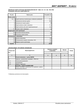 ZBIORCZA KARTA WYKAZU MATERIAŁÓW NR KP / 1002 / Z1 / C1 / 09 - PK1-PW POSADZKI ZAPLECZ SANITARNYCH Nr pom. Nazwa pom. Posadzki m2 Strefy sanitarne 1/4, 1/5 Zespół szatniowy koedukacyjny z kabinami przebieralni 111,4 35,2 1/7 Natryskownia damska ogólna 36 1/6 Natryskownia męska ogólna 1/8 Węzeł sanitarny matki z dzieckiem 11,3 1/9 Węzeł sanitarny dla osób niepełnosprawnych 20,3 1/11 Korytarz matki z dzieckiem 3,2 Zespół szatni boisk sportowych 1/41 Umywalnia damska pboiska 8,8 1/43 Umywalnia męska boiska 8,4 Pomieszczenia ratowników 1/21 DyŜurka ratowników 16,6 1/19 Pomieszczenie socjalne ratowników i WC 12,2 1/20 Magazyn sprzetu sportowego 13,5 Łącznie 276,9 USZCZELNIENIE I WYŁOśENIE CERAMICZNE Wyszczególnienie Grupa mat./ Dostawa urządzeń i materiałów MontaŜ Uwagi Poz. 2 1 3. Chemia budowlana - system MAPEI 3.1 Zaplecza - powierzchnia posadzek - 276,9 m2 3.1.1 Wyrównanie powierzchni 3.1.2 Uszczelnienie 3.1.3 4. Klejenie i fugowanie Ceramika - system KLINKER SIRE Zestaw materiałów ceramicznych do wyłoŜenia zaplecz powierzchnia 276,9 m2 4.1 3 4 5 6 *3 *3 Materiały wymienione lub równorzędne ________________________________________________________________________________________________ Kraków, 2009.04.17 Wszelkie prawa zastrzeŜone KARTA WYKAZU MATERIAŁÓW NR KP / 1002 / Z1 / C1 / 09 - PK1-PW ZAPLECZA SANITARNE 3.1 ZESTAW MATERIAŁÓW CHEMII BUDOWLANEJ DO USZCZELNIENIA I WYŁOśENIA ZAPLECZ SANITARNYCH Powierzchnia posadzek zaplecz sanitarnych 276,9 CHEMIA BUDOWLANA MAPEI Poz. Warstwa Produkt Funkcja stosowania 1 2 Ilość całkow. Nr art. Kod ZuŜycie kg/l/szt Ref. jednost /m2 3 4 5 6 3.1.1. WYRÓWNANIE POWIERZCHNI 3.1.1.1 Listwy prowadzące (mb) 51 mb 3.1.1.2 Masa montaŜowa - Planitop 400 Opakowanie: worki 25 kg 65 kg 3.1.13 Masa wyrównawcza z PLANICRETE Cena za 1m2 wyrównania o średniej grubości 10mm Opakowania: karnistry 25kg 3.1.2 WARSTWA USZCZELNIAJĄCA 3.1.2.1 MAPELASTIC Opakowania: worki + pojemniki (24+8) Elastyczna masa uszczelniająca (kg) 3.1.2.2 MAPEFLEX PU30 Opakowania: pojemnik 5kg Dwukompletowa masa (A+B) do doszczelniania przepustów (kg) 3.1.2.3 MAPEBAND Taśma uszczelniająca o szer. 12 cm do naroŜy i przepustów (mb) 3.1.3 KLEJ I FUGA DO CERAMIKI PLAśY 3.1.3.1 GRANIRAPID szary Opakowania: skł. A worki 25kg + karnistry 5,5 kg Elastyczny klej 3.1.3.2 3.1.3.3 KERAPOXY Opakowania: 10kg Dwuskładnikowa masa epoksydowa do fugowania (kg) MAPESIL LM Opakowania: kartusz 310 ml Silikonowa masa do dylatacji i fug elastycznych (szt) 37110 Uwagi 7 8 277 m2 137124 5kg 55A1006 - 10 kg 795555 - 150 mb 1400125 4kg 4511210 1,6 kg 5811091 - 11 szt 5 szt. 3.1.3.4 Primer M (szt) Opakowania: pojemnik 250 g 19152 - 3.1.3.5 PULICOL Opakowania: 6 kg Środek do mycia lub rozpuszczalnik (kg) 113101 0,3kg 1408 kg 1128,5 kg 450 kg 84 kg ________________________________________________________________________________________________ Kraków, 2009.04.17 Wszelkie prawa zastrzeŜone KARTA WYKAZU MATERIAŁÓW NR KP / 1002 / Z1 / C1 / 09 - PK1-PW ZAPLECZA SANITARNE 4.1 ZESTAW MATERIAŁÓW CERAMICZNYCH DO WYŁOśENIA ZAPLECZ SANITARNYCH Powierzchnia zaplecz sanitarnych 226 m2 CERAMIKA KLINKER SIRE Poz. 1 4.1.1 4.1.2 Produkt (kształtka) Miejsce stosowania 2 Płytki z angobą przeciwpoślizgowe - B 245x120x9 kolor: beŜowy Płytki z angobą przeciwpoślizgowe - C 245x120x9 kolor: błękitny Nr art. Kod Ref. 3 Jednostka szt/mb/kg/m2 4 Całkow. ilość 5 PIB 17 m2 290 PIC 11 m2 6,5 4.1.3 Płytka kanału odwodnienia plaŜy, przeciwpoślizgowe - B 245x150x30 kolor: biały CN2PIB17 szt 158 4.1.4 Płytka kanału odwodnienia plaŜy, z odpływem przeciwpoślizgowe - B CF2PIB17 245x150x30 kolor: biały szt 20 4.1.5 Płytka obudowy nogomyjek, karbowana z angobą z krawędzią zaokrągloną, B41 PIB17PI58 przeciwpośl. - C 245 x 120 x 11 - kolory: góra beŜowy zaokrąglenie granat szt 72 4.1.6 Płytka brzegowa, naroŜna, zewn, karbowana, z krawędzią zaokrągloną, przeciwpoślizgowa-C 245 x 120 x 11 kolory: góra beŜowy zaokrąglenie granat pary 12 E41 PIB17PI58 Uwagi 6 7 8 ________________________________________________________________________________________________ Kraków, 2009.04.17 Wszelkie prawa zastrzeŜone
