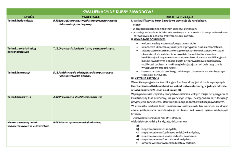 KWALIFIKACYJNE KURSY ZAWODOWE ZAWÓD KWALIFIKACJE Technik budownictwa B.30.Sporządzanie kosztorysów oraz przygotowywanie dokumentacji przetargowej. Technik żywienia i usług gastronomicznych T.15.Organizacja żywienia i usług gastronomicznych. Technik informatyk E.13.Projektowanie lokalnych sieci komputerowych i administrowanie sieciami. Technik handlowiec A.22.Prowadzenie działalności handlowej. Monter zabudowy i robót wykończeniowych w budownictwie B.05.Montaż systemów suchej zabudowy. KRYTERIA PRZYJĘCIA I. Na Kwalifikacyjne Kursy Zawodowe przyjmuje się kandydatów, którzy: - w przypadku osób niepełnoletnich ukończyli gimnazjum, - posiadają zaświadczenie lekarskie zawierające orzeczenie o braku przeciwwskazań zdrowotnych do podjęcia praktycznej nauki zawodu. II. WYMAGANE DOKUMENTY: wniosek według wzoru ustalonego przez szkołę, świadectwo ukończenia gimnazjum w przypadku osób niepełnoletnich, zaświadczenie lekarskie zawierające orzeczenie o braku przeciwwskazań zdrowotnych do kształcenia w zawodzie (pełnoletni kandydaci na kwalifikacyjne kursy zawodowe oraz pełnoletni słuchacze kwalifikacyjnych kursów zawodowych ponoszą koszty przeprowadzonych badań oceny możliwości pobierania nauki uwzględniającej stan zdrowia i zagrożenia występujące w miejscu nauki), kserokopia dowodu osobistego lub innego dokumentu potwierdzającego tożsamość kandydata. III. KRYTERIA PRZYJĘCIA Warunkiem przyjęcia na Kwalifikacyjny Kurs Zawodowy jest złożenie wymaganych Uruchomienie oddziału uzależnione jest od naboru słuchaczy, w jednym oddziale w ilości minimum 20 osób i maksimum 38. W przypadku większej liczby kandydatów niż liczba wolnych miejsc przy przyjęciu na kwalifikacyjny kurs zawodowy, na pierwszym etapie postępowania rekrutacyjnego przyjmuje się kandydatów, którzy nie posiadają żadnych kwalifikacji zawodowych. W przypadku większej liczby kandydatów spełniających ten warunek, na drugim etapie postępowania rekrutacyjnego są brane pod uwagę łącznie następujące kryteria: - w przypadku kandydata niepełnoletniego: wielodzietność rodziny kandydata, dokumentów. a) b) niepełnosprawność kandydata, c) niepełnosprawność jednego z rodziców kandydata, d) niepełnosprawność obojga rodziców kandydata, e) niepełnosprawność rodzeństwa kandydata, f) samotne wychowywanie kandydata w rodzinie, Monter zabudowy i robót wykończeniowych w budownictwie B.07. Wykonywanie robót posadzkarsko - okładzinowych. Technik technologii drewna A.50. Organizacja i prowadzenie procesów przetwarzania drewna g) objęcie kandydata pieczą zastępczą, - w przypadku kandydata pełnoletniego: a) wielodzietność rodziny kandydata, b) niepełnosprawność kandydata, c) niepełnosprawność dziecka kandydata, d) niepełnosprawność innej osoby bliskiej, nad którą kandydat sprawuje opiekę, e) samotne wychowywanie dziecka przez kandydata, Kryteria, o których mowa jw. mają jednakową wartość i wynoszą po 10 pkt. każdy. W przypadku równorzędnych wyników uzyskanych przez kandydatów na drugim etapie postępowania rekrutacyjnego lub jeżeli po zakończeniu tego etapu szkoła dysponuje wolnymi miejscami na dany kwalifikacyjny kurs zawodowy, na trzecim etapie postępowania rekrutacyjnego przyjmuje się kandydatów według kolejności zgłoszeń. Technik usług fryzjerskich A.23. Projektowanie fryzur.