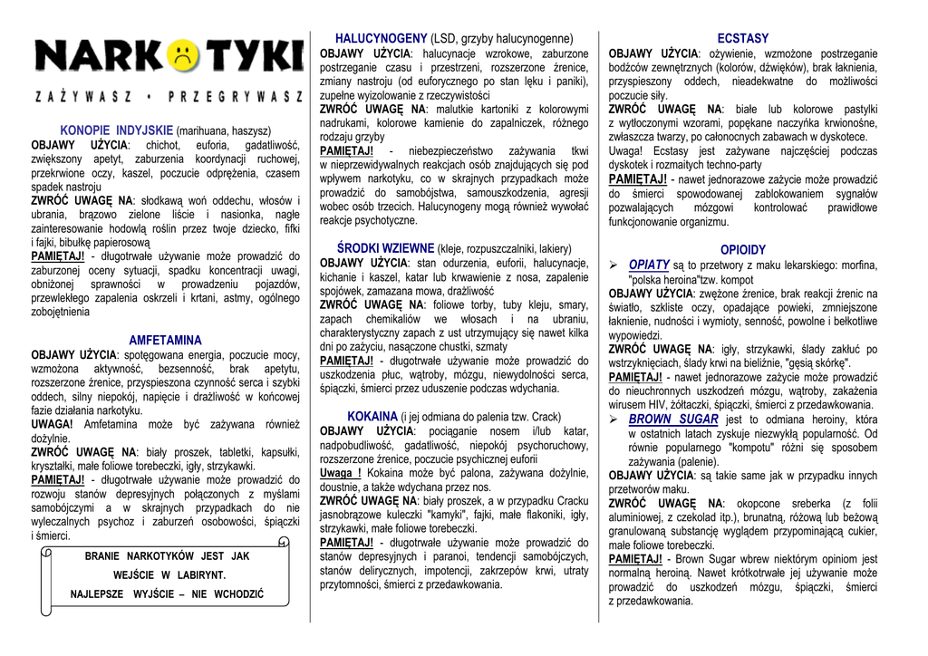 KONOPIE INDYJSKIE (marihuana, haszysz) OBJAWY UŻYCIA: chichot, euforia, gadatliwość, zwiększony apetyt, zaburzenia koordynacji ruchowej, przekrwione oczy, kaszel, poczucie odprężenia, czasem spadek nastroju ZWRÓĆ UWAGĘ NA: słodkawą woń oddechu, włosów i ubrania, brązowo zielone liście i nasionka, nagłe zainteresowanie hodowlą roślin przez twoje dziecko, fifki i fajki, bibułkę papierosową PAMIĘTAJ! - długotrwałe używanie może prowadzić do zaburzonej oceny sytuacji, spadku koncentracji uwagi, obniżonej sprawności w prowadzeniu pojazdów, przewlekłego zapalenia oskrzeli i krtani, astmy, ogólnego zobojętnienia AMFETAMINA OBJAWY UŻYCIA: spotęgowana energia, poczucie mocy, wzmożona aktywność, bezsenność, brak apetytu, rozszerzone źrenice, przyspieszona czynność serca i szybki oddech, silny niepokój, napięcie i drażliwość w końcowej fazie działania narkotyku. UWAGA! Amfetamina może być zażywana również dożylnie. ZWRÓĆ UWAGĘ NA: biały proszek, tabletki, kapsułki, kryształki, małe foliowe torebeczki, igły, strzykawki. PAMIĘTAJ! - długotrwałe używanie może prowadzić do rozwoju stanów depresyjnych połączonych z myślami samobójczymi a w skrajnych przypadkach do nie wyleczalnych psychoz i zaburzeń osobowości, śpiączki i śmierci. BRANIE NARKOTYKÓW JEST JAK WEJŚCIE W LABIRYNT. NAJLEPSZE WYJŚCIE – NIE WCHODZIĆ HALUCYNOGENY (LSD, grzyby halucynogenne) ECSTASY OBJAWY UŻYCIA: halucynacje wzrokowe, zaburzone postrzeganie czasu i przestrzeni, rozszerzone źrenice, zmiany nastroju (od euforycznego po stan lęku i paniki), zupełne wyizolowanie z rzeczywistości ZWRÓĆ UWAGĘ NA: malutkie kartoniki z kolorowymi nadrukami, kolorowe kamienie do zapalniczek, różnego rodzaju grzyby PAMIĘTAJ! - niebezpieczeństwo zażywania tkwi w nieprzewidywalnych reakcjach osób znajdujących się pod wpływem narkotyku, co w skrajnych przypadkach może prowadzić do samobójstwa, samouszkodzenia, agresji wobec osób trzecich. Halucynogeny mogą również wywołać reakcje psychotyczne. OBJAWY UŻYCIA: ożywienie, wzmożone postrzeganie bodźców zewnętrznych (kolorów, dźwięków), brak łaknienia, przyspieszony oddech, nieadekwatne do możliwości poczucie siły. ZWRÓĆ UWAGĘ NA: białe lub kolorowe pastylki z wytłoczonymi wzorami, popękane naczyńka krwionośne, zwłaszcza twarzy, po całonocnych zabawach w dyskotece. Uwaga! Ecstasy jest zażywane najczęściej podczas dyskotek i rozmaitych techno-party PAMIĘTAJ! - nawet jednorazowe zażycie może prowadzić do śmierci spowodowanej zablokowaniem sygnałów pozwalających mózgowi kontrolować prawidłowe funkcjonowanie organizmu. ŚRODKI WZIEWNE (kleje, rozpuszczalniki, lakiery) OBJAWY UŻYCIA: stan odurzenia, euforii, halucynacje, kichanie i kaszel, katar lub krwawienie z nosa, zapalenie spojówek, zamazana mowa, drażliwość ZWRÓĆ UWAGĘ NA: foliowe torby, tuby kleju, smary, zapach chemikaliów we włosach i na ubraniu, charakterystyczny zapach z ust utrzymujący się nawet kilka dni po zażyciu, nasączone chustki, szmaty PAMIĘTAJ! - długotrwałe używanie może prowadzić do uszkodzenia płuc, wątroby, mózgu, niewydolności serca, śpiączki, śmierci przez uduszenie podczas wdychania. OPIOIDY KOKAINA (i jej odmiana do palenia tzw. Crack) OBJAWY UŻYCIA: pociąganie nosem i/lub katar, nadpobudliwość, gadatliwość, niepokój psychoruchowy, rozszerzone źrenice, poczucie psychicznej euforii Uwaga ! Kokaina może być palona, zażywana dożylnie, doustnie, a także wdychana przez nos. ZWRÓĆ UWAGĘ NA: biały proszek, a w przypadku Cracku jasnobrązowe kuleczki "kamyki", fajki, małe flakoniki, igły, strzykawki, małe foliowe torebeczki. PAMIĘTAJ! - długotrwałe używanie może prowadzić do stanów depresyjnych i paranoi, tendencji samobójczych, stanów delirycznych, impotencji, zakrzepów krwi, utraty przytomności, śmierci z przedawkowania. OPIATY są to przetwory z maku lekarskiego: morfina, "polska heroina"tzw. kompot OBJAWY UŻYCIA: zwężone źrenice, brak reakcji źrenic na światło, szkliste oczy, opadające powieki, zmniejszone łaknienie, nudności i wymioty, senność, powolne i bełkotliwe wypowiedzi. ZWRÓĆ UWAGĘ NA: igły, strzykawki, ślady zakłuć po wstrzyknięciach, ślady krwi na bieliźnie, "gęsią skórkę". PAMIĘTAJ! - nawet jednorazowe zażycie może prowadzić do nieuchronnych uszkodzeń mózgu, wątroby, zakażenia wirusem HIV, żółtaczki, śpiączki, śmierci z przedawkowania. BROWN SUGAR jest to odmiana heroiny, która w ostatnich latach zyskuje niezwykłą popularność. Od równie popularnego "kompotu" różni się sposobem zażywania (palenie). OBJAWY UŻYCIA: są takie same jak w przypadku innych przetworów maku. ZWRÓĆ UWAGĘ NA: okopcone sreberka (z folii aluminiowej, z czekolad itp.), brunatną, różową lub beżową granulowaną substancję wyglądem przypominającą cukier, małe foliowe torebeczki. PAMIĘTAJ! - Brown Sugar wbrew niektórym opiniom jest normalną heroiną. Nawet krótkotrwałe jej używanie może prowadzić do uszkodzeń mózgu, śpiączki, śmierci z przedawkowania. MAŁY SŁOWNICZEK slangu związanego z narkotykami Jeżeli usłyszysz te nazwy w rozmowach swoich dzieci i ich znajomych nie wpadaj w panikę i nie traktuj ich jak potencjalnych narkomanów. Być może narkotyki pojawiły się w ich otoczeniu i warto na ten temat porozmawiać. Amfetamina: spid, proszek, proch, amfa, witamina A Grzyby halucynogenne: grzybki Handlarz narkotykami: diler Haszysz: hasz, kloc Kokaina: koka, koks, witamina C Końcowa faza działania narkotyku: zejście, zjazd LSD: kwas, trip, kwasik, ejsid Marihuana: Gandzia, blanty, dżointy, splif, trawa, skręt Skun: mieszanka marihuany z innymi substancjami (do palenia), niezwykle mocna, wywołująca szczególnie duże uzależnienie Stan po zażyciu: jazda, trzepanie, odlot, podróż, kręcenie Stan związany z odstawieniem narkotyku: głód, skręt Strzykawka: pompka, sp
