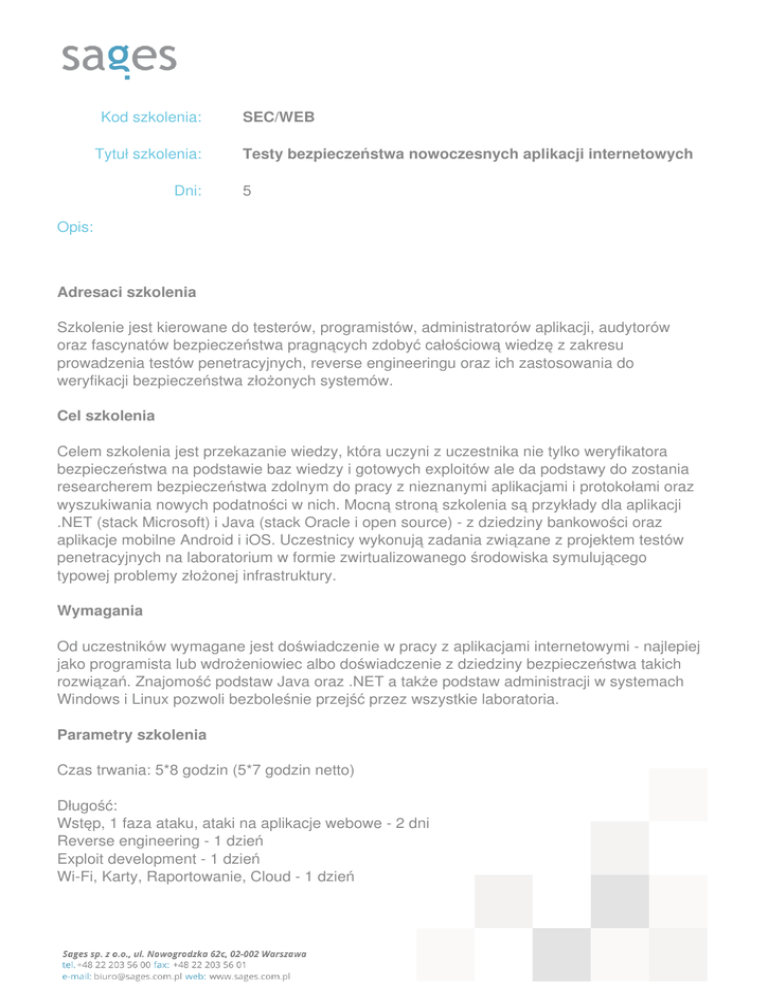 Kod szkolenia: Tytuł szkolenia: Dni: SEC/WEB Testy bezpieczeństwa nowoczesnych aplikacji internetowych 5 Opis: Adresaci szkolenia Szkolenie jest kierowane do testerów, programistów, administratorów aplikacji, audytorów oraz fascynatów bezpieczeństwa pragnących zdobyć całościową wiedzę z zakresu prowadzenia testów penetracyjnych, reverse engineeringu oraz ich zastosowania do weryfikacji bezpieczeństwa złożonych systemów. Cel szkolenia Celem szkolenia jest przekazanie wiedzy, która uczyni z uczestnika nie tylko weryfikatora bezpieczeństwa na podstawie baz wiedzy i gotowych exploitów ale da podstawy do zostania researcherem bezpieczeństwa zdolnym do pracy z nieznanymi aplikacjami i protokołami oraz wyszukiwania nowych podatności w nich. Mocną stroną szkolenia są przykłady dla aplikacji .NET (stack Microsoft) i Java (stack Oracle i open source) - z dziedziny bankowości oraz aplikacje mobilne Android i iOS. Uczestnicy wykonują zadania związane z projektem testów penetracyjnych na laboratorium w formie zwirtualizowanego środowiska symulującego typowej problemy złożonej infrastruktury. Wymagania Od uczestników wymagane jest doświadczenie w pracy z aplikacjami internetowymi - najlepiej jako programista lub wdrożeniowiec albo doświadczenie z dziedziny bezpieczeństwa takich rozwiązań. Znajomość podstaw Java oraz .NET a także podstaw administracji w systemach Windows i Linux pozwoli bezboleśnie przejść przez wszystkie laboratoria. Parametry szkolenia Czas trwania: 5*8 godzin (5*7 godzin netto) Długość: Wstęp, 1 faza ataku, ataki na aplikacje webowe - 2 dni Reverse engineering - 1 dzień Exploit development - 1 dzień Wi-Fi, Karty, Raportowanie, Cloud - 1 dzień Program szkolenia: 1. Rodzaje testów penetracyjnych Różnica między testem penetracyjnym a audytem Metodyki prowadzenia testów penetracyjnych Typy testów: whitebox, blackbox, greybox Fazy testów penetracyjnych Szacowanie zagrożeń, modelowanie zagrożeń i drzewa ataku Zakres testu Projekty R&D checklisty w testach penetracyjnych, standardy kodowania: CIS, CERT 2. Rodzaje podatności, typy podatności według różnych klasyfikacji klasyfikacja podatności według OWASP i CWE co to jest CVE? - otwarte i zamknięte bazy podatności 3. Narzędzia do analizy sieci i fazy rozpoznania, zbierania informacji o celu ataku sniffery narzędzia aktywne narzędzia pasywne weryfikacja konfiguracji wykorzystanie: p0f, nmap, Maltego Google dorks Shodan 4. Ataki na aplikacje webowe SQL Injection *Injection XSS CSRF Bezpośredni dostęp do danych i obiektów XXE Spring EL Injection Command Injection (Shellshock) Zarządzanie sesją Typowe problemy z rejestracją użytkowników i odzyskiwaniem hasła 5. Narzędzia do testów manualnych typu proxy wykorzystanie Burp Suite, OWASP ZAP 6. Automatyczne skanery bezpieczeństwa Wykorzystanie Nessus, Nexpose, Burp Suite Scan, Skipfish, Arachni 7. Zbiory exploitów wykorzystanie Metasploit 8. Skrypty i automatyzacja testów bezpieczeństwa wykorzystanie ZAP i Mozilla ZEST 9. Metody zdobywania i utrzymywania dostępu Hasła Konie trojańskie Pivoting Wykorzystanie meterpreter 10. 11. 12. 13. 14. 15. 16. 17. 18. 19. 20. 21. Ukrywanie obecności za pomocą modułów i rootkitów Reverse engineering pliki wykonywalne dla Windows i Linux platformy mobilne i wbudowane dekompilacja plików wykonywalnych JVM i .NET reversing protokołów i formatów plików narzędzia: IDA Pro, OllyDbg, Immunity Debugger, Windbg, Radare, objdump, Ronin Testy aplikacji mobilnych: Android, iOS Urządzenia Testy urządzeń wbudowanych Internet of things SDR (Software Defined Radio) Testy sieci bezprzewodowych identyfikacja sieci zdobywanie dostępu Testowanie WebServices XXE Kryptografia SSL POODLE Man-in-the-middle Słabości w implementacji kryptografii Karty inteligentne Ataki DoS i DDoS ataki na logikę aplikacji: ReDOS, XML Bomb, Flood Tworzenie exploitów - nie tylko exploitdb ;) wykorzystanie a. Buffer overflow b. Race condition c. Backdoor d. Use-After-Free i Heap Spraying e. Return Oriented Programming narzędzia do analizy statycznej dla JVM i .NET fuzzing zasady działania shellcode omijanie zabezpieczeń ALSR tworzenie nowych modułów dla Metasploit Fizyczne zdobywanie dostępu implanty podsłuchy Cloud Specyficzne zagadnienia dla cloud Wykorzystanie cloud w testach: DoS, DDoS Zagadnienia klasy Enterprise Specyficzne rozwiązania Security: API Gateway, Oracle DB, Imperva, SAP, 22. 23. 24. 25. Powered by TCPDF (www.tcpdf.org) DB2 BYOD, MDM Zarządzanie rolami i użytkownikami: IDM VPN Backup Zarządzanie informacją w trakcie testu penetracyjnego Budowanie bazy wiedzy i bazy ataków Dradis Framework Magic Tree Tworzenie raportu co powinien zawierać dobry raport z testów penetracyjnych? jak formułować zalecenia i obejścia? jak bezpiecznie dostarczyć raport do klienta? jak opisać podatność i uzyskać CVE? Planowanie i zarządzanie projektem testów penetracyjnych co zrobić by nie utopić? formalności w pracy z klientem zarządzanie zakresem Wizerunek pentestera Networking Wizytówka
