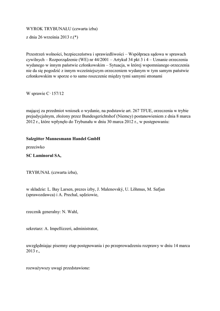 WYROK TRYBUNAŁU (czwarta izba) z dnia 26 września 2013 r.(*) Przestrzeń wolności, bezpieczeństwa i sprawiedliwości – Współpraca sądowa w sprawach cywilnych – Rozporządzenie (WE) nr 44/2001 – Artykuł 34 pkt 3 i 4 – Uznanie orzeczenia wydanego w innym państwie członkowskim – Sytuacja, w której wspomnianego orzeczenia nie da się pogodzić z innym wcześniejszym orzeczeniem wydanym w tym samym państwie członkowskim w sporze o to samo roszczenie między tymi samymi stronami W sprawie C‑157/12 mającej za przedmiot wniosek o wydanie, na podstawie art. 267 TFUE, orzeczenia w trybie prejudycjalnym, złożony przez Bundesgerichtshof (Niemcy) postanowieniem z dnia 8 marca 2012 r., które wpłynęło do Trybunału w dniu 30 marca 2012 r., w postępowaniu: Salzgitter Mannesmann Handel GmbH przeciwko SC Laminorul SA, TRYBUNAŁ (czwarta izba), w składzie: L. Bay Larsen, prezes izby, J. Malenovský, U. Lõhmus, M. Safjan (sprawozdawca) i A. Prechal, sędziowie, rzecznik generalny: N. Wahl, sekretarz: A. Impellizzeri, administrator, uwzględniając pisemny etap postępowania i po przeprowadzeniu rozprawy w dniu 14 marca 2013 r., rozważywszy uwagi przedstawione: – w imieniu Salzgitter Mannesmann Handel GmbH przez C. von Carlowitz, O. Kranza, C. Müllera oraz T. Rossbacha, Rechtsanwälte, – w imieniu rządu niemieckiego przez J. Möllera, T. Henzego oraz J. Kemper, działających w charakterze pełnomocników, – w imieniu rządu hiszpańskiego przez S. Centeno Huertę, działającą w charakterze pełnomocnika, – w imieniu rządu włoskiego przez G. Palmieri, działającą w charakterze pełnomocnika, wspieraną przez S. Varonego, avvocato dello stato, – w imieniu rządu rumuńskiego przez R. Giurescu oraz A. Voicu, działające w charakterze pełnomocników, – w imieniu Komisji Europejskiej przez W. Bogensbergera oraz A.M. Rouchaud-Joët, działających w charakterze pełnomocników, po zapoznaniu się z opinią rzecznika generalnego na posiedzeniu w dniu 16 maja 2013 r., wydaje następujący Wyrok 1 Wniosek o wydanie orzeczenia w trybie prejudycjalnym dotyczy wykładni art. 34 pkt 4 rozporządzenia Rady (WE) nr 44/2001 z dnia 22 grudnia 2000 r. w sprawie jurysdykcji i uznawania orzeczeń sądowych oraz ich wykonywania w sprawach cywilnych i handlowych (Dz.U. 2001, L 12, s. 1). 2 Wniosek ten został złożony w ramach sporu pomiędzy spółką Salzgitter Mannesmann Handel GmbH (zwaną dalej „spółką Salzgitter”) a spółką SC Laminorul SA (zwaną dalej „spółką Laminorul”) w przedmiocie wniosku o stwierdzenie wykonalności w Niemczech wydanego przez sąd rumuński orzeczenia, w którym od spółki Salzgitter została zasądzona zapłata kwoty 188 330 EUR na rzecz spółki Laminorul. Ramy prawne Rozporządzenie nr 44/2001 3 Motywy 2 i 15–17 rozporządzenia nr 44/2001 brzmią następująco: „(2) Różnice pomiędzy przepisami poszczególnych państw o jurysdykcji i uznawaniu orzeczeń utrudniają należyte funkcjonowanie rynku wewnętrznego. Dlatego nieodzown[e] jest wydanie przepisów celem ujednolicenia przepisów o jurysdykcji w sprawach cywilnych i handlowych oraz uproszczenia formalności ze względu na szybkie i nieskomplikowane uznawanie i wykonywanie orzeczeń z państw członkowskich związanych niniejszym rozporządzeniem. […] (15) W interesie zgodnego wymiaru sprawiedliwości należy unikać tak dalece, jak jest to tylko możliwe, równoległych postępowań, aby w dwóch państwach członkowskich nie zapadały niezgodne ze sobą orzeczenia. Należy przewidzieć jasną i skuteczną regulację w celu wyjaśnienia kwestii zawisłości sprawy i postępowań pozostających w związku […]. (16) Wzajemne zaufanie w wymiar sprawiedliwości w ramach [Unii Europejskiej] usprawiedliwia uznawanie orzeczeń wydanych w państwie członkowskim z mocy prawa, bez jakiegokolwiek szczególnego postępowania, z wyjątkiem przypadku sporu co do uznania. (17) Z uwagi na owo wzajemne zaufanie jest również uzasadnion[e], aby postępowanie o stwierdzenie wykonalności orzeczenia wydanego w innym państwie członkowskim przebiegało szybko i skutecznie. Stwierdzenie wykonalności orzeczenia musi więc następować niemal automatycznie, po dokonaniu zwykłego formalnego sprawdzenia przedłożonych dokumentów, bez możliwości uwzględniania przez sąd z urzędu którejkolwiek z przeszkód wykonania orzeczenia przewidzianych w niniejszym rozporządzeniu”. 4 Artykuł 32 wspomnianego rozporządzenia stanowi: „W rozumieniu niniejszego rozporządzenia »orzeczenie« oznacza każde orzeczenie wydane przez sąd państwa członkowskiego, niezależnie od tego, [jak] zostanie określone […]”. 5 Zgodnie z art. 33 ust. 1 omawianego rozporządzenia: „Orzeczenia wydane w jednym państwie członkowskim są uznawane w innych państwach członkowskich bez potrzeby przeprowadzania specjalnego postępowania”. 6 Artykuł 34 pkt 3 i 4 wspomnianego rozporządzenia przewiduje, co następuje: „Orzeczenia nie uznaje się, jeżeli: […] 3) orzeczenia nie da się pogodzić z orzeczeniem wydanym między tymi samymi stronami w państwie członkowskim, w którym wystąpiono o uznanie; 4) orzeczenia nie da się pogodzić z wcześniejszym orzeczeniem wydanym w innym państwie członkowskim albo w państwie trzecim w sporze o to samo roszczenie między tymi samymi stronami, o ile to wcześniejsze orzeczenie spełnia warunki konieczne do jego uznania w państwie członkowskim, w którym wystąpiono o uznanie”. 7 Zgodnie z art. 38 ust. 1 rozporządzenia nr 44/2001: „Orzeczenia wydane w jednym państwie członkowskim i w tym państwie wykonalne będą wykonywane w innym państwie członkowskim, jeżeli ich wykonalność w nim zostanie stwierdzona na wniosek uprawnionego”. 8 Artykuł 41 omawianego rozporządzenia brzmi następująco: „Po spełnieniu formalności […] następuje niezwłoczne stwierdzenie wykonalności orzeczenia bez badania według art. 34 i 35. Dłuż