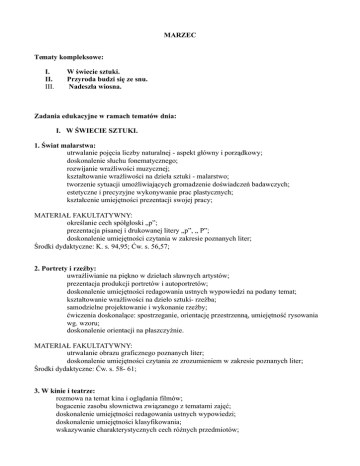 MARZEC Tematy kompleksowe: I. II. III. W świecie sztuki. Przyroda budzi się ze snu. Nadeszła wiosna. Zadania edukacyjne w ramach tematów dnia: I. W ŚWIECIE SZTUKI. 1. Świat malarstwa: utrwalanie pojęcia liczby naturalnej - aspekt główny i porządkowy; doskonalenie słuchu fonematycznego; rozwijanie wrażliwości muzycznej; kształtowanie wrażliwości na dzieła sztuki - malarstwo; tworzenie sytuacji umożliwiających gromadzenie doświadczeń badawczych; estetyczne i precyzyjne wykonywanie prac plastycznych; kształcenie umiejętności prezentacji swojej pracy; MATERIAŁ FAKULTATYWNY: określanie cech spółgłoski „p”; prezentacja pisanej i drukowanej litery „p”, „ P”; doskonalenie umiejętności czytania w zakresie poznanych liter; Środki dydaktyczne: K. s. 94,95; Ćw. s. 56,57; 2. Portrety i rzeźby: uwrażliwianie na piękno w dziełach sławnych artystów; prezentacja produkcji portretów i autoportretów; doskonalenie umiejętności redagowania ustnych wypowiedzi na podany temat; kształtowanie wrażliwości na dzieło sztuki- rzeźba; samodzielne projektowanie i wykonanie rzeźby; ćwiczenia doskonalące: spostrzeganie, orientację przestrzenną, umiejętność rysowania wg. wzoru; doskonalenie orientacji na płaszczyźnie. MATERIAŁ FAKULTATYWNY: utrwalanie obrazu graficznego poznanych liter; doskonalenie umiejętności czytania ze zrozumieniem w zakresie poznanych liter; Środki dydaktyczne: Ćw. s. 58- 61; 3. W kinie i teatrze: rozmowa na temat kina i oglądania filmów; bogacenie zasobu słownictwa związanego z tematami zajęć; doskonalenie umiejętności redagowania ustnych wypowiedzi; doskonalenie umiejętności klasyfikowania; wskazywanie charakterystycznych cech różnych przedmiotów; wyodrębnianie podzbiorów; wdrażanie do przestrzegania zasad kulturalnego zachowania się w miejscach publicznych; utrwalanie wiadomości o teatrze. MATERIAŁ FAKULTATYWNY: utrwalanie obrazu graficznego poznanych liter; doskonalenie techniki czytania; Środki dydaktyczne: K. s. 96, 97; 4. Kłopoty Agaty: kształtowanie umiejętności posługiwania się określeniami ogólnymi i szczegółowymi; doskonalenie słuchu fonematycznego; kształtowanie intuicyjnego rozumienia zagrożeń, jakimi są choroby, oraz odpowiedzialność za swoje zdrowie; wdrażanie do aktywnego wypoczynku i prowadzenia zdrowego stylu życia; doskonalenie umiejętności liczenia. MATERIAŁ FAKULTATYWNY: określanie cech spółgłoski „c”; prezentacja pisanej i drukowanej litery „c”, „ C”; doskonalenie umiejętności czytania ze zrozumieniem w zakresie poznanych liter; 5. Jesteśmy aktorami: rozwijanie sprawności motorycznej; ćwiczenie umiejętności opowiadania historyjek obrazkowych; rozwijanie ekspresji teatralnej - teatr cieni; rozwijanie umiejętności plastyczno - technicznych; prezentowanie wybranych utworów literatury dziecięcej związanych z tematem zajęć; kształtowanie umiejętności zgodnego współdziałania w grupie podczas zabaw i w różnych sytuacjach zadaniowych; doskonalenie umiejętności liczenia; utrwalanie pojęcia „ równoliczności”. MATERIAŁ FAKULTATYWNY: ćwiczenia w różnicowaniu samogłosek i spółgłosek; utrwalanie obrazu graficznego litery „c”, „C” i identyfikowanie go z głoską „c”; doskonalenie umiejętności czytania w zakresie poznanych liter. 6. Mały telewidz: kształcenie umiejętności redagowanie ustnych wypowiedzi na temat programów telewizyjnych dla dzieci; prezentacja utworów literackich związanych z tematem zajęć; rozmowa na temat korzystania z telewizji- uświadamianie, jakie są korzyści i zagrożenia; kształtowanie pojęcia liczby 10; konstruowanie gry dydaktycznej; doskonalenie umiejętności liczenia; kształtowanie czynnej postawy wobec zdrowia. MATERIAŁ FAKULTATYWNY: tworzenie wyrazów z sylab; doskonalenie umiejętności czytania ze zrozumieniem w zakresie poznanych liter; II. PRZYRODA BUDZI SIĘ ZE SNU. 1. Wiosenne przebudzenie: doskonalenie słuchu fonematycznego; rozwijanie sprawności grafomotorycznej; rozwijanie myślenia przyczynowo-skutkowego- ustalanie kolejności zdarzeń; dostrzeganie i opisywanie zjawisk atmosferycznych; doskonalenie umiejętności sprawnego liczenia; dostrzeganie i opisywanie zmian zachodzących w przyrodzie; nauka piosenek związanych z nadejściem wiosny; zabawy ruchowe przy piosence; utrwalanie pojęcia liczby w zakresie 10; doskonalenie umiejętności dokonywania klasyfikacji. MATERIAŁ FAKULTATYWNY: prezentacja pisanej i drukowanej litery „ł’, „Ł”; doskonalenie umiejętności czytania w zakresie poznanych liter; Środki dydaktyczne: K. s. 101,102; Ćw. s. 70- 72; 2. Wiosna tuz, tuż: prezentacja utworów literatury dziecięcej związanej z tematem zajęć; doskonalenie słuchu fonematycznego; kształtowanie umiejętności redagowania ustnych wypowiedzi na podany temat; dostrzeganie i opisywanie zjawisk atmosferycznych charakterystycznych dla danej pory roku; rozwijanie umiejętności plastycznych; ćwiczenie spostrzegawczości- odszukiwanie szczegółów na obrazkach; doskonalenie umiejętności liczenia w zakresie 10 (doliczanie, odliczanie); Środki dydaktyczne: Ćw. s. 73-75; 3. Mądrość przysłów: prezentacja przysłów i porzekadeł ludowych związanych z wiosną; poznawanie obrzędów ludowych związanych z wiosną; ćwiczenia ortofoniczne- naśladowanie odgłosów przyrody; kształcenie umiejętności dostrzegania związków przyczynowo skutkowych; estetyczne i precyzyjne wykonywanie prac plastycznych; Środki dydaktyczne: Ćw. s. 75 4.Czas wiosennych spacerów i zabaw: rozwijanie umiejętności skupiania uwagi na wykonywanym zadaniu; doskonalenie umiejętności dodawania liczb w zakresie 10; wyrabianie nawyku doprowadzania działań do końca; prezentacja utworów literatury dziecięcej związanej z tematem zajęć; doskonalenie umiejętności przestrzegania zasad pracy w grupach; uwrażliwianie na piękno w dziełach sławnych kompozytorów; za