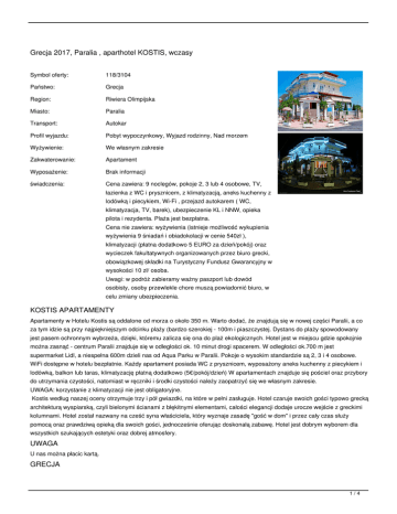 Grecja 2017, Paralia , aparthotel KOSTIS, wczasy Symbol oferty: 118/3104 Państwo: Grecja Region: Riwiera Olimpijska Miasto: Paralia Transport: Autokar Profil wyjazdu: Pobyt wypoczynkowy, Wyjazd rodzinny, Nad morzem Wyżywienie: We własnym zakresie Zakwaterowanie: Apartament Wyposażenie: Brak informacji świadczenia: Cena zawiera: 9 noclegów, pokoje 2, 3 lub 4 osobowe, TV, łazienka z WC i prysznicem, z klimatyzacją, aneks kuchenny z lodówką i piecykiem, Wi-Fi , przejazd autokarem ( WC, klimatyzacja, TV, barek), ubezpieczenie KL i NNW, opieka pilota i rezydenta. Plaża jest bezpłatna. Cena nie zawiera: wyżywienia (istnieje możliwość wykupienia wyżywienia 9 śniadań i obiadokolacji w cenie 540zł ), klimatyzacji (płatna dodatkowo 5 EURO za dzień/pokój) oraz wycieczek fakultatywnych organizowanych przez biuro grecki, obowiązkowej składki na Turystyczny Fundusz Gwarancyjny w wysokości 10 zł/ osoba. Uwagi: w podróż zabieramy ważny paszport lub dowód osobisty, osoby przewlekle chore muszą powiadomić biuro, w celu zmiany ubezpieczenia. KOSTIS APARTAMENTY Apartamenty w Hotelu Kostis są oddalone od morza o około 350 m. Warto dodać, że znajdują się w nowej części Paralii, a co za tym idzie są przy najpiękniejszym odcinku plaży (bardzo szerokiej - 100m i piaszczystej. Dystans do plaży spowodowany jest pasem ochronnym wybrzeża, dzięki, któremu zalicza się ona do plaż ekologicznych. Hotel jest w miejscu gdzie spokojnie można zasnąć - centrum Paralii znajduje się w odległości ok. 10 minut drogi spacerem. W odległości ok.700 m jest supermarket Lidl, a niespełna 600m dzieli nas od Aqua Parku w Paralii. Pokoje o wysokim standardzie są 2, 3 i 4 osobowe. WiFi dostępne w hotelu bezpłatnie. Każdy apartament posiada WC z prysznicem, wyposażony aneks kuchenny z piecykiem i lodówką, balkon lub taras, klimatyzację płatną dodatkowo (5€/pokój/dzień) W apartamentach znajduje się pościel oraz przybory do utrzymania czystości, natomiast w ręczniki i środki czystości należy zaopatrzyć się we własnym zakresie. UWAGA: korzystanie z klimatyzacji nie jest obligatoryjne. Kostis według naszej oceny otrzymuje trzy i pół gwiazdki, na które w pełni zasługuje. Hotel czaruje swoich gości typowo grecką architekturą wyspiarską, czyli bielonymi ścianami z błękitnymi elementami, całości elegancji dodaje urocze wejście z greckimi kolumnami. Hotel został nazwany na cześć syna właściciela, który wyznaje zasadę "gość w dom" i przez cały czas służy pomocą oraz prawdziwą opieką dla swoich gości, jednocześnie oferując doskonałą zabawę. Hotel jest dobrym wyborem dla wszystkich szukających estetyki oraz dobrej atmosfery. UWAGA U nas można płacic kartą. GRECJA 1/4 Ciepłe z krystalicznie czystą wodą morze, 300 słonecznych dni w roku, niezwykle gościnni gospodarze, wspaniała historia, zabytki z początku europejskiej cywilizacji. Kuchnia, która zadowoli każdego smakosza. Widoki zapadające w pamięci na zawsze. Cudowne miejsce do wypoczynku. RIWIERA OLIMPIJSKA Ciepłe morze, cudowne plaże, majestatyczne pasmo gór OLIMPU, gaje oliwne, kwitnące setkami barw kwiaty, tryskające sokiem brzoskwinie, ogromne arbuzy, kilkadziesiąt odmian winogron. Setki tawern i kawiarenek o niezapomnianym klimacie i smakach, których wspomnienie będzie Ci towarzyszyć jeszcze długo po powrocie. Wystarczy raz pojechać do Grecji a zakochasz się w niej na całe życie i na pewno będziesz chciał tam wrócić. PARALIA Kurort na Riwierze Olimpijskiej położony nad brzegiem Morza Egejskiego z zapierającym dech widokiem na Olimp. Piękna zróżnicowana piaszczysta plaża, usypane z kamieni mola, liczne nadmorskie kawiarenki z leżakami i parasolami, tawerny (restauracje), boiska do siatkówki, wszystko to pozwala rozkoszować się cudownym relaksem. Miasteczko ma kilka deptaków z niezliczonymi sklepami: eleganckie futra, wyroby złotnicze, greckie specjały, pamiątki. Restauracje i kawiarnie serwujące dania i przysmaki greckiej kuchni, dyskoteki, korty itd. Reasumując miejsce dla ludzi aktywnych. TRANSPORT Oferujemy naszym klientom z całego kraju dowóz do miejsca wypoczynku. Transport odbywa się autokarem wyposażonym w WC, klimatyzację, barek i wideo. Autobusy kursują według ustalonego rozkładu jazdy. Uwaga! Połączenia antenowe do Katowic mogą odbywać się mikrobusami lub samochodami osobowymi. Połączenia antenowe odbywają się przy minimum 8 osobach z danego kierunku (potwierdzenie antenki 14 dni przed wyjazdem).Trasa przejazdu: Polska, Słowacja, Węgry, Serbia, Macedonia, Grecja. Atrakcje: Możliwość skorzystania z wycieczek fakultatywnych organizowanych przez greckie biuro z polskim pilotem. Ceny wycieczek ATENY... . osoba dorosła ok.45 Euro /dziecko 40 EUR OLIMP.... osoba dorosła ok.25 Euro /dziecko 20 EUR METEORA.... SKIATHOS.... osoba dorosła ok.30 Euro /dziecko 25 EUR osoba dorosła ok.40 Euro /dziecko 35 EUR GRECKI WIECZOR.. osoba dorosła ok.22 Euro /dziecko 18 EUR Organizatorem wycieczek jest biuro greckie i ono ponosi całkowitą odpowiedzialność za program, cenę i przebieg wycieczki. TERMINY: od: 2017-05-29 do: 2017-06-09 (12 dni), miejsca: sprawdź miejsca cena od: 709 PLN od: 2017-06-07 do: 2017-06-18 (12 dni), miejsca: sprzedaż zakończona cena od: 729 PLN od: 2017-06-16 do: 2017-06-27 (12 dni), miejsca: zamów cena od: 789 PLN od: 2017-06-25 do: 2017-07-06 (12 dni), miejsca: sprzedaż zakończona cena od: 939 PLN od: 2017-07-04 do: 2017-07-15 (12 dni), miejsca: sprawdź miejsca cena od: 1189 PLN od: 2017-07-13 do: 2017-07-24 (12 dni), miejsca: sprawdź miejsca cena od: 1189 PLN od: 2017-07-22 do: 2017-08-02 (12 dni), miejsca: sprawdź miejsca cena od: 1189 PLN od: 2017-07-31 do: 2017-08-11 (12 dni), miejsca: sprzedaż zakończona cena od: 1189 PLN od: 2017-08-09 do: 2017-08-20 (12 dni), miejsca: sprawdź miejsca cena od: 1189 PLN od: 2017-08-18 do: 2017-08-29 (12 dni), miejsca: sprawdź miejsca 