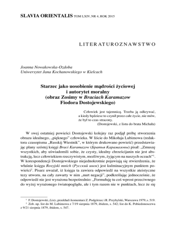 SLAVIA ORIENTALIS TOM LXIV, NR 4, ROK 2015 L I T E R AT U R O Z N AW S T W O Joanna Nowakowska-Ozdoba Uniwersytet Jana Kochanowskiego w Kielcach Starzec jako uosobienie mądrości życiowej i autorytet moralny (obraz Zosimy w Braciach Karamazow Fiodora Dostojewskiego) Człowiek jest tajemnicą. Trzeba ją odkrywać, a kiedy będziesz to czynił przez całe życie, nie mów, że był to czas stracony. (Dostojewski, z listu do brata Michała) W swej ostatniej powieści Dostojewski kolejny raz podjął próbę stworzenia obrazu idealnego, „pięknego” człowieka. W liście do Mikołaja Lubimowa (redaktora czasopisma „Russkij Wiestnik”, w którym drukowano powieść) przedstawiając plany szóstej księgi Braci Karamazow (Братья Карамазовы) pisał: „Zmuszę wszystkich, aby uświadomili sobie, że czysty, idealny chrześcijanin nie jest abstrakcją, lecz człowiekiem rzeczywistym, możliwym, żyjącym na naszych oczach”1. W korespondencji Dostojewskiego niejednokrotnie pojawiają się stwierdzenia, że właśnie księga Rosyjski mnich (Русский инок) jest kulminacyjnym punktem powieści2. Pisarz uważał, iż księga ta zawiera odpowiedź na wszystkie ateistyczne tezy utworu, na cały zawarty w nim „nurt negacji”, podkreślając jednocześnie, że odpowiedź nie jest wyrażona bezpośrednio: „Formułuję tu coś wprost przeciwnego do wyżej wyrażonego światopoglądu, ale i tym razem nie w punktach, lecz że się 1 F. Dostojewski, Listy, przekład i komentarz Z. Podgórzec i R. Przybylski, Warszawa 1979, s. 519. Zob. np. list do M. Lubimowa z 7/19 sierpnia 1879, ibidem, s. 542; list do K. Pobiedonoscewa z 9/21 sierpnia 1879, ibidem, s. 547. 2 680 JOANNA NOWAKOWSKA-OZDOBA tak wyrażę – w obrazie artystycznym”3. Wykreowana przez Dostojewskiego postać starca Zosimy jest tą właśnie próbą odpowiedzi na pytanie o możliwość zachowania postawy Chrystusowej w świecie współczesnym pisarzowi. Tworząc obraz Zosimy autor Braci Karamazow opierał się na świadectwach życia realnych postaci. W literaturze o Dostojewskim najczęściej za prototyp tego bohatera uważany jest starzec Ambroży Grienkow z Pustelni Optyńskiej, z którym pisarz spotkał się po śmierci swego synka Aloszy w czerwcu 1878 roku. Niejednokrotnie wśród pierwowzorów Zosimy bywa wymieniany Zacharij Wierchowski, wojewodzic smoleński, który we wczesnej młodości porzucił świetnie zapowiadającą się karierę wojskową i wstąpił do klasztoru, przybierając imię Zosimy. W biografii bohatera Dostojewskiego można odnaleźć szereg analogii do jego życia. Duży wpływ na kreację postaci Zosimy mieli również Paisjusz Wieliczkowski – wielki odnowiciel ruchu „starców”4 w Rosji, kontynuatorzy jego tradycji Teofan i Makary (znany osobiście Dostojewskiemu), a przede wszystkim św. Tichon Zadoński, którego myśli zaważyły na światopoglądzie Zosimy. Święty Tichon związany był z tendencjami antyascetycznymi, które były szczególnie bliskie Zosimie. Istnienie rzeczywistych prototypów powieściowego starca stanowi podstawę wiarygodności tego obrazu literackiego, jest gwarancją życiowego prawdopodobieństwa postaci. W świecie przedstawionym Braci Karamazow Zosima, pomimo iż pozostaje na peryferiach wydarzeń fabularnych, jest postacią niezwykle ważną. Charyzmatyczny starzec przyciąga do siebie ludzi spragnionych pocieszenia, rady, umocnienia w wierze. Przez okoliczną ludność uważany jest on za świętego mędrca, obdarzonego zdolnością przewidywania przyszłości i odgadywania tajemnic dusz ludzkich: „[…] zdumiewał, niepokoił i przerażał, odgadując sekrety, o których nikt mu nic nie mówił”5. Rozwiązania swych problemów szukają u niego nie tylko ludzie prości. Do Zosimy przychodzą też obywatele ziemscy i członkowie elity miasteczka. Ma on również wielu zwolenników w klasztorze, choć nie wszyscy mnisi rozumieją i przyjmują jego nauki. 3 List do K. Pobiedonoscewa z 2 sierpnia/6 września 1879, ibidem, s. 551. Starczestwo to instytucja kierownictwa duchowego w prawosławiu. Starzec to ktoś o dużym doświadczeniu duchowym, święty mędrzec, który dzięki swemu doświadczeniu i mądrości jest w stanie prowadzić innych do Boga. Instytucja starca znana była już w Kościele starożytnym, jej pojawienie się związane było z życiem monastycznym na górze Athos nad Morzem Egejskim. Ruch „starców”, początkowo służący wyłącznie mnichom, stopniowo zaczął być użyteczny również dla duchowego wzrostu ludzi świeckich. W Rosji starczestwo zaczęło rozwijać się w wieku XV dzięki działalności św. Niła Sorskiego, który przeszczepił na grunt rosyjski idee hezychazmu z Athosu. Starcami mogą być nie tylko mnisi, ale i ludzie świeccy, którzy poświęcili życie kontemplacji i zjednoczeniu z Bogiem. Od swych uczniów starzec wymaga całkowitego zaufania, szczerości i bezwzględnego posłuszeństwa. 5 F. Dostojewski, Bracia Karamazow, Warszawa 1978, t. 1, s. 40 (w dalszym tekście przy cytatach z powieści będzie podany tom i numer strony w nawiasie). 4 STARZEC JAKO UOSOBIENIE MĄDROŚCI ŻYCIOWEJ… 681 Wypowiadane przez starca Zosimę myśli dotyczące Boga, człowieka, życia ludzkiego i otaczającego świata tworzą spójną doktrynę, pod którą niejako oficjalnie, w liście do Mikołaja Lubimowa, podpisuje się sam autor. „Jestem całkowicie tego samego zdania co on” – pisze Dostojewski, dodając wszakże, że „gdybym miał je wyrazić [myśli Zosimy] od siebie, wyraziłbym je w innej formie i w innym języku6. Zosimę cechuje mądrość zrodzona z ducha Ewangelii i tradycji prawosławnej. Jest to mądrość pełna pokory wobec świata i ludzi. W nauczaniu starca Zosimy pokora odgrywa doniosłą rolę, o czym świadczą takie jego stwierdzenia jak: „wielka jest Rosja przez swoją pokorę” (t. 1, s. 380), „od ludu wyjdzie zbawienie, od wiary jego i pokory” (t. 1, s. 370), „
