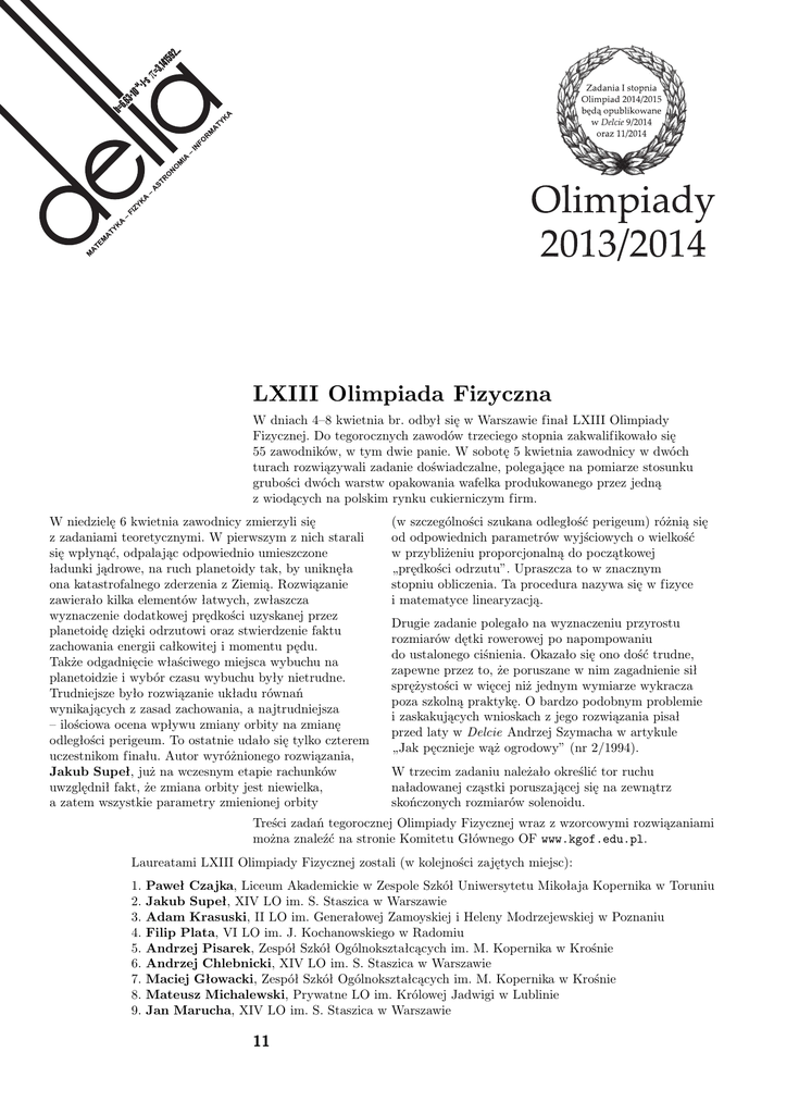 LXIII Olimpiada Fizyczna W dniach 4–8 kwietnia br. odbył się w Warszawie finał LXIII Olimpiady Fizycznej. Do tegorocznych zawodów trzeciego stopnia zakwalifikowało się 55 zawodników, w tym dwie panie. W sobotę 5 kwietnia zawodnicy w dwóch turach rozwiązywali zadanie doświadczalne, polegające na pomiarze stosunku grubości dwóch warstw opakowania wafelka produkowanego przez jedną z wiodących na polskim rynku cukierniczym firm. W niedzielę 6 kwietnia zawodnicy zmierzyli się z zadaniami teoretycznymi. W pierwszym z nich starali się wpłynąć, odpalając odpowiednio umieszczone ładunki jądrowe, na ruch planetoidy tak, by uniknęła ona katastrofalnego zderzenia z Ziemią. Rozwiązanie zawierało kilka elementów łatwych, zwłaszcza wyznaczenie dodatkowej prędkości uzyskanej przez planetoidę dzięki odrzutowi oraz stwierdzenie faktu zachowania energii całkowitej i momentu pędu. Także odgadnięcie właściwego miejsca wybuchu na planetoidzie i wybór czasu wybuchu były nietrudne. Trudniejsze było rozwiązanie układu równań wynikających z zasad zachowania, a najtrudniejsza – ilościowa ocena wpływu zmiany orbity na zmianę odległości perigeum. To ostatnie udało się tylko czterem uczestnikom finału. Autor wyróżnionego rozwiązania, Jakub Supeł, już na wczesnym etapie rachunków uwzględnił fakt, że zmiana orbity jest niewielka, a zatem wszystkie parametry zmienionej orbity (w szczególności szukana odległość perigeum) różnią się od odpowiednich parametrów wyjściowych o wielkość w przybliżeniu proporcjonalną do początkowej „prędkości odrzutu”. Upraszcza to w znacznym stopniu obliczenia. Ta procedura nazywa się w fizyce i matematyce linearyzacją. Drugie zadanie polegało na wyznaczeniu przyrostu rozmiarów dętki rowerowej po napompowaniu do ustalonego ciśnienia. Okazało się ono dość trudne, zapewne przez to, że poruszane w nim zagadnienie sił sprężystości w więcej niż jednym wymiarze wykracza poza szkolną praktykę. O bardzo podobnym problemie i zaskakujących wnioskach z jego rozwiązania pisał przed laty w Delcie Andrzej Szymacha w artykule „Jak pęcznieje wąż ogrodowy” (nr 2/1994). W trzecim zadaniu należało określić tor ruchu naładowanej cząstki poruszającej się na zewnątrz skończonych rozmiarów solenoidu. Treści zadań tegorocznej Olimpiady Fizycznej wraz z wzorcowymi rozwiązaniami można znaleźć na stronie Komitetu Głównego OF www.kgof.edu.pl. Laureatami LXIII Olimpiady Fizycznej zostali (w kolejności zajętych miejsc): 1. 2. 3. 4. 5. 6. 7. 8. 9. Paweł Czajka, Liceum Akademickie w Zespole Szkół Uniwersytetu Mikołaja Kopernika w Toruniu Jakub Supeł, XIV LO im. S. Staszica w Warszawie Adam Krasuski, II LO im. Generałowej Zamoyskiej i Heleny Modrzejewskiej w Poznaniu Filip Plata, VI LO im. J. Kochanowskiego w Radomiu Andrzej Pisarek, Zespół Szkół Ogólnokształcących im. M. Kopernika w Krośnie Andrzej Chlebnicki, XIV LO im. S. Staszica w Warszawie Maciej Głowacki, Zespół Szkół Ogólnokształcących im. M. Kopernika w Krośnie Mateusz Michalewski, Prywatne LO im. Królowej Jadwigi w Lublinie Jan Marucha, XIV LO im. S. Staszica w Warszawie 11