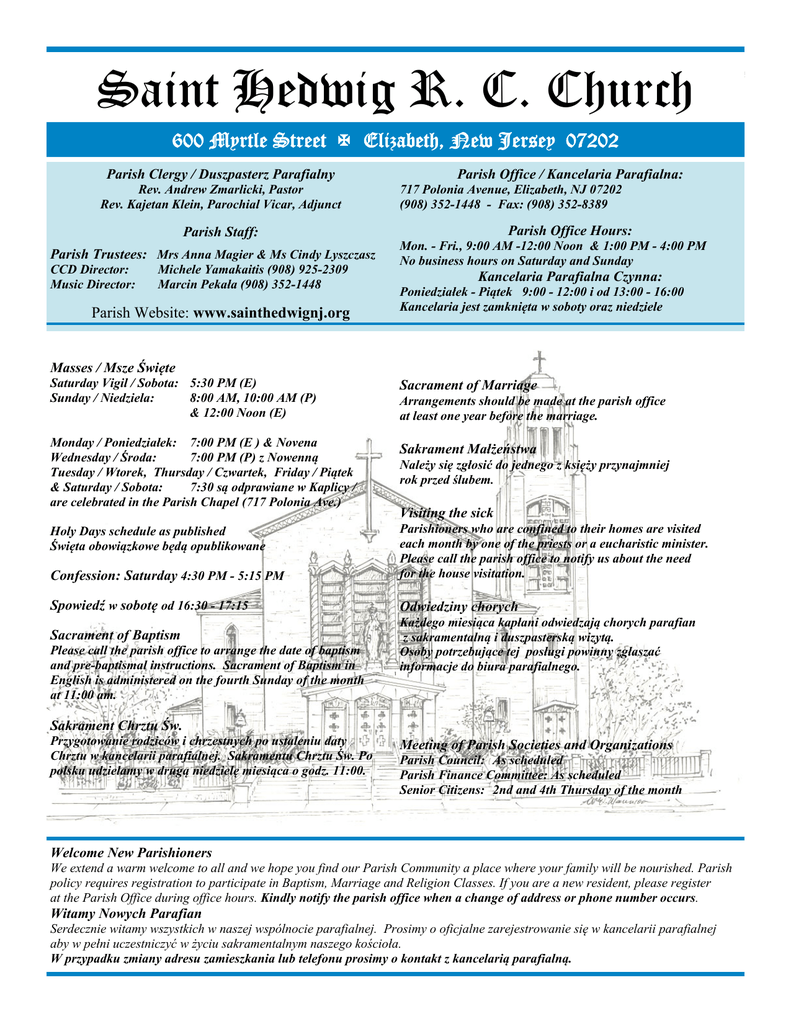 Saint Hedwig Roman Catholic Church Parafia Rzymsko - Katolicka Świętej Jadwigi Saint Hedwig R. C. Church 600 Myrtle Street Elizabeth, New Jersey 07202 Parish Clergy / Duszpasterz Parafialny Rev. Andrew Zmarlicki, Pastor Rev. Kajetan Klein, Parochial Vicar, Adjunct Parish Staff: Parish Trustees: Mrs Anna Magier & Ms Cindy Lyszczasz CCD Director: Music Director: Michele Yamakaitis (908) 925-2309 Marcin Pekała (908) 352-1448 Parish Website: www.sainthedwignj.org Parish Office / Kancelaria Parafialna: 717 Polonia Avenue, Elizabeth, NJ 07202 (908) 352-1448 - Fax: (908) 352-8389 Parish Office Hours: Mon. - Fri., 9:00 AM -12:00 Noon & 1:00 PM - 4:00 PM No business hours on Saturday and Sunday Kancelaria Parafialna Czynna: Poniedziałek - Piątek 9:00 - 12:00 i od 13:00 - 16:00 Kancelaria jest zamknięta w soboty oraz niedziele Masses / Msze Święte Saturday Vigil / Sobota: 5:30 PM (E) Sunday / Niedziela: 8:00 AM, 10:00 AM (P) & 12:00 Noon (E) Sacrament of Marriage Monday / Poniedziałek: 7:00 PM (E ) & Novena Wednesday / Środa: 7:00 PM (P) z Nowenną Tuesday / Wtorek, Thursday / Czwartek, Friday / Piątek & Saturday / Sobota: 7:30 są odprawiane w Kaplicy / are celebrated in the Parish Chapel (717 Polonia Ave.) Sakrament Małżeństwa Holy Days schedule as published Święta obowiązkowe będą opublikowane Confession: Saturday 4:30 PM - 5:15 PM Parishioners who are confined to their homes are visited each month by one of the priests or a eucharistic minister. Please call the parish office to notify us about the need for the house visitation. Spowiedź w sobotę od 16:30 - 17:15 Odwiedziny chorych Sacrament of Baptism Please call the parish office to arrange the date of baptism and pre-baptismal instructions. Sacrament of Baptism in English is administered on the fourth Sunday of the month at 11:00 am. Arrangements should be made at the parish office at least one year before the marriage. Należy się zgłosić do jednego z księży przynajmniej rok przed ślubem. Visiting the sick Każdego miesiąca kapłani odwiedzają chorych parafian z sakramentalną i duszpasterską wizytą. Osoby potrzebujące tej posługi powinny zgłaszać informacje do biura parafialnego. Sakrament Chrztu Św. Przygotowanie rodziców i chrzestnych po ustaleniu daty Chrztu w kancelarii parafialnej. Sakramentu Chrztu Św. Po polsku udzielamy w drugą niedzielę miesiąca o godz. 11:00. Meeting of Parish Societies and Organizations Parish Council: As scheduled Parish Finance Committee: As scheduled Senior Citizens: 2nd and 4th Thursday of the month Welcome New Parishioners We extend a warm welcome to all and we hope you find our Parish Community a place where your family will be nourished. Parish policy requires registration to participate in Baptism, Marriage and Religion Classes. If you are a new resident, please register at the Parish Office during office hours. Kindly notify the parish office when a change of address or phone number occurs. Witamy Nowych Parafian Serdecznie witamy wszystkich w naszej wspólnocie parafialnej. Prosimy o oficjalne zarejestrowanie się w kancelarii parafialnej aby w pełni uczestniczyć w życiu sakramentalnym naszego kościoła. W przypadku zmiany adresu zamieszkania lub telefonu prosimy o kontakt z kancelarią parafialną. Page 1 Saint Hedwig Roman Catholic Church Parafia Rzymsko - Katolicka Świętej Jadwigi 4th Sunday in Ordinary Time January 31, 2016 Saturday - 4 Niedziela Zwykła 31 Stycznia 2016 Sobota - January 30 Vigil: 4th Sunday in Ordinary Time 5:30 pm + Stefania Folcik (Son Henry) Sunday 8:00 am Niedziela - January 31 4th Sunday in Ordinary Time 4 Niedziela Zwykla + Jan Jurkowski - rocznica śmierci (Córka z Rodziną) 10:00 am + Eugene Gołda (Ted & Donna Brzozowski) 12:00 pm + Danuta Adamczyk (Frank Józefa) Monday 7:00 pm - Poniedziałek - February 1 Special intention known to God (Schleckmann Family) Novena to St. Jude Tuesday 7:30 am Wtorek - February 2 Presentation of the Lord O Boże błogosławieństwo dla Ryszarda Thursday - Czwartek - February 4 7:30 am + Bertha Dulemba (Pryjaciel) Friday - Piątek - February 5 St. Agatha 7:30 am + Stanisław Winnicki (Siostra) Saturday - Sobota - February 6 St. Paul 7:30 am + Janina Marciniak (Agatka) Saturday - Sobota - February 6 Vigil: 5th Sunday in Ordinary Time 5:30 pm For Andrzej Duda winning Presidency Sunday 8:00 am Niedziela - February 7 5th Sunday in Ordinary Time 5 Niedziela Zwykla + Genowefa Szczupakowski (Irene Nitkowski) 10:00 am + Helen Skroś (Mr & Mrs Stanley Kiełb) 12:00 pm + Joseph & Veronica Soya (Michalski Family) Wednesday - Środa - February 3 St. Blaise 7:00 pm + Ludwig Ziobro (Rodzina) Nowenna do M.B.N.P. Page 2 Saint Hedwig Roman Catholic Church Parafia Rzymsko - Katolicka Świętej Jadwigi Annual House Blessing " Thank You" To those who invited us to bless their homes, we express our heartfelt thanks. We thank you for your cordial and pleasant atmosphere in which we were received. May God's blessing accompany you and your loved ones everyday throughout the year. Pastor & Vicar Blessing of throats Birth Parents Must Take Action to Preserve Their Privacy In honor of St. Blaise, Bishop and Martyr the blessing of throats will take place on the weekend of January 30th at 5:30 pm and Sunday, January 31st after every Mass. Anniversaries Once again the Archdiocese is preparing the annual tradi on of honoring those couples in the Archdiocese who will be celebra ng five, twenty-five or fi y years of Chris an marriage this year. These liturgies will be celebrated by Archbishop John J. Myers and held at the Cathedral Basilica of the Sacred Heart in Newark as follows: For well over a century, the Catholic Church in New Jersey has provided adoption services. Throughout all those years, the Church promised to honor the privacy of birth parents and adoptees. That promise of privacy also was assured by law and affirmed by the State Superior Court. Those promises can no longer be kept. On May 27, 2014, a new law took