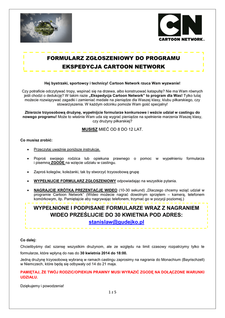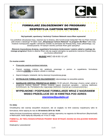 FORMULARZ ZGŁOSZENIOWY DO PROGRAMU EKSPEDYCJA CARTOON NETWORK Hej bystrzaki, sportowcy i technicy! Cartoon Network rzuca Wam wyzwanie! Czy potraficie odczytywać tropy, wspinać się na drzewa, albo konstruować katapultę? Nie ma Wam równych jeśli chodzi o dedukcję? W takim razie „Ekspedycja Cartoon Network” to program dla Was! Tylko tutaj możecie rozwiązywać zagadki i zamieniać medale na pieniądze dla Waszej klasy, klubu piłkarskiego, czy stowarzyszenia. W każdym odcinku pomoże Wam gość specjalny! Zbierzcie trzyosobową drużynę, wypełnijcie formularze konkursowe i weźcie udział w castingu do nowego programu! Może to właśnie Wam uda się wygrać pieniądze na spełnienie marzenia Waszej klasy, czy drużyny piłkarskiej? MUSISZ MIEĆ OD 8 DO 12 LAT. Co musisz zrobić: Przeczytaj uważnie poniższe instrukcje. Poproś swojego rodzica lub opiekuna prawnego i pisemną ZGODĘ na wzięcie udziału w castingu. Zaproś kolegów, koleżanki, tak by stworzyć trzyosobową grupę WYPEŁNIJCIE FORMULARZ ZGŁOSZENIOWY odpowiadając na wszystkie pytania. NAGRAJCIE KRÓTKĄ PREZENTACJĘ WIDEO (10-30 sekund) „Dlaczego chcemy wziąć udział w programie Cartoon Network” (Wideo możecie nagrać dowolnym sprzętem – kamerą, telefonem komórkowym, itp. Pamiętajcie aby nagrywając telefonem, trzymać go w pozycji poziomej.) o pomoc w wypełnieniu formularza WYPEŁNIONE I PODPISANE FORMULARZE WRAZ Z NAGRANIEM WIDEO PRZEŚLIJCIE DO 30 KWIETNIA POD ADRES: [email protected] Co dalej: Chcielibyśmy dać szansę wszystkim drużynom, ale ze względu na limit czasowy rozpatrzymy tylko te formularze, które wpłyną do nas do 30 kwietnia 2014 do 18:00. Jedną drużynę trzyosobową wybraną w ramach castingu zaprosimy na nagrania do Monachium (Bayrischzell) w Niemczech, które będą się odbywały od 14 do 21 maja. PAMIĘTAJ, ŻE TWÓJ RODZIC/OPIEKUN PRAWNY MUSI WYRAZIĆ ZGODĘ NA DOŁĄCZONE WARUNKI UDZIAŁU. Dziękujemy i powodzenia! 1z5 Do wypełnienia przez każdego z członków drużyny IMIĘ I NAZWISKO................................................................................................................................................. ADRES (Z KODEM POCZTOWYM): .................................................................................................................... DATA URODZENIA: ......................................................................WIEK: ............................................................ OBYWATELSTWO:............................................................................................................................................... IMIĘ I NAZWISKO RODZICA/OPIEKUNA PRAWNEGO...................................................................................... NUMER TELEFONU DO RODZICA/OPIEKUNA PRAWNEGO: (DOMOWY) ...................................................... (KOMÓRKOWY) ................................................. Moje motto życiowe brzmi: ............................................................................................................................................................................... ............................................................................................................................................................................... .............................................................................................................................................................................. Rzeczy, które świetnie mi wychodzą to: (np. śpiewanie, majsterkowanie, sport, rysowanie itd.) ............................................................................................................................................................................... ............................................................................................................................................................................... ............................................................................................................................................................................... Moje słabsze strony, nad którymi muszę jeszcze popracować to: (np. śpiewanie, majsterkowanie, sport, rysowanie itd.) ............................................................................................................................................................................... ............................................................................................................................................................................... ............................................................................................................................................................................... Miejsca, w których najbardziej lubię spotykać się z przyjaciółmi to: ............................................................................................................................................................................... ............................................................................................................................................................................... ............................................................................................................................................................................... Co lubię robić w wolnym czasie: ............................................................................................................................................................................... ............................................................................................................................................................................... ............................................................................................................................................................................... 2z5 FORMULARZ ZGODY RODZICA/OPIEKUNA PRAWNEGO Do wypeł