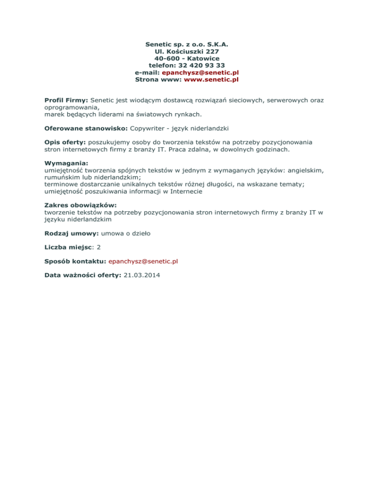 Senetic sp. z o.o. S.K.A. Ul. Kościuszki 227 40-600 - Katowice telefon: 32 420 93 33 e-mail: [email protected] Strona www: www.senetic.pl Profil Firmy: Senetic jest wiodącym dostawcą rozwiązań sieciowych, serwerowych oraz oprogramowania, marek będących liderami na światowych rynkach. Oferowane stanowisko: Copywriter - język niderlandzki Opis oferty: poszukujemy osoby do tworzenia tekstów na potrzeby pozycjonowania stron internetowych firmy z branży IT. Praca zdalna, w dowolnych godzinach. Wymagania: umiejętność tworzenia spójnych tekstów w jednym z wymaganych języków: angielskim, rumuńskim lub niderlandzkim; terminowe dostarczanie unikalnych tekstów różnej długości, na wskazane tematy; umiejętność poszukiwania informacji w Internecie Zakres obowiązków: tworzenie tekstów na potrzeby pozycjonowania stron internetowych firmy z branży IT w języku niderlandzkim Rodzaj umowy: umowa o dzieło Liczba miejsc: 2 Sposób kontaktu: [email protected] Data ważności oferty: 21.03.2014