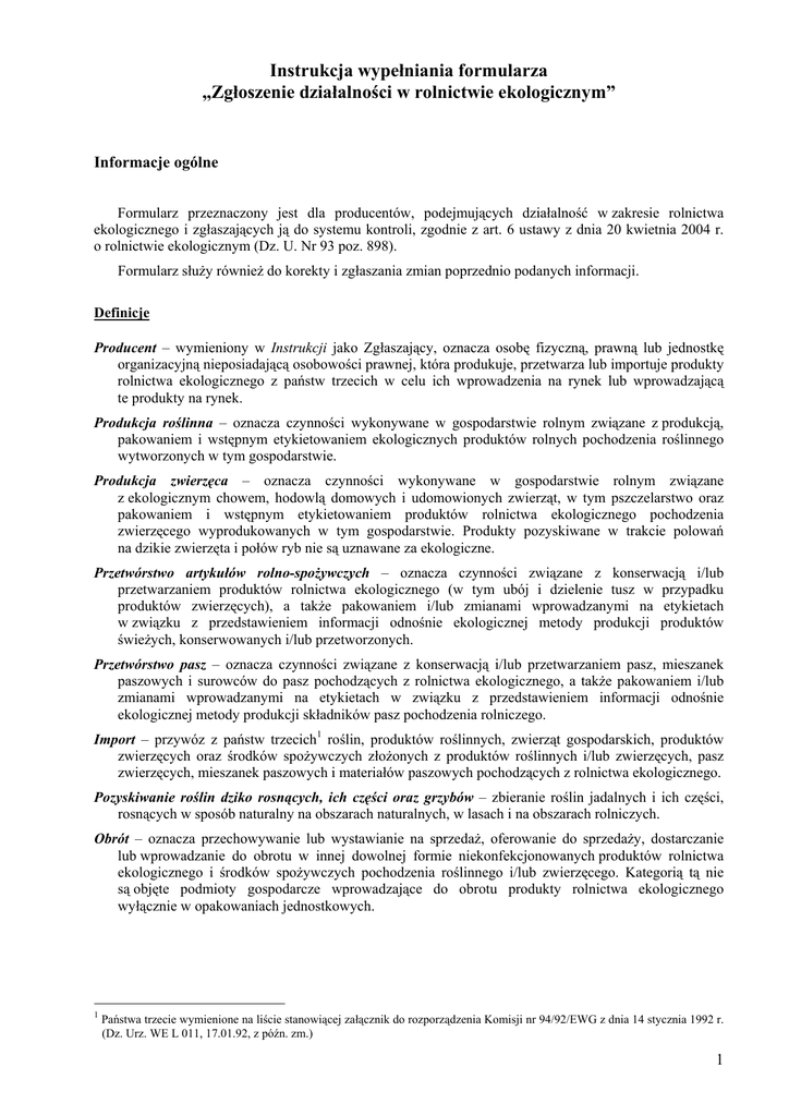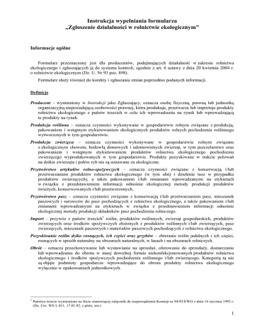 Instrukcja wypełniania formularza „Zgłoszenie działalności w rolnictwie ekologicznym” Informacje ogólne Formularz przeznaczony jest dla producentów, podejmujących działalność w zakresie rolnictwa ekologicznego i zgłaszających ją do systemu kontroli, zgodnie z art. 6 ustawy z dnia 20 kwietnia 2004 r. o rolnictwie ekologicznym (Dz. U. Nr 93 poz. 898). Formularz służy również do korekty i zgłaszania zmian poprzednio podanych informacji. Definicje Producent – wymieniony w Instrukcji jako Zgłaszający, oznacza osobę fizyczną, prawną lub jednostkę organizacyjną nieposiadającą osobowości prawnej, która produkuje, przetwarza lub importuje produkty rolnictwa ekologicznego z państw trzecich w celu ich wprowadzenia na rynek lub wprowadzającą te produkty na rynek. Produkcja roślinna – oznacza czynności wykonywane w gospodarstwie rolnym związane z produkcją, pakowaniem i wstępnym etykietowaniem ekologicznych produktów rolnych pochodzenia roślinnego wytworzonych w tym gospodarstwie. Produkcja zwierzęca – oznacza czynności wykonywane w gospodarstwie rolnym związane z ekologicznym chowem, hodowlą domowych i udomowionych zwierząt, w tym pszczelarstwo oraz pakowaniem i wstępnym etykietowaniem produktów rolnictwa ekologicznego pochodzenia zwierzęcego wyprodukowanych w tym gospodarstwie. Produkty pozyskiwane w trakcie polowań na dzikie zwierzęta i połów ryb nie są uznawane za ekologiczne. Przetwórstwo artykułów rolno-spożywczych – oznacza czynności związane z konserwacją i/lub przetwarzaniem produktów rolnictwa ekologicznego (w tym ubój i dzielenie tusz w przypadku produktów zwierzęcych), a także pakowaniem i/lub zmianami wprowadzanymi na etykietach w związku z przedstawieniem informacji odnośnie ekologicznej metody produkcji produktów świeżych, konserwowanych i/lub przetworzonych. Przetwórstwo pasz – oznacza czynności związane z konserwacją i/lub przetwarzaniem pasz, mieszanek paszowych i surowców do pasz pochodzących z rolnictwa ekologicznego, a także pakowaniem i/lub zmianami wprowadzanymi na etykietach w związku z przedstawieniem informacji odnośnie ekologicznej metody produkcji składników pasz pochodzenia rolniczego. Import – przywóz z państw trzecich1 roślin, produktów roślinnych, zwierząt gospodarskich, produktów zwierzęcych oraz środków spożywczych złożonych z produktów roślinnych i/lub zwierzęcych, pasz zwierzęcych, mieszanek paszowych i materiałów paszowych pochodzących z rolnictwa ekologicznego. Pozyskiwanie roślin dziko rosnących, ich części oraz grzybów – zbieranie roślin jadalnych i ich części, rosnących w sposób naturalny na obszarach naturalnych, w lasach i na obszarach rolniczych. Obrót – oznacza przechowywanie lub wystawianie na sprzedaż, oferowanie do sprzedaży, dostarczanie lub wprowadzanie do obrotu w innej dowolnej formie niekonfekcjonowanych produktów rolnictwa ekologicznego i środków spożywczych pochodzenia roślinnego i/lub zwierzęcego. Kategorią tą nie są objęte podmioty gospodarcze wprowadzające do obrotu produkty rolnictwa ekologicznego wyłącznie w opakowaniach jednostkowych. 1 Państwa trzecie wymienione na liście stanowiącej załącznik do rozporządzenia Komisji nr 94/92/EWG z dnia 14 stycznia 1992 r. (Dz. Urz. WE L 011, 17.01.92, z późn. zm.) 1 Miejsce składania zgłoszenia Formularz należy wypełnić w dwóch egzemplarzach i wysłać jednocześnie: • pierwszy egzemplarz – listem poleconym do wojewódzkiego inspektora jakości handlowej artykułów rolno-spożywczych właściwego dla miejsca zamieszkania lub siedziby Zgłaszającego (lista adresowa – patrz Załącznik B do instrukcji) • drugi egzemplarz – listem poleconym do wybranej jednostki certyfikującej (lista adresowa – patrz Załącznik C) • kopię Zgłoszenia producent zobowiązany jest przechowywać u siebie. Termin składania Zgłoszenia można dokonywać przez cały rok. W przypadku zaistnienia zmiany danych zawartych w Zgłoszeniu należy je zgłosić w ciągu 30 dni od daty zaistnienia tych zmian do właściwego wojewódzkiego inspektora JHAR-S oraz wybranej Jednostki Certyfikującej. Zasady wypełniania 1. Zgłoszenie obejmuje: Formularz zgłoszeniowy, Załączniki 1,2 oraz Deklarację. 2. Zgłoszenie należy wypełnić czytelnie długopisem, drukowanymi literami bez skreśleń i poprawek oraz złożyć czytelny podpis na 2 stronie Zgłoszenia oraz Deklaracji wraz z podaniem daty. W razie pomyłki podczas wypełniania Załącznika 1 należy skreślić cały wiersz, w którym wystąpił błąd, a w kolumnie Uwagi Zgłaszającego należy złożyć podpis i wpisać datę. 3. W poszczególnych sekcjach Zgłoszenia (str.1-2), właściwe pole zaznaczyć poprzez wpisanie w kratkę znaku X. 4. Pola, które nie dotyczą zgłaszającego pozostają puste (np. brak adresu e-mail). 5. Zgłaszający wypełnia strony 1-2 Zgłoszenia w obowiązujących go białych polach. Pola zaznaczone kolorem szarym wypełnia pracownik wojewódzkiego IJHAR-S lub jednostki certyfikującej. 6. Informacje zawarte w Zgłoszeniu powinny być aktualne, zgodne z prawdą i możliwe do zweryfikowania. 7. W przypadku małżeństwa lub podmiotów będących współposiadaczami gospodarstwa rolnego, jako zgłaszający występuje ten podmiot, która posiada numer identyfikacyjny nadany przez AR i MR na podstawie ustawy z dnia 18 grudnia 2003 r. o krajowym systemie ewidencji producentów, ewidencji gospodarstw rolnych oraz ewidencji wniosków o przyznanie płatności (Dz. U. Nr 10, poz. 76). 8. W przypadku wysłania wniosku pocztą, potwierdzeniem tego faktu dla Zgłaszającego jest pocztowe potwierdzenie nadania listu poleconego. 9. W przypadku zmiany lub korekty danych, Zgłaszający obowiązkowo wypełnia sekcje: I, II, III, VII, VIII, XIII oraz dodatkowo wymienione sekcje i/lub załączniki, w których zaszły zmiany lub dokonana została korekta. 10. W przypadku, gdy liczba działek ewide