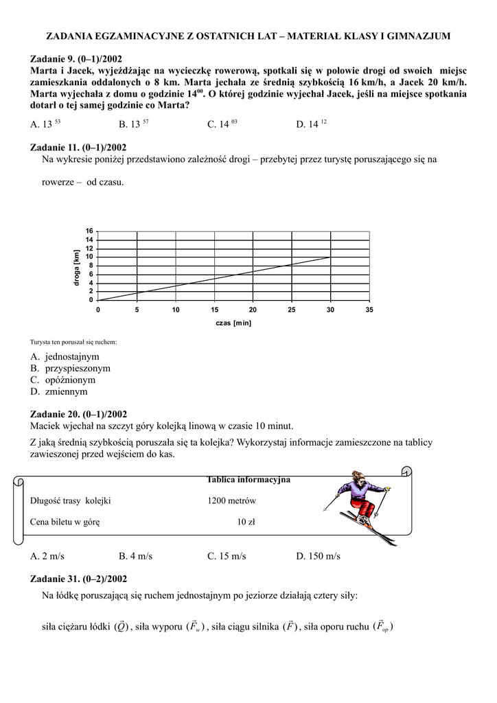ZADANIA EGZAMINACYJNE Z OSTATNICH LAT – MATERIAŁ KLASY I GIMNAZJUM Zadanie 9. (0–1)/2002 Marta i Jacek, wyjeżdżając na wycieczkę rowerową, spotkali się w połowie drogi od swoich miejsc zamieszkania oddalonych o 8 km. Marta jechała ze średnią szybkością 16 km/h, a Jacek 20 km/h. Marta wyjechała z domu o godzinie 1400. O której godzinie wyjechał Jacek, jeśli na miejsce spotkania dotarł o tej samej godzinie co Marta? A. 13 53 B. 13 57 C. 14 03 D. 14 12 Zadanie 11. (0–1)/2002 Na wykresie poniżej przedstawiono zależność drogi – przebytej przez turystę poruszającego się na droga [km] rowerze – od czasu. 16 14 12 10 8 6 4 2 0 0 5 10 15 20 25 30 35 czas [m in] Turysta ten poruszał się ruchem: A. B. C. D. jednostajnym przyspieszonym opóźnionym zmiennym Zadanie 20. (0–1)/2002 Maciek wjechał na szczyt góry kolejką linową w czasie 10 minut. Z jaką średnią szybkością poruszała się ta kolejka? Wykorzystaj informacje zamieszczone na tablicy zawieszonej przed wejściem do kas. Tablica informacyjna Długość trasy kolejki 1200 metrów Cena biletu w górę A. 2 m/s 10 zł B. 4 m/s C. 15 m/s D. 150 m/s Zadanie 31. (0–2)/2002 Na łódkę poruszającą się ruchem jednostajnym po jeziorze działają cztery siły: siła ciężaru łódki (Q ) , siła wyporu ( Fw ) , siła ciągu silnika (F ) , siła oporu ruchu ( Fop ) kierunek ruchu łódki łódka jezioro Na powyższym schemacie narysuj wektory wymienionych sił i podpisz je zgodnie z oznaczeniami podanymi w nawiasach. Informacja do zadań: 7 – 9. v W chwili, gdy zapaliły się zielone światła, samochód F ruszył ze skrzyżowania i został w tym momencie wyprzedzony przez samochód S. Na wykresie przedstawiono zależność szybkości tych samochodów od czasu, jaki upłynął od zapalenia się zielonych świateł. 35 30 25 20 15 10 5 0 F S 0 2 4 6 8 Zadanie 7. (0 – 1)/2003 W szóstej sekundzie A. B. C. D. oba samochody znajdowały się w tej samej odległości od skrzyżowania. samochód S wyprzedził samochód F. oba samochody miały takie samo przyśpieszenie. oba samochody osiągnęły tę samą szybkość. Zadanie 8. (0 – 1)/2003 Wartość przyśpieszenia samochodu F była równa A. 6 m s2 B. 2,5 m s2 C. 0,4 m s2 D. 0 Zadanie 9. (0 – 1)/2003 Wartość przyśpieszenia samochodu S była równa A. 0 m s2 B. 4 m s2 C. 6 m s2 D. 15 m s2 m s2 10 12 t (s) Zadanie 9. (0-1)/2004 Dwaj chłopcy, stojąc na deskorolkach, pociągnęli za końce napiętej między nimi liny. Jeżeli pierwszy chłopiec ma dwa razy większą masę od drugiego, to A. B. C. D. żaden z chłopców nie uzyska prędkości. obaj chłopcy uzyskają prędkość o takiej samej wartości. uzyska on dwa razy większą szybkość niż lżejszy chłopiec. uzyska on dwa razy mniejszą szybkość niż lżejszy chłopiec. Zadanie 31. (0-3)/2005 Teleskop Hubble’a znajduje się na orbicie okołoziemskiej na wysokości około 600 km nad Ziemią. Oblicz wartość prędkości, z jaką porusza się on wokół Ziemi, jeżeli czas jednego okrążenia Ziemi wynosi około 100 minut. Zapisz obliczenia. 22 (Przyjmij RZ = 6400 km, π = ) 7 RZ teleskop Hubble’a Ziemia orbita Zadanie 32. (0-2)/2005 Oblicz czas swobodnego spadku metalowej kulki z wysokości 20 m. Przyjmij wartość przyspieszenia m 2 ziemskiego g = 10 s i pomiń opór powietrza. Zapisz obliczenia. Zadanie 22. (0-1)/2007 Kropla wody spadająca z chmury poruszała się początkowo ruchem przyspieszonym, a później ruchem jednostajnym. Wybierz rysunki, na których poprawnie przedstawiono siły działające na kroplę wody w początkowej i w końcowej fazie spadania ( Fo oznacza siłę oporu powietrza, Fg – siłę ciężkości). F F o o Fo Fg Fg I II Fg III A. Faza początkowa – rysunek II, końcowa – rysunek III B. Faza początkowa – rysunek I, końcowa – rysunek III C. Faza początkowa – rysunek II, końcowa – rysunek IV Fg IV