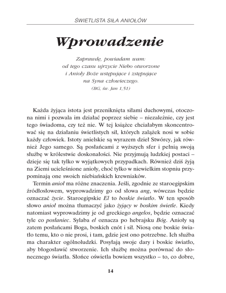 WIETLISTA SI£A ANIO£ÓW Wprowadzenie Zaprawdê, powiadam wam: od tego czasu ujrzycie Niebo otworzone i Anio³y Bo¿e wstêpuj¹ce i zstêpuj¹ce na Syna cz³owieczego. (BG, w. Jan 1,51) Każda żyjąca istota jest przeniknięta siłami duchowymi, otoczona nimi i pozwala im działać poprzez siebie – niezależnie, czy jest tego świadoma, czy też nie. W tej książce chciałabym skoncentrować się na działaniu świetlistych sił, których zalążek nosi w sobie każdy człowiek. Istoty anielskie są wyrazem dzieł Stwórcy, jak również Jego samego. Są posłańcami z wyższych sfer i pełnią swoją służbę w królestwie doskonałości. Nie przyjmują ludzkiej postaci – dzieje się tak tylko w wyjątkowych przypadkach. Również dziś żyją na Ziemi ucieleśnione anioły, choć tylko w niewielkim stopniu przypominają one swoich niebiańskich krewniaków. Termin anioł ma różne znaczenia. Jeśli, zgodnie ze staroegipskim źródłosłowem, wyprowadzimy go od słowa ang, wówczas będzie oznaczać życie. Staroegipskie El to boskie światło. W ten sposób słowo anioł można tłumaczyć jako żyjący w boskim świetle. Kiedy natomiast wyprowadzimy je od greckiego angelos, będzie oznaczać tyle co posłaniec. Sylaba el oznacza po hebrajsku Bóg. Anioły są zatem posłańcami Boga, boskich cnót i sił. Niosą one boskie światło temu, kto o nie prosi, i tam, gdzie jest ono potrzebne. Ich służba ma charakter ogólnoludzki. Posyłają swoje dary i boskie światło, aby błogosławić stworzenie. Ich służbę można porównać do słonecznego światła. Słońce oświetla bowiem wszystko – to, co dobre, 14 Wprowadzenie i to, co złe; to, co potrzebuje światła, i to, co potrzebuje mroku. Po prostu świeci dla wszystkich i wszystkiego. W całym wszechświecie istnieją różne, niezliczone sfery drgań i częstotliwości, które tworzą królestwa i zachodzą na siebie nawzajem. Ludzie bardzo wrażliwi i jasnowidze potrafią bezpośrednio wyczuwać obecność tych królestw swoimi wyostrzonymi zmysłami. Normalny człowiek wyposażony jest w zmysły, które nie są na tyle czułe, aby wychwytywać drgania innych sfer, dlatego tak wielu z nas chętnie zalicza królestwa istot niebiańskich do świata fantazji i snów. Tylko w kryzysowych sytuacjach lub w przypadkach doświadczenia cudów przypominamy sobie o obecności naszych niewidzialnych pomocników. Tymczasem nie ma takiej planety ani formy istnienia we wszechświecie, która pozostawałaby przy życiu i mogłaby wypełniać swoją boską misję bez pomocy istot z wyższych sfer. Kiedy aniołowie opuszczają żyjącą istotę, zaczyna ona zmierzać ku swojej zagładzie. Jeśli jednak nawiąże bliższy kontakt z aniołem i wyraźnie odczuje jego działanie, oznacza to, że nastaje dla niej Nowa Era. Anioły są doskonałymi istotami, zbudowanymi ze świetlistej energii, które potrafią wcielać się w każdą formę bytu. Żyją w doskonałych królestwach w eterze*, położonych poza płaszczyzną astralną** naszej Ziemi. Te niewidzialne królestwa wiecznej szczęśliwości określa się czasem mianem Arkadii, Elizjum, Nirwany, Raju, Walhalli, Shambali... Są to potężne, bezgranicznie piękne miejsca siły. Sfery i świetliste światy aniołów wypełnione są doskonałą harmonią, pokojem i wieczną miłością. Anioły nie kalają się tym, co złe, negatywne. Są istotami doskonałymi. Mimo że działają między ciemnymi siłami, nie są nimi w żaden sposób skażone. * Eter: Piąty żywioł – najbardziej odległy od materii i najbardziej metafizyczny. ** Forma energetyczna. 15 WIETLISTA SI£A ANIO£ÓW Na samym początku pomiędzy ludźmi a aniołami istniała naturalna więź. Kiedy człowiek popełnił grzech pierworodny i przez to odłączył się od Boga, otrzymał od aniołów „Księgę Mądrości”, zwaną kabałą. Zawarta w niej wiedza, jak również pomoc aniołów, dają mu szansę na powrót do pierwotnej jedności z Bogiem. Istoty duchowego królestwa były i są zawsze gotowe, aby prowadzić człowieka drogą do Boga. Są pośrednikami pomiędzy czystą, boską energią a człowiekiem, który – poprzez swoje ucieleśnienie – żyje cały czas na przecięciu Dobra i Zła, na arenie odwiecznej rozgrywki pomiędzy przeciwnymi sobie siłami. Od samego początku epoki Wodnika odkopujemy zasypane rytuały i misteria, powracamy do tego, co przez stulecia było zapomniane. Wszystkim ludziom, którzy udają się w tę drogę, zostają objawione ukryte tajemnice. Coraz bardziej i coraz świadomiej doświadczamy działania duchowego królestwa w życiu codziennym. Ta książka ma służyć umacnianiu więzi pomiędzy ludźmi a aniołami, umożliwiać jej lepsze i wyraźniejsze odczuwanie. Każdy człowiek, który nosi w sercu takie pragnienie, doświadczy w swoim życiu miłości, przewodnictwa, pomocy i siły aniołów. 16