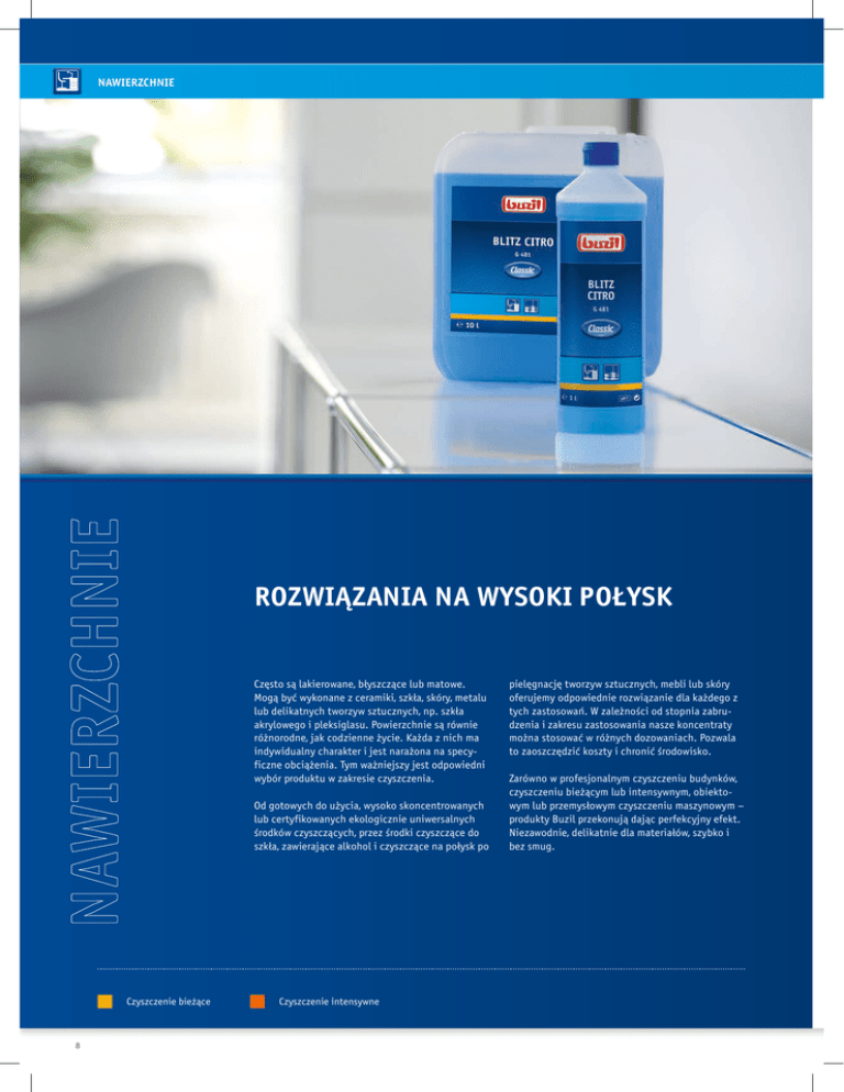 NAWIERZCHNIE ROZWI¥ZANIA NA WYSOKI PO£YSK Czêsto s¹ lakierowane, b³yszcz¹ce lub matowe. Mog¹ byæ wykonane z ceramiki, szk³a, skóry, metalu lub delikatnych tworzyw sztucznych, np. szk³a akrylowego i pleksiglasu. Powierzchnie s¹ równie ró¿norodne, jak codzienne ¿ycie. Ka¿da z nich ma indywidualny charakter i jest nara¿ona na specyficzne obci¹¿enia. Tym wa¿niejszy jest odpowiedni wybór produktu w zakresie czyszczenia. Od gotowych do u¿ycia, wysoko skoncentrowanych lub certyfikowanych ekologicznie uniwersalnych œrodków czyszcz¹cych, przez œrodki czyszcz¹ce do szk³a, zawieraj¹ce alkohol i czyszcz¹ce na po³ysk po Czyszczenie bie¿¹ce 8 Czyszczenie intensywne pielêgnacjê tworzyw sztucznych, mebli lub skóry oferujemy odpowiednie rozwi¹zanie dla ka¿dego z tych zastosowañ. W zale¿noœci od stopnia zabrudzenia i zakresu zastosowania nasze koncentraty mo¿na stosowaæ w ró¿nych dozowaniach. Pozwala to zaoszczêdziæ koszty i chroniæ œrodowisko. Zarówno w profesjonalnym czyszczeniu budynków, czyszczeniu bie¿¹cym lub intensywnym, obiektowym lub przemys³owym czyszczeniu maszynowym – produkty Buzil przekonuj¹ daj¹c perfekcyjny efekt. Niezawodnie, delikatnie dla materia³ów, szybko i bez smug. NAWIERZCHNIE Neutralny œrodek czyszcz¹cy o intensywnym zapachu pH 7 Blitz Citro G 481 Blitz Orange G 482 Wszystkie powierzchnie odporne na dzia³anie wody; np. powierzchnie z tworzywa sztucznego i powierzchnie szklane, drzwi, ramy okienne i grzejniki; posadzki pod³ogowe odporne na dzia³anie wody; materia³y odporne na dzia³anie wody Blitz Tropic G 483 Wariant zapachowy: pomarañczowy Wariant zapachowy: owoce tropikalne Pojemnoœæ 1 l, 10 l, 200 l Pojemnoœæ 1 l, 10 l Zalety produktu Delikatny neutralny uniwersalny œrodek Œwie¿y cytrusowy zapach Wysycha szybko nie pozostawiaj¹c smug Idealny do po³yskuj¹cych powierzchni Pojemnoœæ 40 ml, 1 l, 10 l, 200 l 20 - 50 ml / 10 l wody Uniwersalny, lekko alkaliczny œrodek czyszcz¹cy niezawieraj¹cy œrodków powierzchniwo czynnych pH 10 Nab³yszczaj¹cy œrodek o wysokiej zwil¿alnoœci do mycia nawierzchni wra¿liwych O Tens G 500 pH 8 Uniclean G 511 Do pielêgnacji oraz intensywnego czyszczenia nawierzchni, posadzek pod³ogowych i materia³ów odpornych na dzia³anie wilgoci; wyk³adzin tekstylnych lub mebli tapicerowanych; p³ytek kamionkowych Wszystkie powierzchnie odporne na dzia³anie wody, jak np. powierzchnie z tworzyw sztucznych, powierzchnie lakierowane; wszystkie pod³ogi odporne na dzia³anie wody, np. posadzki laminowane i kamienne o wysokim po³ysku, zabezpieczony parkiet. Zalety produktu Spontaniczne dzia³anie myj¹ce Czyœci bez pozostawiania smug WyraŸnie zmniejsza ponowne zabrudzenie kamionki szlachetnej, wyk³adzin tekstylnych oraz innych nawierzchni Bezbarwny i bezwonny Razem ze œrodkiem O Tens G 501 produkt tworzy doskona³y system do czyszczenia gresu Zalety produktu Delikatny dla materia³ów (neutralne pH) Do uniwersalnego zastosowania Przyjemna nuta zapachowa Œrodek niskopienny Nie zawiera barwników Wysoce zwil¿aj¹cy Pojemnoœæ 1 l, 10 l Pojemnoœæ 1 l, 10 l 20 - 100 ml / 10 l wody 100 - 200 ml / 10 l wody 100 - 1000 ml / 10 l wody 200 - 1000 ml / 10 l wody 50 ml / 10 l wody 9 NAWIERZCHNIE Gotowy do u¿ycia srodek czyszcz¹cy z nasadk¹ spryskuj¹c¹ pH 10 Reso Clean G 515 Ekologiczny superkoncentrat do codziennej pielêgnacji Planta® Orange P 311 Do wszystkich nawierzchni odpornych na dzia³anie wody, tj. szk³o i nawierzchnie sztuczne; stal szlachetna, resopal, klawiatury Wszystkie odporne na dzia³anie wody powierzchnie i posadzki pod³ogowe. Zalecany do czyszczenia kuchni przemys³owych, gastronomii i przemys³u spo¿ywczego Zalety produktu Doskona³e dzia³anie myj¹ce Usuwa bez problemu t³uste zabrudzenia i œlady po nikotynie oraz odciski palców D³ugo utrzymuj¹ca siê nuta zapachowa Po³ysk bez smug i koniecznoœci dosuszania Zalety produktu Certyfikat ekologiczny Œwie¿y pomarañczowy zapach Doskona³a wydajnoœæ mycia Szczególnie sprawdza siê w przypadku oleistych i t³ustych zabrudzeñ Pojemnoœæ 1 l, 10 l Pojemnoœæ 600 ml, 10 l bez rozcieñczania 20 - 50 ml / 10 l wody Ekologiczny uniwersalny œrodek czyszcz¹cy pH 7 Planta® Soft P 313 50 ml / 10 l wody Gotowy do u¿ycia uniwersalny œrodek do nawierzchni z nasadk¹ spryskujac¹ Powierzchnie odporne na dzia³anie wody jak np. tworzywa sztuczne, szk³o akrylowe, powierzchnie szklane i lustrzane; lakierowane powierzchnie o wysokim po³ysku; powierzchnie ceramiczne; powierzchnie metalowe Zalety produktu Certyfikat ekologiczny Lœni¹cy po³ysk Wysycha szybko, nie pozostawiaj¹c smug Delikatny dla powierzchni Zalety produktu Spryskaæ, zetrzeæ i gotowe Niezwyk³a zdolnoœæ rozpuszczania brudu dziêki efektowi easy-to-clean Bardzo ekonomiczny dziêki ma³emu zu¿yciu Subtelny zapach Pozostawia po³ysk bez smug Pojemnoœæ 1 l, 10 l 10 50 ml / 10 l wody pH 9,5 Drizzle® Blue SP 20 Wszystkie odporne na dzia³anie wody, b³yszcz¹ce powierzchnie i posadzki pod³ogowe, a w szczególnoœci powierzchnie ze szk³a i tworzywa sztucznego; b³yszcz¹cy kamieñ sztuczny i naturalny 20 - 50 ml / 10 l wody pH 10 Pojemnoœæ 600 ml, 10 l bez rozcieñczania NAWIERZCHNIE Neutralny œrodek myj¹cy i chroni¹cy do tworzywa sztucznego pH 6,5 Vario Clean Trendy T 560 Œrodek do czyszczenia nawierzchni w przemyœle pH 10 Indumaster® Protect IR 30 Produkt przenanczony do materia³ów wra¿liwych, tj. szk³o akrylowe i pleksiglas; tablice szkolne; aluminium Rekomendowany dla przemys³u, tj. do czyszczenia i konserwacji maszyn produkcyjnych, jak np. CNC; plandeki pojazdów ciê¿arowych i p³aty namiotowe; wszystkie odporne na dzia³anie zasad materia³y, powierzchnie i posadzki pod³ogowe Zalety produktu Czyœci szybko i skutecznie Znikome ponowne zabrudzenie dziêki efektowi easy to clean (co u³atwia czyszczenie) Delikatny dla materia³ów Dobre w³aœciwoœci dysperguj¹ce Brak korozji naprê¿eniowej na szkle akrylowym i