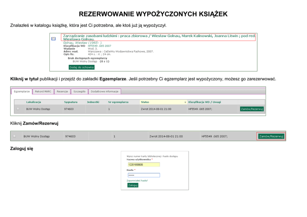REZERWOWANIE WYPOśYCZONYCH KSIĄśEK Znalazłeś w katalogu ksiąŜkę, która jest Ci potrzebna, ale ktoś juŜ ją wypoŜyczył. Kliknij w tytuł publikacji i przejdź do zakładki Egzemplarze. Jeśli potrzebny Ci egzemplarz jest wypoŜyczony, moŜesz go zarezerwować. Kliknij Zamów/Rezerwuj Zaloguj się Jako Miejsce odbioru wybierz BUW WypoŜyczalnia i kliknij Dalej Pamiętaj! Zawsze wybieraj miejsce odbioru tylko z tej biblioteki, w której znajduje się ksiąŜka, w innym przypadku rezerwacja nie zostanie zrealizowana. Sprawdź szczegóły zamówienia i kliknij Dalej: Na Twoim koncie w zakładce Zamówienia/Rezerwacje pojawi się informacja o zarezerwowanej ksiąŜce: • • Status W toku oznacza, Ŝe ksiąŜka jeszcze nie została zwrócona do biblioteki. Miejsce w kolejce 1 oznacza, Ŝe jesteś pierwszym w kolejce oczekujących na zwrot ksiąŜki. Informacja o tym, Ŝe ksiąŜkę juŜ moŜesz wypoŜyczyć w WypoŜyczalni Miejscowej, otrzymasz pocztą elektroniczną na adres e-mail umieszczony na Twoim koncie w zakładce Kontakt. RównieŜ na Twoim koncie pojawi się odpowiednia informacja: ksiąŜka ta będzie miała status Dostępne do odbioru, a w kolumnie Wysłane powiadomienie pojawi się informacja Tak. Pamiętaj! Na odbiór zarezerwowanej ksiąŜki masz 5 dni od otrzymania powiadomienia. WaŜne! • Rezerwacja nie jest toŜsama z jej zamówieniem! Rezerwując wypoŜyczoną ksiąŜkę, wpisujesz się tylko na listę osób oczekujących na zwrot tej ksiąŜki. • Rezerwować ksiąŜki mogą tylko ci czytelnicy BUW, którzy mają uprawnienia do wypoŜyczania ksiąŜek oraz posiadają waŜne konto biblioteczne.