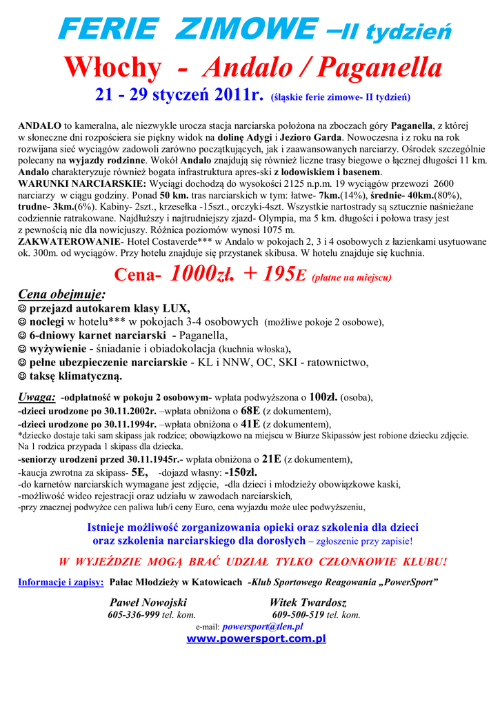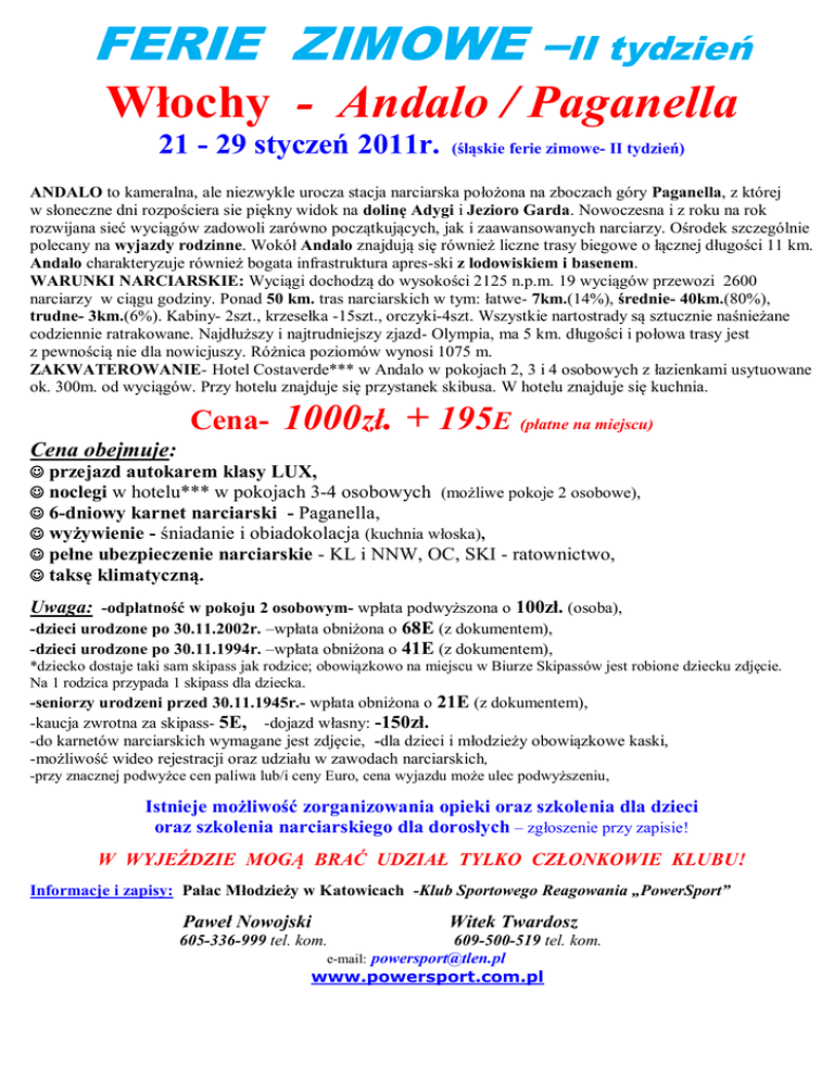 FERIE ZIMOWE –II tydzień Włochy - Andalo / Paganella 21 - 29 styczeń 2011r. (śląskie ferie zimowe- II tydzień) ANDALO to kameralna, ale niezwykle urocza stacja narciarska położona na zboczach góry Paganella, z której w słoneczne dni rozpościera sie piękny widok na dolinę Adygi i Jezioro Garda. Nowoczesna i z roku na rok rozwijana sieć wyciągów zadowoli zarówno początkujących, jak i zaawansowanych narciarzy. Ośrodek szczególnie polecany na wyjazdy rodzinne. Wokół Andalo znajdują się również liczne trasy biegowe o łącznej długości 11 km. Andalo charakteryzuje również bogata infrastruktura apres-ski z lodowiskiem i basenem. WARUNKI NARCIARSKIE: Wyciągi dochodzą do wysokości 2125 n.p.m. 19 wyciągów przewozi 2600 narciarzy w ciągu godziny. Ponad 50 km. tras narciarskich w tym: łatwe- 7km.(14%), średnie- 40km.(80%), trudne- 3km.(6%). Kabiny- 2szt., krzesełka -15szt., orczyki-4szt. Wszystkie nartostrady są sztucznie naśnieżane codziennie ratrakowane. Najdłuższy i najtrudniejszy zjazd- Olympia, ma 5 km. długości i połowa trasy jest z pewnością nie dla nowicjuszy. Różnica poziomów wynosi 1075 m. ZAKWATEROWANIE- Hotel Costaverde*** w Andalo w pokojach 2, 3 i 4 osobowych z łazienkami usytuowane ok. 300m. od wyciągów. Przy hotelu znajduje się przystanek skibusa. W hotelu znajduje się kuchnia. Cena- 1000zł. + 195E (płatne na miejscu) Cena obejmuje: przejazd autokarem klasy LUX, noclegi w hotelu*** w pokojach 3-4 osobowych (możliwe pokoje 2 osobowe), 6-dniowy karnet narciarski - Paganella, wyżywienie - śniadanie i obiadokolacja (kuchnia włoska), pełne ubezpieczenie narciarskie - KL i NNW, OC, SKI - ratownictwo, taksę klimatyczną. Uwaga: -odpłatność w pokoju 2 osobowym- wpłata podwyższona o 100zł. (osoba), -dzieci urodzone po 30.11.2002r. –wpłata obniżona o 68E (z dokumentem), -dzieci urodzone po 30.11.1994r. –wpłata obniżona o 41E (z dokumentem), *dziecko dostaje taki sam skipass jak rodzice; obowiązkowo na miejscu w Biurze Skipassów jest robione dziecku zdjęcie. Na 1 rodzica przypada 1 skipass dla dziecka. -seniorzy urodzeni przed 30.11.1945r.- wpłata obniżona o 21E (z dokumentem), -kaucja zwrotna za skipass- 5E, -dojazd własny: -150zł. -do karnetów narciarskich wymagane jest zdjęcie, -dla dzieci i młodzieży obowiązkowe kaski, -możliwość wideo rejestracji oraz udziału w zawodach narciarskich, -przy znacznej podwyżce cen paliwa lub/i ceny Euro, cena wyjazdu może ulec podwyższeniu, Istnieje możliwość zorganizowania opieki oraz szkolenia dla dzieci oraz szkolenia narciarskiego dla dorosłych – zgłoszenie przy zapisie! W WYJEŹDZIE MOGĄ BRAĆ UDZIAŁ TYLKO CZŁONKOWIE KLUBU! Informacje i zapisy: Pałac Młodzieży w Katowicach -Klub Sportowego Reagowania „PowerSport” Paweł Nowojski Witek Twardosz 605-336-999 tel. kom. 609-500-519 tel. kom. e-mail: [email protected] www.powersport.com.pl