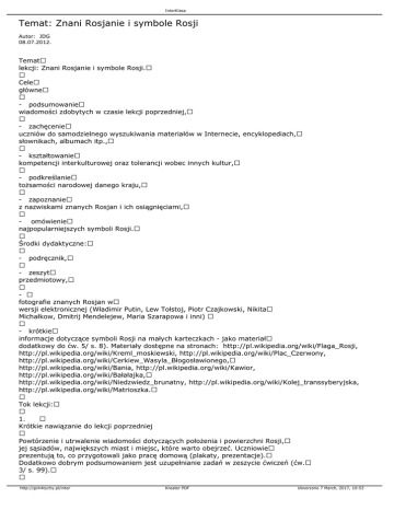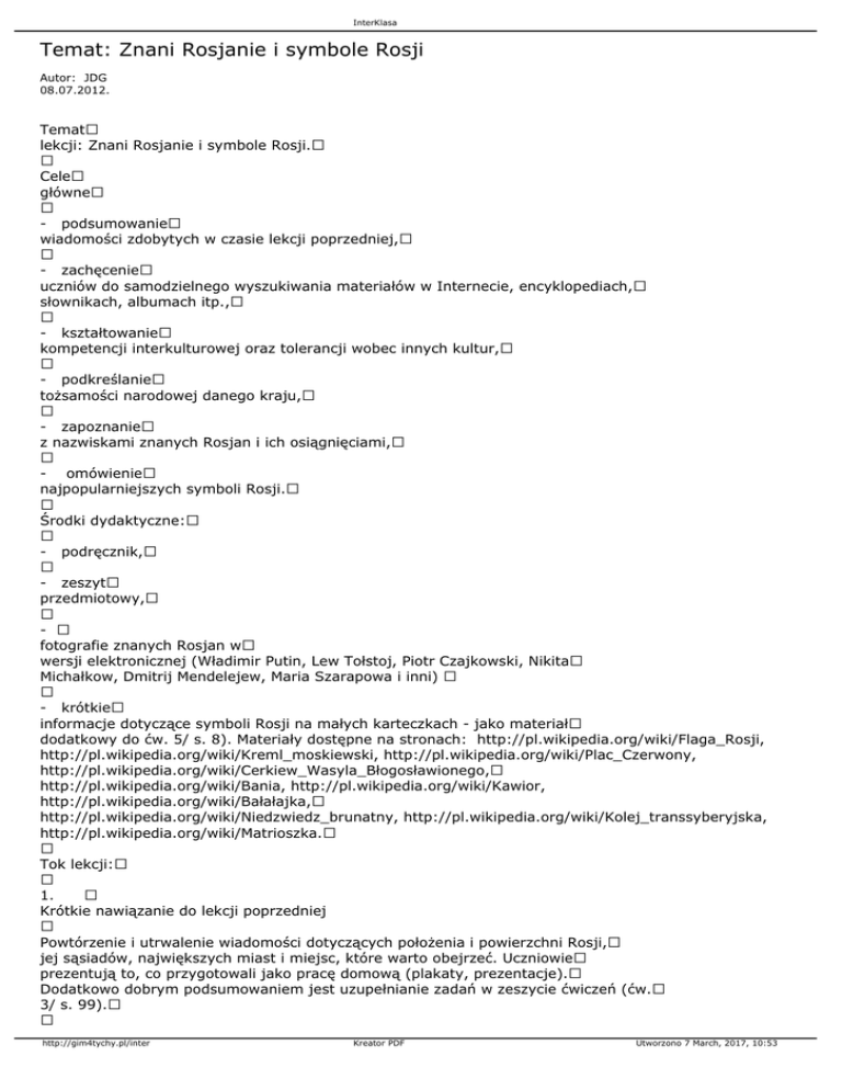 InterKlasa Temat: Znani Rosjanie i symbole Rosji Autor: JDG 08.07.2012. Temat lekcji: Znani Rosjanie i symbole Rosji. Cele główne - podsumowanie wiadomości zdobytych w czasie lekcji poprzedniej, - zachęcenie uczniów do samodzielnego wyszukiwania materiałów w Internecie, encyklopediach, słownikach, albumach itp., - kształtowanie kompetencji interkulturowej oraz tolerancji wobec innych kultur, - podkreślanie tożsamości narodowej danego kraju, - zapoznanie z nazwiskami znanych Rosjan i ich osiągnięciami, - omówienie najpopularniejszych symboli Rosji. Środki dydaktyczne: - podręcznik, - zeszyt przedmiotowy, - fotografie znanych Rosjan w wersji elektronicznej (Władimir Putin, Lew Tołstoj, Piotr Czajkowski, Nikita Michałkow, Dmitrij Mendelejew, Maria Szarapowa i inni) - krótkie informacje dotyczące symboli Rosji na małych karteczkach - jako materiał dodatkowy do ćw. 5/ s. 8). Materiały dostępne na stronach: http://pl.wikipedia.org/wiki/Flaga_Rosji, http://pl.wikipedia.org/wiki/Kreml_moskiewski, http://pl.wikipedia.org/wiki/Plac_Czerwony, http://pl.wikipedia.org/wiki/Cerkiew_Wasyla_Błogosławionego, http://pl.wikipedia.org/wiki/Bania, http://pl.wikipedia.org/wiki/Kawior, http://pl.wikipedia.org/wiki/Bałałajka, http://pl.wikipedia.org/wiki/Niedzwiedz_brunatny, http://pl.wikipedia.org/wiki/Kolej_transsyberyjska, http://pl.wikipedia.org/wiki/Matrioszka. Tok lekcji: 1. Krótkie nawiązanie do lekcji poprzedniej Powtórzenie i utrwalenie wiadomości dotyczących położenia i powierzchni Rosji, jej sąsiadów, największych miast i miejsc, które warto obejrzeć. Uczniowie prezentują to, co przygotowali jako pracę domową (plakaty, prezentacje). Dodatkowo dobrym podsumowaniem jest uzupełnianie zadań w zeszycie ćwiczeń (ćw. 3/ s. 99). http://gim4tychy.pl/inter Kreator PDF Utworzono 7 March, 2017, 10:53 InterKlasa 2. Wprowadzenie do nowej lekcji 3. Wprowadzanie nowego materiału rozpoczynamy od zapytania uczniów o nazwiska znanych Rosjan. Prezentujemy przygotowane w wersji elektronicznej fotografie. Prosimy także, aby uczniowie podali dziedzinę działalności danej osoby (polityka, sport, nauki przyrodnicze i inne). Uczniowie czytają krótkie notki biograficzne i dopasowują je do nazwisk (ćw. 4/ s. 7). 4. Zapoznanie gimnazjalistów z symbolami Federacji Rosyjskiej 5. Uczniowie otrzymują karteczki z krótkim opisem danego symbolu i dopasowują je do fotografii zamieszczonych w podręczniku (ćw. 5/ s. 8). 6. Rozmowa na temat lokalnych rosyjskich wyrobów (-E> >AA88, s. 8). Temat ten jest okazją do rozmowy na temat polskich wyrobów sztuki ludowej. 7. Praca domowa 8. Ćw. 2, 4/ s. 98-99, zeszyt ćwiczeń. Dodatkowo zadaniem uczniów jest wyszukanie bardziej szczegółowych informacji na temat wybranego Rosjanina / wybranej Rosjanki lub symbolu związanego z Rosją. 9. Zakończenie lekcji 10. Ocenienie pracy uczniów i wystawienie ocen. opracowała Beata Gawęcka-Ajchel (modyfikacja JDG) http://gim4tychy.pl/inter Kreator PDF Utworzono 7 March, 2017, 10:53