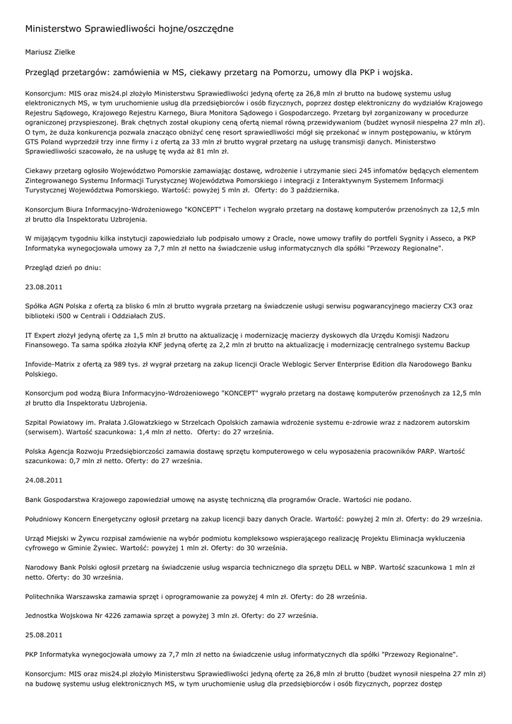 Ministerstwo Sprawiedliwości hojne/oszczędne Mariusz Zielke Przegląd przetargów: zamówienia w MS, ciekawy przetarg na Pomorzu, umowy dla PKP i wojska. Konsorcjum: MIS oraz mis24.pl złożyło Ministerstwu Sprawiedliwości jedyną ofertę za 26,8 mln zł brutto na budowę systemu usług elektronicznych MS, w tym uruchomienie usług dla przedsiębiorców i osób fizycznych, poprzez dostęp elektroniczny do wydziałów Krajowego Rejestru Sądowego, Krajowego Rejestru Karnego, Biura Monitora Sądowego i Gospodarczego. Przetarg był zorganizowany w procedurze ograniczonej przyspieszonej. Brak chętnych został okupiony ceną ofertą niemal równą przewidywaniom (budżet wynosił niespełna 27 mln zł). O tym, że duża konkurencja pozwala znacząco obniżyć cenę resort sprawiedliwości mógł się przekonać w innym postępowaniu, w którym GTS Poland wyprzedził trzy inne firmy i z ofertą za 33 mln zł brutto wygrał przetarg na usługę transmisji danych. Ministerstwo Sprawiedliwości szacowało, że na usługę tę wyda aż 81 mln zł. Ciekawy przetarg ogłosiło Województwo Pomorskie zamawiając dostawę, wdrożenie i utrzymanie sieci 245 infomatów będących elementem Zintegrowanego Systemu Informacji Turystycznej Województwa Pomorskiego i integracji z Interaktywnym Systemem Informacji Turystycznej Województwa Pomorskiego. Wartość: powyżej 5 mln zł. Oferty: do 3 października. Konsorcjum Biura Informacyjno-Wdrożeniowego "KONCEPT" i Techelon wygrało przetarg na dostawę komputerów przenośnych za 12,5 mln zł brutto dla Inspektoratu Uzbrojenia. W mijającym tygodniu kilka instytucji zapowiedziało lub podpisało umowy z Oracle, nowe umowy trafiły do portfeli Sygnity i Asseco, a PKP Informatyka wynegocjowała umowy za 7,7 mln zł netto na świadczenie usług informatycznych dla spółki "Przewozy Regionalne". Przegląd dzień po dniu: 23.08.2011 Spółka AGN Polska z ofertą za blisko 6 mln zł brutto wygrała przetarg na świadczenie usługi serwisu pogwarancyjnego macierzy CX3 oraz biblioteki i500 w Centrali i Oddziałach ZUS. IT Expert złożył jedyną ofertę za 1,5 mln zł brutto na aktualizację i modernizację macierzy dyskowych dla Urzędu Komisji Nadzoru Finansowego. Ta sama spółka złożyła KNF jedyną ofertę za 2,2 mln zł brutto na aktualizację i modernizację centralnego systemu Backup Infovide-Matrix z ofertą za 989 tys. zł wygrał przetarg na zakup licencji Oracle Weblogic Server Enterprise Edition dla Narodowego Banku Polskiego. Konsorcjum pod wodzą Biura Informacyjno-Wdrożeniowego "KONCEPT" wygrało przetarg na dostawę komputerów przenośnych za 12,5 mln zł brutto dla Inspektoratu Uzbrojenia. Szpital Powiatowy im. Prałata J.Glowatzkiego w Strzelcach Opolskich zamawia wdrożenie systemu e-zdrowie wraz z nadzorem autorskim (serwisem). Wartość szacunkowa: 1,4 mln zł netto. Oferty: do 27 września. Polska Agencja Rozwoju Przedsiębiorczości zamawia dostawę sprzętu komputerowego w celu wyposażenia pracowników PARP. Wartość szacunkowa: 0,7 mln zł netto. Oferty: do 27 września. 24.08.2011 Bank Gospodarstwa Krajowego zapowiedział umowę na asystę techniczną dla programów Oracle. Wartości nie podano. Południowy Koncern Energetyczny ogłosił przetarg na zakup licencji bazy danych Oracle. Wartość: powyżej 2 mln zł. Oferty: do 29 września. Urząd Miejski w Żywcu rozpisał zamówienie na wybór podmiotu kompleksowo wspierającego realizację Projektu Eliminacja wykluczenia cyfrowego w Gminie Żywiec. Wartość: powyżej 1 mln zł. Oferty: do 30 września. Narodowy Bank Polski ogłosił przetarg na świadczenie usług wsparcia technicznego dla sprzętu DELL w NBP. Wartość szacunkowa 1 mln zł netto. Oferty: do 30 września. Politechnika Warszawska zamawia sprzęt i oprogramowanie za powyżej 4 mln zł. Oferty: do 28 września. Jednostka Wojskowa Nr 4226 zamawia sprzęt a powyżej 3 mln zł. Oferty: do 27 września. 25.08.2011 PKP Informatyka wynegocjowała umowy za 7,7 mln zł netto na świadczenie usług informatycznych dla spółki "Przewozy Regionalne". Konsorcjum: MIS oraz mis24.pl złożyło Ministerstwu Sprawiedliwości jedyną ofertę za 26,8 mln zł brutto (budżet wynosił niespełna 27 mln zł) na budowę systemu usług elektronicznych MS, w tym uruchomienie usług dla przedsiębiorców i osób fizycznych, poprzez dostęp elektroniczny do wydziałów Krajowego Rejestru Sądowego, Krajowego Rejestru Karnego, Biura Monitora Sądowego i Gospodarczego. Przetarg był zorganizowany w procedurze ograniczonej przyspieszonej. Asseco Poland wygrało dwie części przetargu w projekcie: "e-Pacjent - Rozbudowa systemu usług elektronicznych" dla Wojewódzkiego Szpitala Specjalistycznego w Olsztynie. Wartości ofert nie podano. Esaprojekt złożył jedyną ofertę za 3 mln zł brutto na modernizację i rozbudowę systemu informatycznego w Zespole Opieki Zdrowotnej w Końskich wraz z integracją. PKP Polskie Linie Kolejowe zamawiają dostawę dodatkowych licencji SAP i Usługi Asysty Technicznej. Wartość: powyżej 2 mln zł. Oferty: do 29 września. Śląski Urząd Wojewódzki w Katowicach ogłosił przetarg na wartą szacunkowo 2,1 mln zł netto dostawę sprzętu komputerowego oraz oprogramowania dla Jednostek Administracji Zespolonej. Oferty: do 30 września. 26.08.2011 Sygnity z ofertą za niespełna 2 mln zł brutto wygrało przetarg przyspieszony ograniczony na wykonanie usług rozbudowy, wdrożenia i rozwoju aplikacji WUP-Viator rozpisany przez Centrum Rozwoju Zasobów Ludzkich. GTS Poland z ofertą za 33 mln zł brutto wygrał przetarg na usługę transmisji danych dla Ministerstwa Sprawiedliwości, które szacowało, że na usługę tę wyda aż 81 mln zł. Wpłynęły 4 oferty. Zarząd Powiatu w Olkuszu ogłosił wart 1,1 mln zł netto (szacunkowo) przetarg na budowę baz danych i informatyzację zasobów informacyjnych do zasilenia Zintegrowanego Systemu Informacji Przestrzennej dla Powiatu Olkuskiego (ZSIP_OL). Ofert
