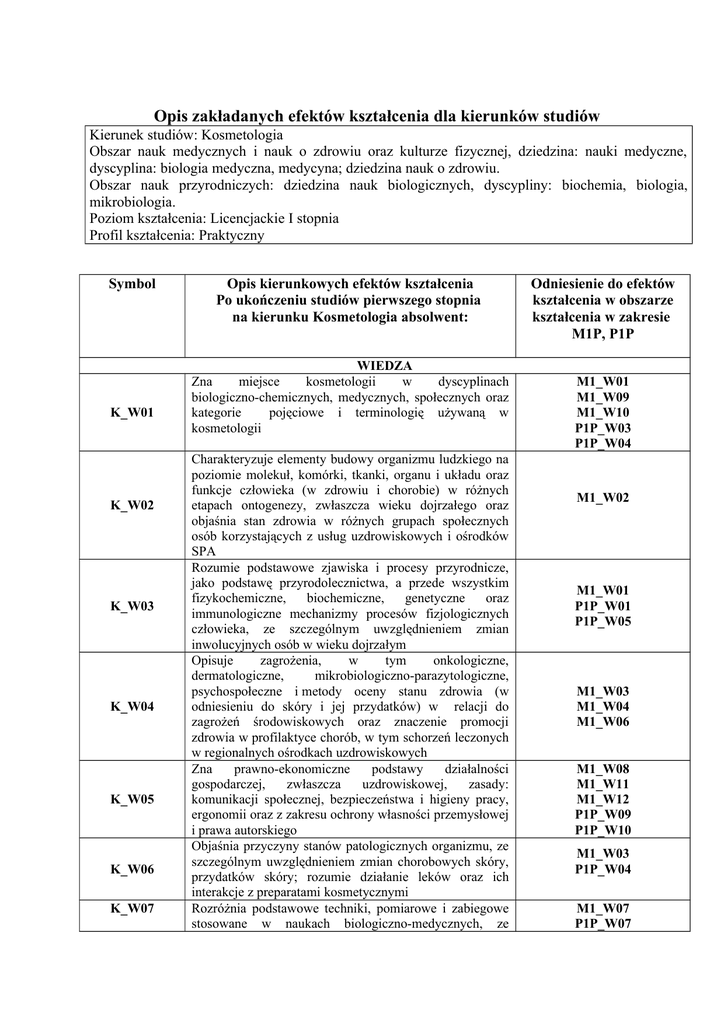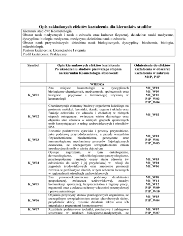 Opis zakładanych efektów kształcenia dla kierunków studiów Kierunek studiów: Kosmetologia Obszar nauk medycznych i nauk o zdrowiu oraz kulturze fizycznej, dziedzina: nauki medyczne, dyscyplina: biologia medyczna, medycyna; dziedzina nauk o zdrowiu. Obszar nauk przyrodniczych: dziedzina nauk biologicznych, dyscypliny: biochemia, biologia, mikrobiologia. Poziom kształcenia: Licencjackie I stopnia Profil kształcenia: Praktyczny Symbol K_W01 K_W02 K_W03 K_W04 K_W05 K_W06 K_W07 Opis kierunkowych efektów kształcenia Po ukończeniu studiów pierwszego stopnia na kierunku Kosmetologia absolwent: WIEDZA Zna miejsce kosmetologii w dyscyplinach biologiczno-chemicznych, medycznych, społecznych oraz kategorie pojęciowe i terminologię używaną w kosmetologii Charakteryzuje elementy budowy organizmu ludzkiego na poziomie molekuł, komórki, tkanki, organu i układu oraz funkcje człowieka (w zdrowiu i chorobie) w różnych etapach ontogenezy, zwłaszcza wieku dojrzałego oraz objaśnia stan zdrowia w różnych grupach społecznych osób korzystających z usług uzdrowiskowych i ośrodków SPA Rozumie podstawowe zjawiska i procesy przyrodnicze, jako podstawę przyrodolecznictwa, a przede wszystkim fizykochemiczne, biochemiczne, genetyczne oraz immunologiczne mechanizmy procesów fizjologicznych człowieka, ze szczególnym uwzględnieniem zmian inwolucyjnych osób w wieku dojrzałym Opisuje zagrożenia, w tym onkologiczne, dermatologiczne, mikrobiologiczno-parazytologiczne, psychospołeczne i metody oceny stanu zdrowia (w odniesieniu do skóry i jej przydatków) w relacji do zagrożeń środowiskowych oraz znaczenie promocji zdrowia w profilaktyce chorób, w tym schorzeń leczonych w regionalnych ośrodkach uzdrowiskowych Zna prawno-ekonomiczne podstawy działalności gospodarczej, zwłaszcza uzdrowiskowej, zasady: komunikacji społecznej, bezpieczeństwa i higieny pracy, ergonomii oraz z zakresu ochrony własności przemysłowej i prawa autorskiego Objaśnia przyczyny stanów patologicznych organizmu, ze szczególnym uwzględnieniem zmian chorobowych skóry, przydatków skóry; rozumie działanie leków oraz ich interakcje z preparatami kosmetycznymi Rozróżnia podstawowe techniki, pomiarowe i zabiegowe stosowane w naukach biologiczno-medycznych, ze Odniesienie do efektów kształcenia w obszarze kształcenia w zakresie M1P, P1P M1_W01 M1_W09 M1_W10 P1P_W03 P1P_W04 M1_W02 M1_W01 P1P_W01 P1P_W05 M1_W03 M1_W04 M1_W06 M1_W08 M1_W11 M1_W12 P1P_W09 P1P_W10 M1_W03 P1P_W04 M1_W07 P1P_W07 K_W08 K_W09 K_W10 K_U01 K_U02 K_U03 K_U04 K_U05 K_U06 K_U07 K_U08 K_U09 K_U10 szczególnych uwzględnieniem kosmetologii uzdrowiskowej Opisuje mechanizmy działania i skutki uboczne zabiegów stosowanych w kosmetyce, ze szczególnym uwzględnieniem zmian chorobowych w wieku dojrzałym Dostrzega wpływ nowych technologii, w tym biochemicznych, informacyjnych na ich praktyczne zastosowanie w kosmetologii, jak również znaczenie metod doświadczalnych i statystycznych Zna i rozumie zasady organizacji i zarządzania laboratorium/gabinetem kosmetycznym, zarówno w zakresie sprzedaży usług jak i dystrybucji produktów kosmetycznych, zgodnie z normami prawnymi UMIEJĘTNOŚCI Posługuje się językiem specjalistycznym oraz terminologią stosowaną w kosmetologii, promocji zdrowia, odnowy biologicznej, wellnes i spa Czyta krytycznie i ze zrozumieniem literaturę fachową w języku polskim i angielskim (na poziomie B2), wykorzystując różne źródła informacji, w tym elektroniczne do ustnych i pisemnych opracowań Charakteryzuje i diagnozuje rodzaj i stan skóry w różnych okresach rozwoju osobniczego oraz przydatków skórnych, ze szczególnym uwzględnieniem osób dojrzałych Ustala i wykonuje na podstawie rozpoznania zabiegi z zakresu kosmetologii upiększającej, pielęgnacyjnej i leczniczej oraz zabiegi fizykoterapeutyczne z uwzględnieniem wskazań i przeciwwskazań, szczególnie osób korzystających z usług medycznych w uzdrowiskach i ośrodkach SPA Planuje działalność gospodarczą stosując techniki informatyczne, statystyczne, przepisy prawne, finansowe, ekonomiczne oraz przepisy określające wymagania sanitarnohigieniczne i zdrowotne, zasady BHP i ergonomii, z uwzględnieniem specyfiki miejscowości uzdrowiskowych Stosuje podstawowe techniki obserwacyjne i pomiarowe oraz narzędzia laboratoryjne, badawcze, terapeutyczne właściwe dla laboratoriów chemiczno-kosmetologicznych Wykorzystuje informacje o nowościach i trendach rozwojowych w kosmetologii i wskazuje ewentualne obszary wymagające modyfikacji w przyszłym działaniu Ocenia jakość wykonanego zabiegu oraz przydatność typowych metod, procedur i dobrych praktyk do realizacji zadań zawodowych, ze szczególnym uwzględnieniem osób wieku dojrzałego Jest doradcą z zakresu promocji zdrowia, ze szczególnym naciskiem na kosmetologię w miejscowościach uzdrowiskowych oraz ośrodkach SPA z wykorzystaniem różnych źródeł, w tym informatycznych Samodzielnie komponuje i sporządza bezpieczne preparaty M1_W03 M1_W05 M1_W07 M1_W01 P1P_W02 P1P_W06 P1P_W08 M1_W08 M1_W09 P1P_W11 M1_U03 M1_U04 P1P_U08 M1_U12, M1_U13 M1_U14, P1P_U02, P1P_U07, P1P_U09, P1P_U10, P1P_U12 M1_U04 M1_U05 M1_U01 M1_U02 M1_U04 M1_U05 M1_U11 P1P_U01 P1P_U04 M1_U06 M1_U09 M1_U10 P1P_U05 M1_U10 M1_U02 M1_U06 M1_U08 P1P_U06 M1_U07 M1_U06 P1P_U11 M1_U05 P1P_U07 M1_U04 M1_U05 P1P_U03 P1P_U07 M1_U01 kosmetyczne K_U11 K_U12 K_K01 K_K02 Korzysta z elektronicznych technik zdobywania, przechowywania i przekazu informacji dotyczącej sprzedaży i dystrybucji usług/produktów kosmetycznych Udziela pierwszej pomocy w nagłych przypadkach KOMPETENCJE SPOŁECZNE Jest przygotowany do współpracy z lekarzami – specjalistami, prowadzenia gabinetu kosmetycznego w miejscowościach uzdrowiskowych i ośrodkach SPA oraz dystrybucji i sprzedaży usług i produktów kosmetycznych Ma świadomość poziomu swojej wiedzy i umiejętności, rozumie potrzebę ciągłego dokształcania się zawodoweg