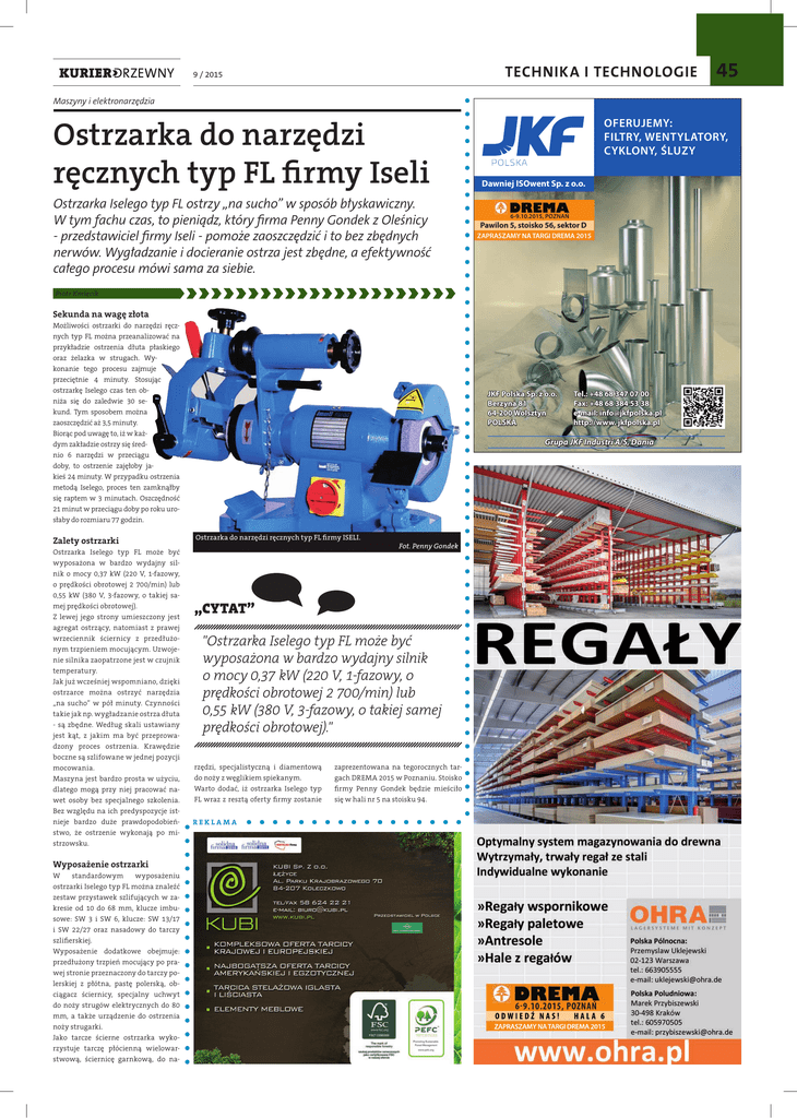TECHNIKA I TECHNOLOGIE 9 / 2015 45 Maszyny i elektronarzędzia Ostrzarka do narzędzi ręcznych typ FL firmy Iseli Ostrzarka Iselego typ FL ostrzy „na sucho” w sposób błyskawiczny. W tym fachu czas, to pieniądz, który firma Penny Gondek z Oleśnicy - przedstawiciel firmy Iseli - pomoże zaoszczędzić i to bez zbędnych nerwów. Wygładzanie i docieranie ostrza jest zbędne, a efektywność całego procesu mówi sama za siebie. OFERUJEMY: FILTRY, WENTYLATORY, CYKLONY, ŚLUZY Dawniej ISOwent Sp. z o.o. 6-9.10.2015, POZNAŃ Pawilon 5, stoisko 56, sektor D ZAPRASZAMY NA TARGI DREMA 2015 Piotr Kmiecik Sekunda na wagę złota Możliwości ostrzarki do narzędzi ręcznych typ FL można przeanalizować na przykładzie ostrzenia dłuta płaskiego oraz żelazka w strugach. Wykonanie tego procesu zajmuje przeciętnie 4 minuty. Stosując ostrzarkę Iselego czas ten obniża się do zaledwie 30 sekund. Tym sposobem można zaoszczędzić aż 3,5 minuty. Biorąc pod uwagę to, iż w każdym zakładzie ostrzy się średnio 6 narzędzi w przeciągu doby, to ostrzenie zajęłoby jakieś 24 minuty. W przypadku ostrzenia metodą Iselego, proces ten zamknąłby się raptem w 3 minutach. Oszczędność 21 minut w przeciągu doby po roku urosłaby do rozmiaru 77 godzin. Zalety ostrzarki Ostrzarka Iselego typ FL może być wyposażona w bardzo wydajny silnik o mocy 0,37 kW (220 V, 1-fazowy, o prędkości obrotowej 2 700/min) lub 0,55 kW (380 V, 3-fazowy, o takiej samej prędkości obrotowej). Z lewej jego strony umieszczony jest agregat ostrzący, natomiast z prawej wrzeciennik ściernicy z przedłużonym trzpieniem mocującym. Uzwojenie silnika zaopatrzone jest w czujnik temperatury. Jak już wcześniej wspomniano, dzięki ostrzarce można ostrzyć narzędzia „na sucho” w pół minuty. Czynności takie jak np. wygładzanie ostrza dłuta - są zbędne. Według skali ustawiany jest kąt, z jakim ma być przeprowadzony proces ostrzenia. Krawędzie boczne są szlifowane w jednej pozycji mocowania. Maszyna jest bardzo prosta w użyciu, dlatego mogą przy niej pracować nawet osoby bez specjalnego szkolenia. Bez względu na ich predyspozycje istnieje bardzo duże prawdopodobieństwo, że ostrzenie wykonają po mistrzowsku. JKF Polska Sp. z o.o. Berzyna 81 64-200 Wolsztyn POLSKA Tel.: +48 68 347 07 00 Fax: +48 68 384 53 38 e-mail: [email protected] http://www. jkfpolska.pl Grupa JKF Industri A/S, Dania Ostrzarka do narzędzi ręcznych typ FL fi rmy ISELI. Fot. Penny Gondek „CYTAT” "Ostrzarka Iselego typ FL może być wyposażona w bardzo wydajny silnik o mocy 0,37 kW (220 V, 1-fazowy, o prędkości obrotowej 2 700/min) lub 0,55 kW (380 V, 3-fazowy, o takiej samej prędkości obrotowej)." rzędzi, specjalistyczną i diamentową do noży z węglikiem spiekanym. Warto dodać, iż ostrzarka Iselego typ FL wraz z resztą oferty fi rmy zostanie zaprezentowana na tegorocznych targach DREMA 2015 w Poznaniu. Stoisko fi rmy Penny Gondek będzie mieściło się w hali nr 5 na stoisku 94. REKLAMA Wyposażenie ostrzarki W standardowym wyposażeniu ostrzarki Iselego typ FL można znaleźć zestaw przystawek szlifujących w zakresie od 10 do 68 mm, klucze imbusowe: SW 3 i SW 6, klucze: SW 13/17 i SW 22/27 oraz nasadowy do tarczy szlifierskiej. Wyposażenie dodatkowe obejmuje: przedłużony trzpień mocujący po prawej stronie przeznaczony do tarczy polerskiej z płótna, pastę polerską, obciągacz ściernicy, specjalny uchwyt do noży strugów elektrycznych do 80 mm, a także urządzenie do ostrzenia noży strugarki. Jako tarcze ścierne ostrzarka wykorzystuje tarczę płócienną wielowarstwową, ściernicę garnkową, do na- 69.10.2015, POZNAŃ ODWIEDŹ NAS! HALA 6 ZAPRASZAMY NA TARGI DREMA 2015