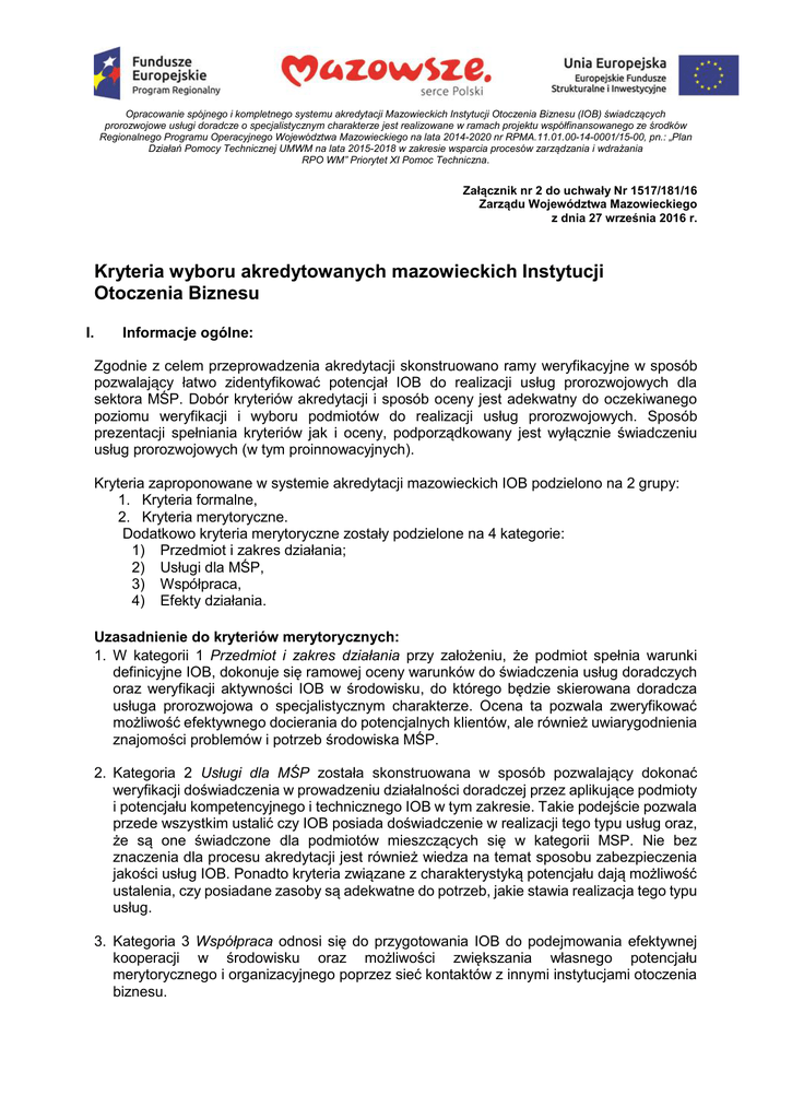 Opracowanie spójnego i kompletnego systemu akredytacji Mazowieckich Instytucji Otoczenia Biznesu (IOB) świadczących prorozwojowe usługi doradcze o specjalistycznym charakterze jest realizowane w ramach projektu współfinansowanego ze środków Regionalnego Programu Operacyjnego Województwa Mazowieckiego na lata 2014-2020 nr RPMA.11.01.00-14-0001/15-00, pn.: „Plan Działań Pomocy Technicznej UMWM na lata 2015-2018 w zakresie wsparcia procesów zarządzania i wdrażania RPO WM” Priorytet XI Pomoc Techniczna. Załącznik nr 2 do uchwały Nr 1517/181/16 Zarządu Województwa Mazowieckiego z dnia 27 września 2016 r. Kryteria wyboru akredytowanych mazowieckich Instytucji Otoczenia Biznesu I. Informacje ogólne: Zgodnie z celem przeprowadzenia akredytacji skonstruowano ramy weryfikacyjne w sposób pozwalający łatwo zidentyfikować potencjał IOB do realizacji usług prorozwojowych dla sektora MŚP. Dobór kryteriów akredytacji i sposób oceny jest adekwatny do oczekiwanego poziomu weryfikacji i wyboru podmiotów do realizacji usług prorozwojowych. Sposób prezentacji spełniania kryteriów jak i oceny, podporządkowany jest wyłącznie świadczeniu usług prorozwojowych (w tym proinnowacyjnych). Kryteria zaproponowane w systemie akredytacji mazowieckich IOB podzielono na 2 grupy: 1. Kryteria formalne, 2. Kryteria merytoryczne. Dodatkowo kryteria merytoryczne zostały podzielone na 4 kategorie: 1) Przedmiot i zakres działania; 2) Usługi dla MŚP, 3) Współpraca, 4) Efekty działania. Uzasadnienie do kryteriów merytorycznych: 1. W kategorii 1 Przedmiot i zakres działania przy założeniu, że podmiot spełnia warunki definicyjne IOB, dokonuje się ramowej oceny warunków do świadczenia usług doradczych oraz weryfikacji aktywności IOB w środowisku, do którego będzie skierowana doradcza usługa prorozwojowa o specjalistycznym charakterze. Ocena ta pozwala zweryfikować możliwość efektywnego docierania do potencjalnych klientów, ale również uwiarygodnienia znajomości problemów i potrzeb środowiska MŚP. 2. Kategoria 2 Usługi dla MŚP została skonstruowana w sposób pozwalający dokonać weryfikacji doświadczenia w prowadzeniu działalności doradczej przez aplikujące podmioty i potencjału kompetencyjnego i technicznego IOB w tym zakresie. Takie podejście pozwala przede wszystkim ustalić czy IOB posiada doświadczenie w realizacji tego typu usług oraz, że są one świadczone dla podmiotów mieszczących się w kategorii MSP. Nie bez znaczenia dla procesu akredytacji jest również wiedza na temat sposobu zabezpieczenia jakości usług IOB. Ponadto kryteria związane z charakterystyką potencjału dają możliwość ustalenia, czy posiadane zasoby są adekwatne do potrzeb, jakie stawia realizacja tego typu usług. 3. Kategoria 3 Współpraca odnosi się do przygotowania IOB do podejmowania efektywnej kooperacji w środowisku oraz możliwości zwiększania własnego potencjału merytorycznego i organizacyjnego poprzez sieć kontaktów z innymi instytucjami otoczenia biznesu. 4. Kategoria 4 Efekty działania weryfikuje efekty działania IOB oraz sposób ich monitorowania. Biorąc pod uwagę fakt, że usługi prorozwojowe wymagają zarówno potencjału merytorycznego jak i doświadczenia w ich realizacji kryterium efektywności w tym obszarze wydaje się jak najbardziej zasadne. Stosunkowo wysoki proponowany wskaźnik usług doradczych w strukturze aktywności IOB ma na celu wskazanie tych instytucji, które mają największy potencjał do efektywnej realizacji usług prorozwojowych. II. Kryteria formalne: Lp. Nazwa Kryterium Sposób oceny 1. Złożenie wniosku przez osobę prawną zarządzającą IOB 2. Kompletność, poprawność i zgodność z wymogami akredytacji złożonego wniosku i wymaganych załączników Podpisanie wniosku przez osoby uprawnione do reprezentowania Wnioskodawcy Porównanie aktualnego wyciągu z KRS i dokumentów założycielskich ośrodka Porównanie z listą dokumentów ogłoszoną na stronie www UM WM 3. 4. Zgodność zasad działania ośrodka z definicją IOB 5. IOB spełniające warunki definicji posiadające od co najmniej 12 miesięcy (licząc wstecz od dnia złożenia wniosku o akredytację) zarejestrowaną formalnie siedzibę, oddział lub filię w województwie mazowieckim Porównanie wyciągu z KRS lub innych aktualnych dokumentów potwierdzających uprawnienie do podpisania wniosku Porównanie złożonych dokumentów pod kątem spełniania kryteriów definicji IOB Analiza przedstawionych dokumentów potwierdzając funkcjonowanie filii/oddziału na terenie regionu mazowieckiego. 2 Ocena tak/nie III. Lp. 1. Definicja Podstawa Kryterium oceny1 Przedmiot i zakres działania 1.1. Cele i zakres działania ośrodka Zgodność z profilem 1.2 Klienci IOB, struktura % klientów ośrodka 1. Pomysłodawcó w i start-upy, 2. Firmy rozwijające się, 3. Pozostali klienci Zgodność z charakterystyką grupy docelowej określonej dla wskazanego przez IOB profilu 2. 1 Kryteria merytoryczne: Udokumentowanie Sposób oceny Ocena pkt. Maks. 3 Dokumenty założycielskie: pierwszy, ustanawiający działanie formalny dokument określający jego zakres i sposób działania. Dla spółek kapitałowych będzie to pierwszy akt notarialny, dla jednostek organizacyjnych JST, uczelni, izb, związków uchwała ustanawiająca ośrodek wraz z pierwszym regulaminem lub innym dokumentem opisującym zasady działania. Oświadczenie osób uprawnionych o niedziałaniu dla zysku lub przeznaczaniu zysku na cele statutowe zgodnie z zapisami w statucie lub innym równoważnym dokumencie dotyczącym IOB w ciągu ostatnich 12 miesięcy przed dniem złożenia wniosku o akredytację. Opis sporządzony przez IOB w oparciu o jego statystyki za ostatnie 3 lata. W dokumentach na wypadek kontroli powinny się znaleźć materiały źródłowe do wykazanych analiz. Analiza dokumentów, porównanie z profilem w obszarze celu działania zgodnego z definicją IOB (przede wszystki