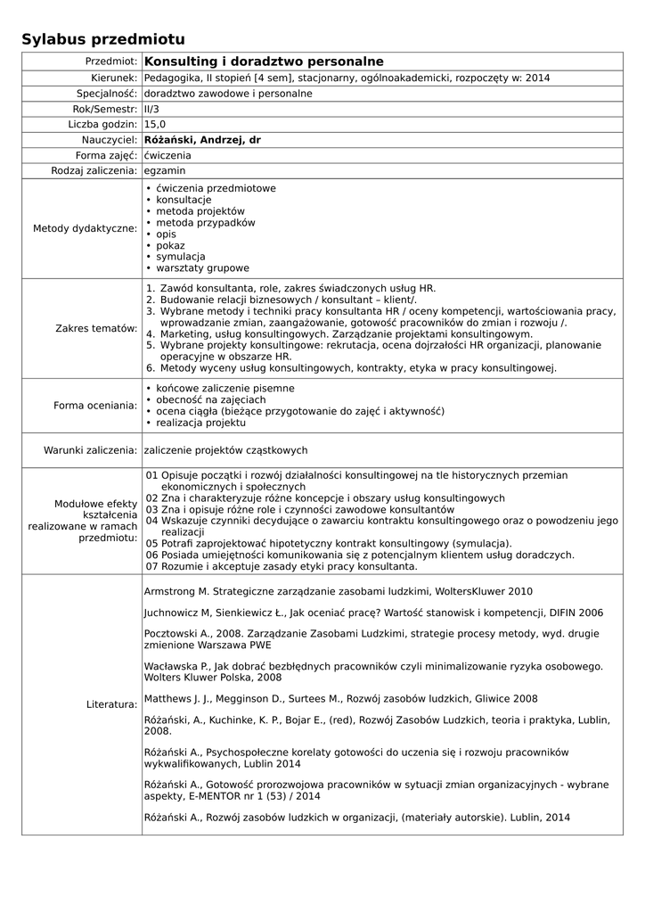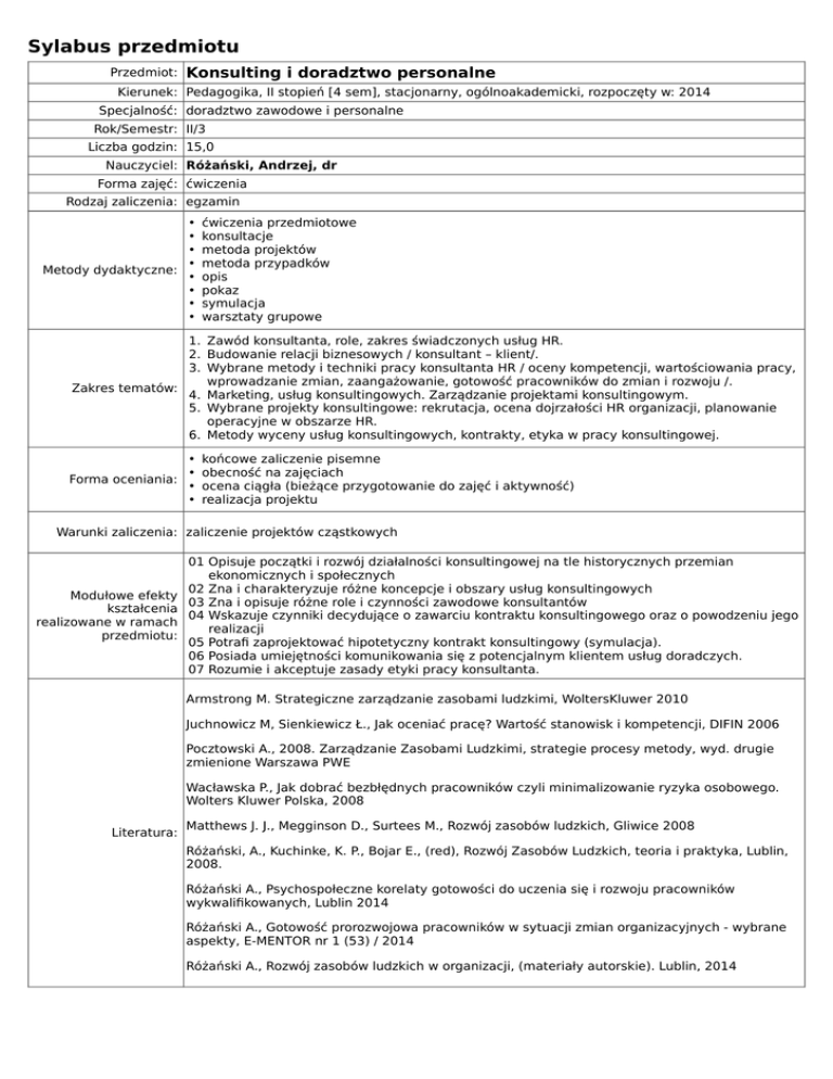 Sylabus przedmiotu Przedmiot: Konsulting i doradztwo personalne Kierunek: Pedagogika, II stopień [4 sem], stacjonarny, ogólnoakademicki, rozpoczęty w: 2014 Specjalność: doradztwo zawodowe i personalne Rok/Semestr: II/3 Liczba godzin: 15,0 Nauczyciel: Różański, Andrzej, dr Forma zajęć: ćwiczenia Rodzaj zaliczenia: egzamin • • • • Metody dydaktyczne: • • • • ćwiczenia przedmiotowe konsultacje metoda projektów metoda przypadków opis pokaz symulacja warsztaty grupowe 1. Zawód konsultanta, role, zakres świadczonych usług HR. 2. Budowanie relacji biznesowych / konsultant – klient/. 3. Wybrane metody i techniki pracy konsultanta HR / oceny kompetencji, wartościowania pracy, wprowadzanie zmian, zaangażowanie, gotowość pracowników do zmian i rozwoju /. Zakres tematów: 4. Marketing, usług konsultingowych. Zarządzanie projektami konsultingowym. 5. Wybrane projekty konsultingowe: rekrutacja, ocena dojrzałości HR organizacji, planowanie operacyjne w obszarze HR. 6. Metody wyceny usług konsultingowych, kontrakty, etyka w pracy konsultingowej. • • Forma oceniania: • • końcowe zaliczenie pisemne obecność na zajęciach ocena ciągła (bieżące przygotowanie do zajęć i aktywność) realizacja projektu Warunki zaliczenia: zaliczenie projektów cząstkowych Modułowe efekty kształcenia realizowane w ramach przedmiotu: 01 Opisuje początki i rozwój działalności konsultingowej na tle historycznych przemian ekonomicznych i społecznych 02 Zna i charakteryzuje różne koncepcje i obszary usług konsultingowych 03 Zna i opisuje różne role i czynności zawodowe konsultantów 04 Wskazuje czynniki decydujące o zawarciu kontraktu konsultingowego oraz o powodzeniu jego realizacji 05 Potrafi zaprojektować hipotetyczny kontrakt konsultingowy (symulacja). 06 Posiada umiejętności komunikowania się z potencjalnym klientem usług doradczych. 07 Rozumie i akceptuje zasady etyki pracy konsultanta. Armstrong M. Strategiczne zarządzanie zasobami ludzkimi, WoltersKluwer 2010 Juchnowicz M, Sienkiewicz Ł., Jak oceniać pracę? Wartość stanowisk i kompetencji, DIFIN 2006 Pocztowski A., 2008. Zarządzanie Zasobami Ludzkimi, strategie procesy metody, wyd. drugie zmienione Warszawa PWE Wacławska P., Jak dobrać bezbłędnych pracowników czyli minimalizowanie ryzyka osobowego. Wolters Kluwer Polska, 2008 Literatura: Matthews J. J., Megginson D., Surtees M., Rozwój zasobów ludzkich, Gliwice 2008 Różański, A., Kuchinke, K. P., Bojar E., (red), Rozwój Zasobów Ludzkich, teoria i praktyka, Lublin, 2008. Różański A., Psychospołeczne korelaty gotowości do uczenia się i rozwoju pracowników wykwalifikowanych, Lublin 2014 Różański A., Gotowość prorozwojowa pracowników w sytuacji zmian organizacyjnych - wybrane aspekty, E-MENTOR nr 1 (53) / 2014 Różański A., Rozwój zasobów ludzkich w organizacji, (materiały autorskie). Lublin, 2014