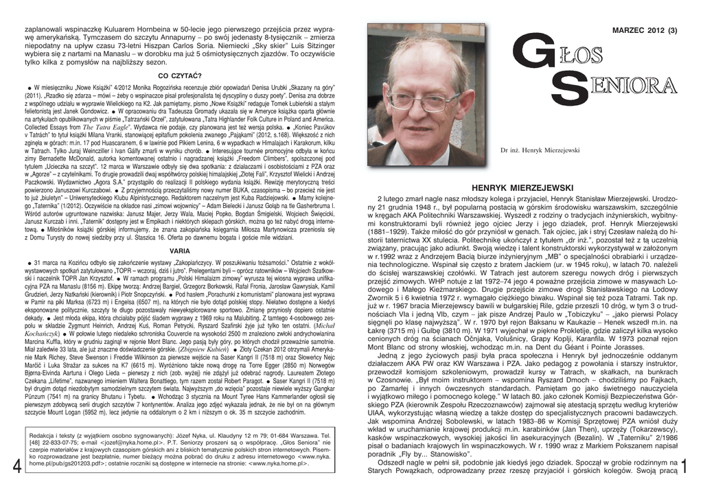zaplanowali wspinaczkę Kuluarem Hornbeina w 50-lecie jego pierwszego przejścia przez wyprawę amerykańską. Tymczasem do szczytu Annapurny – po swój jedenasty 8-tysięcznik – zmierza niepodatny na upływ czasu 73-letni Hiszpan Carlos Soria. Niemiecki „Sky skier” Luis Sitzinger wybiera się z nartami na Manaslu – w dorobku ma już 5 ośmiotysięcznych zjazdów. To oczywiście tylko kilka z pomysłów na najbliższy sezon. MARZEC 2012 (3) CO CZYTAĆ? W miesiêczniku „Nowe Ksi¹¿ki” 4/2012 Monika Rogoziñska recenzuje zbiór opowiadañ Denisa Urubki „Skazany na góry” (2011). „Rzadko siê zdarza – mówi – ¿eby o wspinaczce pisa³ profesjonalista tej dyscypliny o duszy poety”. Denisa zna dobrze z wspólnego udzia³u w wyprawie Wielickiego na K2. Jak pamiêtamy, pismo „Nowe Ksi¹¿ki” redaguje Tomek £ubieñski a sta³ym felietonist¹ jest Janek Gondowicz. ● W opracowaniu dra Tadeusza Gromady ukaza³a siê w Ameryce ksi¹¿ka oparta g³ównie na artyku³ach opublikowanych w piœmie „Tatrzañski Orze³”, zatytu³owana „Tatra Highlander Folk Culture in Poland and America. Collected Essays from The Tatra Eagle”. Wydawca nie podaje, czy planowana jest te¿ wersja polska. ● „Koniec Pavúkov v Tatrách” to tytu³ ksi¹¿ki Milana Vranki, stanowi¹cej epitafium pokolenia zwanego „Paj¹kami” (2012, s.168). Wiêkszoœæ z nich zginê³a w górach: m.in. 17 pod Huascaranem, 6 w lawinie pod Pikiem Lenina, 6 w wypadkach w Himalajach i Karakorum, kilku w Tatrach. Tylko Juraj Weincziller i Ivan Gálfy zmarli w wyniku chorób. ● Interesuj¹ce tournée promocyjne odby³a w koñcu zimy Bernadette McDonald, autorka komentowanej ostatnio i nagradzanej ksi¹¿ki „Freedom Climbers”, spolszczonej pod tytu³em „Ucieczka na szczyt”. 12 marca w Warszawie odby³y siê dwa spotkania: z dzia³aczami i osobistoœciami z PZA oraz w „Agorze” – z czytelnikami. To drugie prowadzili dwaj wspó³twórcy polskiej himalajskiej „Z³otej Fali”, Krzysztof Wielicki i Andrzej Paczkowski. Wydawnictwo „Agora S.A.” przyst¹pi³o do realizacji II polskiego wydania ksi¹¿ki. Rewizjê merytoryczn¹ treœci powierzono Januszowi Kurczabowi. ● Z przyjemnoœci¹ przeczytaliœmy nowy numer BUKA, czasopisma – bo przecie¿ nie jest to ju¿ „biuletyn” – Uniwersyteckiego Klubu Alpinistycznego. Redaktorem naczelnym jest Kuba Radziejowski. ● Mamy kolejnego „Taternika” (1/2012). Oczywiœcie na ok³adce nasi „zimowi wojownicy” – Adam Bielecki i Janusz Go³¹b na tle Gasherbruma I. Wœród autorów ugruntowane nazwiska: Janusz Majer, Jerzy Wala, Maciej Popko, Bogdan Œmigielski, Wojciech Œwiêcicki, Janusz Kurczab i inni. „Taternik” dostêpny jest w Empikach i niektórych sklepach górskich, mo¿na go te¿ nabyæ drog¹ internetow¹. ● Mi³oœników ksi¹¿ki górskiej informujemy, ¿e znana zakopiañska ksiêgarnia Mi³osza Martynowicza przenios³a siê z Domu Turysty do nowej siedziby przy ul. Staszica 16. Oferta po dawnemu bogata i goœcie mile widziani. ● VARIA ● 31 marca na Koziñcu odby³o siê zakoñczenie wystawy „Zakopiañczycy. W poszukiwaniu to¿samoœci.” Ostatnie z wokó³wystawowych spotkañ zatytu³owano „TOPR – wczoraj, dziœ i jutro”. Prelegentami byli – oprócz ratowników – Wojciech Szatkowski i naczelnik TOPR Jan Krzysztof. ● W ramach programu „Polski Himalaizm zimowy” wyrusza tej wiosna wyprawa unifikacyjna PZA na Manaslu (8156 m). Ekipê tworz¹: Andrzej Bargiel, Grzegorz Borkowski, Rafa³ Fronia, Jaros³aw Gawrysiak, Kamil Grudzieñ, Jerzy Natkañski (kierownik) i Piotr Snopczyñski. ● Pod has³em „Porachunki z komunistami” planowana jest wyprawa w Pamir na piki Marksa (6723 m) i Engelsa (6507 m), na których nie by³o dot¹d polskiej stopy. Nie³atwo dostêpne a kiedyœ eksponowane politycznie, szczyty te d³ugo pozostawa³y niewyeksplorowane sportowo. Zmianê przynios³y dopiero ostatnie dekady. ● Jest m³oda ekipa, która chcia³aby pójœæ œladem wyprawy z 1969 roku na Malubiting. Z tamtego 4-osobowego zespo³u w sk³adzie Zygmunt Heinrich, Andrzej Kuœ, Roman Petrycki, Ryszard Szafirski ¿yje ju¿ tylko ten ostatni. (Michał Kochańczyk) ● W po³owie lutego niedaleko schroniska Couvercle na wysokoœci 2500 m znaleziono zw³oki andrychowianina Marcina Kuffla, który w grudniu zagin¹³ w rejonie Mont Blanc. Jego pasj¹ by³y góry, po których chodzi³ przewa¿nie samotnie. Mia³ zaledwie 33 lata, ale ju¿ znaczne doœwiadczenie górskie. (Zbigniew Kubień) ● Z³oty Czekan 2012 otrzymali Amerykanie Mark Richey, Steve Swenson i Freddie Wilkinson za pierwsze wejœcie na Saser Kangri II (7518 m) oraz S³oweñcy Nejc Marèiè i Luka Stražar za sukces na K7 (6615 m). Wyró¿niono tak¿e now¹ drogê na Torre Egger (2850 m) Norwegów Bjo/rna-Eivinda Aartuna i Olego Lieda – pierwszy z nich (zob. wy¿ej) nie zd¹¿y³ ju¿ odebraæ nagrody. Laureatem Z³otego Czekana „Lifetime”, nazwanego imieniem Waltera Bonattiego, tym razem zosta³ Robert Paragot. ● Saser Kangri II (7518 m) by³ drugim dot¹d niezdobytym samodzielnym szczytem œwiata. Najwy¿szym „do wziêcia” pozostaje niewiele wy¿szy Gangkar Pünzum (7541 m) na granicy Bhutanu i Tybetu. ● Wchodz¹c 3 stycznia na Mount Tyree Hans Kammerlander og³osi³ siê pierwszym zdobywc¹ serii drugich szczytów 7 kontynentów. Analiza jego zdjêæ wykaza³a jednak, ¿e nie by³ on na g³ównym szczycie Mount Logan (5952 m), lecz jedynie na oddalonym o 2 km i ni¿szym o ok. 35 m szczycie zachodnim. 4 Redakcja i teksty (z wyjątkiem osobno sygnowanych): Józef Nyka, ul. Klaudyny 12 m 79; 01-684 Warszawa. Tel. [48] 22-833-07-75; e-mail <[email protected]>. P.T. Seniorzy proszeni są o współpracę. „Głos Seniora” nie czerpie materiałów z krajowych czasopism górskich ani z bliskich tematycznie polskich stron internetowych. Pisemko rozprowadzane jest bezpłatnie, numer bieżący można pobrać do druku z adresu internetowego <