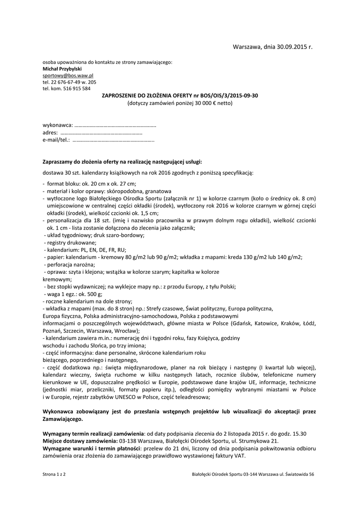 Warszawa, dnia 30.09.2015 r. osoba upoważniona do kontaktu ze strony zamawiającego: Michał Przybylski [email protected] tel. 22 676-67-49 w. 205 tel. kom. 516 915 584 ZAPROSZENIE DO ZŁOŻENIA OFERTY nr BOS/OIS/3/2015-09-30 (dotyczy zamówień poniżej 30 000 € netto) wykonawca: ………………………………………………….. adres: ………………………………………………….. e-mail/tel.: ………………………………………………….. Zapraszamy do złożenia oferty na realizację następującej usługi: dostawa 30 szt. kalendarzy książkowych na rok 2016 zgodnych z poniższą specyfikacją: - format bloku: ok. 20 cm x ok. 27 cm; materiał i kolor oprawy: skóropodobna, granatowa wytłoczone logo Białołęckiego Ośrodka Sportu (załącznik nr 1) w kolorze czarnym (koło o średnicy ok. 8 cm) umiejscowione w centralnej części okładki (środek), wytłoczony rok 2016 w kolorze czarnym w górnej części okładki (środek), wielkość czcionki ok. 1,5 cm; personalizacja dla 18 szt. (imię i nazwisko pracownika w prawym dolnym rogu okładki), wielkość czcionki ok. 1 cm - lista zostanie dołączona do zlecenia jako załącznik; - układ tygodniowy; druk szaro-bordowy; - registry drukowane; - kalendarium: PL, EN, DE, FR, RU; - papier: kalendarium - kremowy 80 g/m2 lub 90 g/m2; wkładka z mapami: kreda 130 g/m2 lub 140 g/m2; - perforacja narożna; - oprawa: szyta i klejona; wstążka w kolorze szarym; kapitałka w kolorze kremowym; - bez stopki wydawniczej; na wyklejce mapy np.: z przodu Europy, z tyłu Polski; - waga 1 egz.: ok. 500 g; - roczne kalendarium na dole strony; - wkładka z mapami (max. do 8 stron) np.: Strefy czasowe, Świat polityczny, Europa polityczna, Europa fizyczna, Polska administracyjno-samochodowa, Polska z podstawowymi informacjami o poszczególnych województwach, główne miasta w Polsce (Gdańsk, Katowice, Kraków, Łódź, Poznań, Szczecin, Warszawa, Wrocław); - kalendarium zawiera m.in.: numerację dni i tygodni roku, fazy Księżyca, godziny wschodu i zachodu Słońca, po trzy imiona; - część informacyjna: dane personalne, skrócone kalendarium roku bieżącego, poprzedniego i następnego, - część dodatkowa np.: święta międzynarodowe, planer na rok bieżący i następny (I kwartał lub więcej), kalendarz wieczny, święta ruchome w kilku następnych latach, rocznice ślubów, telefoniczne numery kierunkowe w UE, dopuszczalne prędkości w Europie, podstawowe dane krajów UE, informacje, techniczne (jednostki miar, przeliczniki, formaty papieru itp.), odległości pomiędzy wybranymi miastami w Polsce i w Europie, rejestr zabytków UNESCO w Polsce, część teleadresowa; Wykonawca zobowiązany jest do przesłania wstępnych projektów lub wizualizacji do akceptacji przez Zamawiającego. Wymagany termin realizacji zamówienia: od daty podpisania zlecenia do 2 listopada 2015 r. do godz. 15.30 Miejsce dostawy zamówienia: 03-138 Warszawa, Białołęcki Ośrodek Sportu, ul. Strumykowa 21. Wymagane warunki i termin płatności: przelew do 21 dni, liczony od dnia podpisania pokwitowania odbioru zamówienia oraz złożenia do zamawiającego prawidłowo wystawionej faktury VAT. Strona 1 z 2 Białołęcki Ośrodek Sportu 03-144 Warszawa ul. Światowida 56 Forma składanych dokumentów: wykonawca składa ofertę na załączonym formularzu oferty*. Ofertę należy złożyć: pocztą elektroniczną (skan formularza oferty) na adres e-mail: [email protected] wraz z wstępnymi projektami lub wizualizacjami. Ofertę należy złożyć do piątku, 9 października 2015 r. do godziny 16:00. Kryterium wyboru: cena 100%. W przypadku pytań prosimy o kontakt tel. lub e-mail jw. Oferty należy składać w kwotach brutto w złotych polskich. Zamawiający przewiduje możliwość negocjacji ceny. Z wykonawcą, którego oferta zostanie przyjęta zamawiający podpisze umowę/zlecenie**, termin podpisania umowy / zlecenia zostanie uzgodniony z wykonawcą telefonicznie. Wykonawca zobowiązany jest do podpisania umowy / zlecenia** na warunkach określonych w dołączonym wzorze umowy / zlecenia**. Złożenie oferty do BOS nie jest jednoznaczne z udzieleniem przez BOS zamówienia. Zamawiający zastrzega sobie prawo do rezygnacji z realizacji zamówienia w każdym momencie przed zawarciem umowy lub zlecenia. załączniki: 1. *wzór formularza oferty 2. **wzór zlecenia Strona 2 z 2 Białołęcki Ośrodek Sportu 03-144 Warszawa ul. Światowida 56